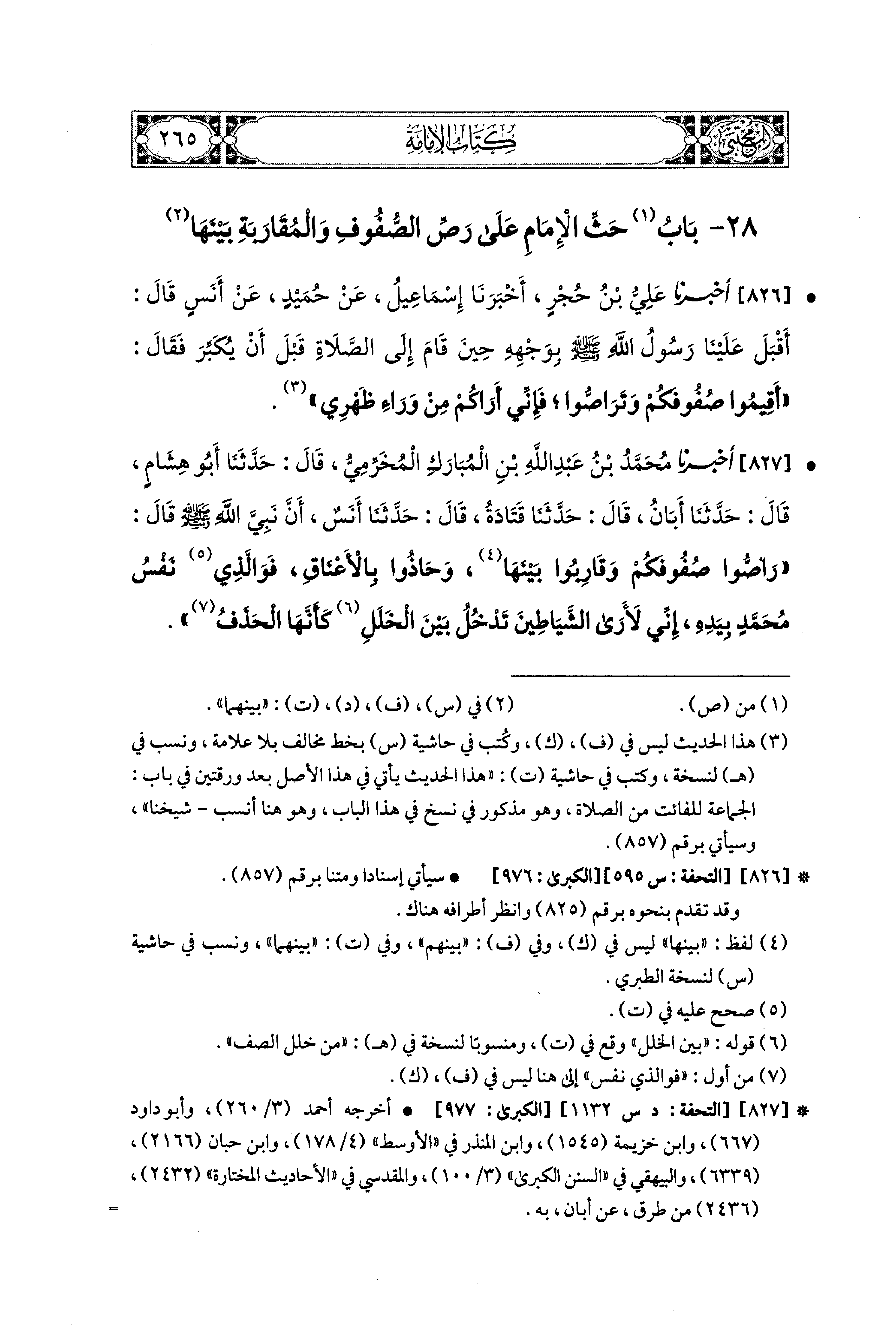 827- أَخبَرنا مُحَمد بنُ عَبدِ اللهِ بْنِ المُبَارَكِ المُخَرِّمِيُّ، قال: حَدثنا أَبو هِشَامٍ، قال: حَدثنا أَبَانُ، قال: حَدثنا قَتَادَةُ، قال: حَدثنا أَنَسٌ، أَنَّ نَبِيَّ اللهِ صَلى الله عَليه وسَلم قَالَ: رَاصُّوا صُفُوفَكُمْ وَقَارِبُوا بَيْنَهَا، وَحَاذُوا بِالأَعْنَاقِ، فَوَالَّذِي نَفْسُ مُحَمدٍ بِيَدِهِ إِنِّي لأَرَى الشَّيَاطِينَ تَدْخُلُ بين الخَلَلِ كَأَنَّهَا الحَذَفُ.