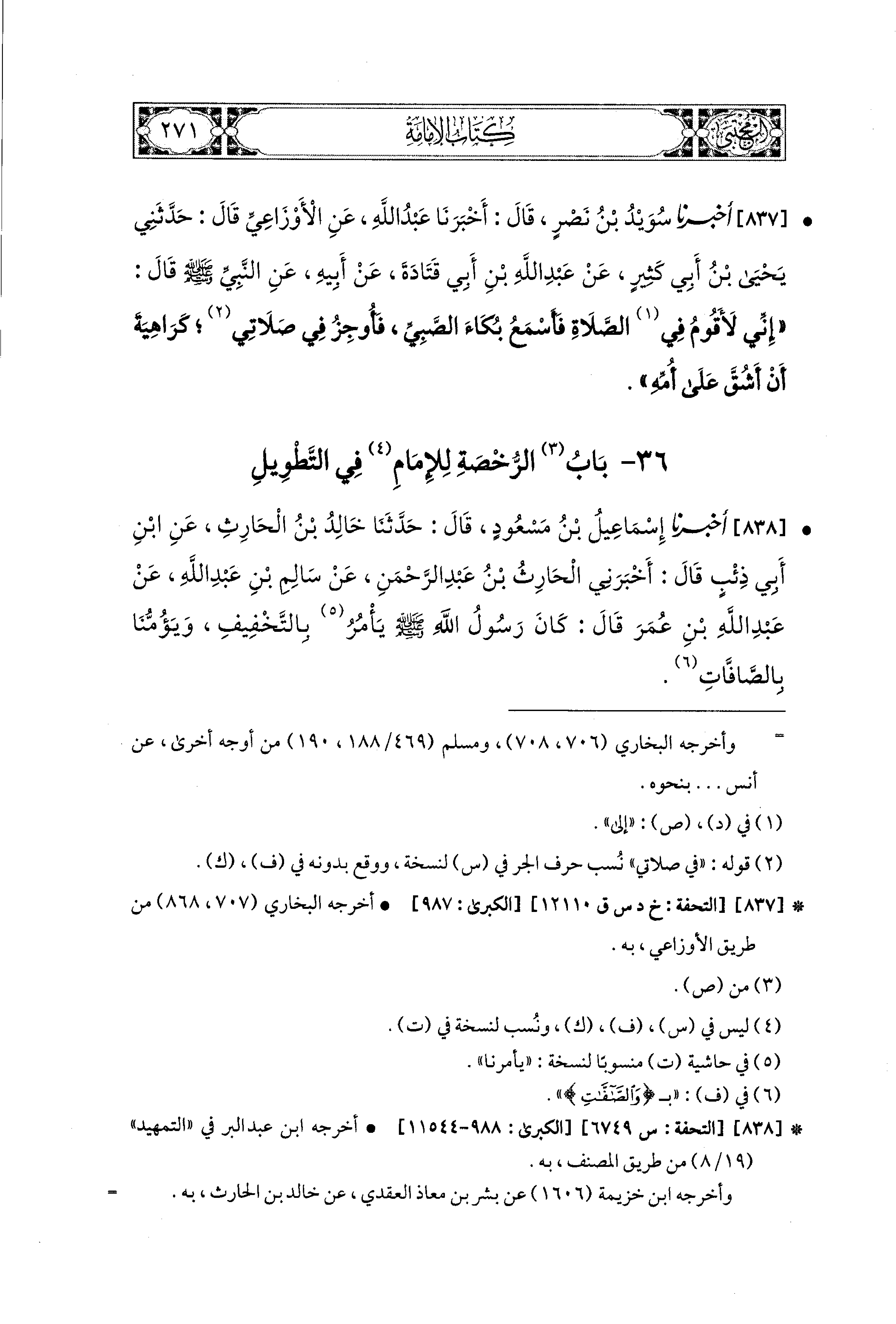 837- أَخبَرنا سُوَيْدُ بنُ نَصْرٍ، قال: أَخبَرَنا عَبدُ اللهِ، عَنِ الأَوْزَاعِيِّ، قَالَ: حَدَّثَني يَحيَى بنُ أَبي كَثِيرٍ، عَن عَبد اللهِ بن أَبي قَتَادَةَ، عَن أَبيهِ، عَنِ النَّبيِّ صَلى الله عَليه وسَلم قَالَ: إِنِّي لأَقُومُ فِي الصَّلاَةِ فَأَسْمَعُ بُكَاءَ الصَّبِيِّ فَأُوجِزُ فِي صَلاَتِي كَرَاهِيَةَ أَنْ أَشُقَّ عَلَى أُمِّهِ.