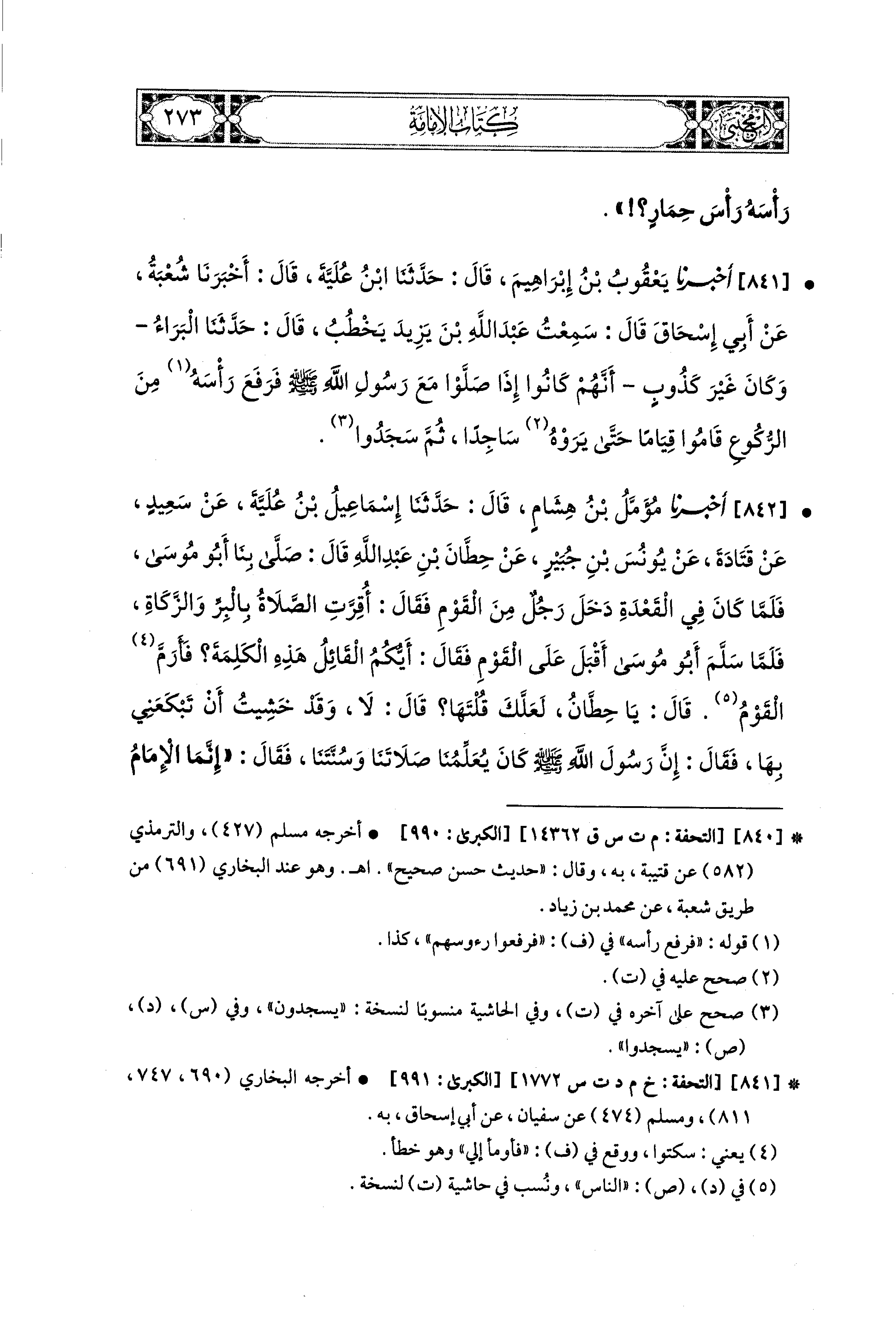 841- أَخبَرنا يَعقُوبُ بنُ إِبراهِيمَ، قال: حَدثنا ابنُ عُلَيَّةَ، قَالَ: أَخبَرنا شُعبَةُ، عَن أَبي إِسحَاقَ، قَالَ: سَمِعْتُ عَبدَ اللهِ بْنَ يَزِيدَ يَخْطُبُ، قال: حَدثنا البَرَاءُ وَكَانَ غَيْرَ كَذُوبٍ؛ أَنَّهُمْ كَانُوا إِذَا صَلَّوْا مَعَ رَسُولِ اللهِ صَلى الله عَليه وسَلم فَرَفَعَ رَأْسَهُ مِنَ الرُّكُوعِ قَامُوا قِيَامًا حَتَّى يَرَوْهُ سَاجِدًا، ثُمَّ سَجَدُوا.