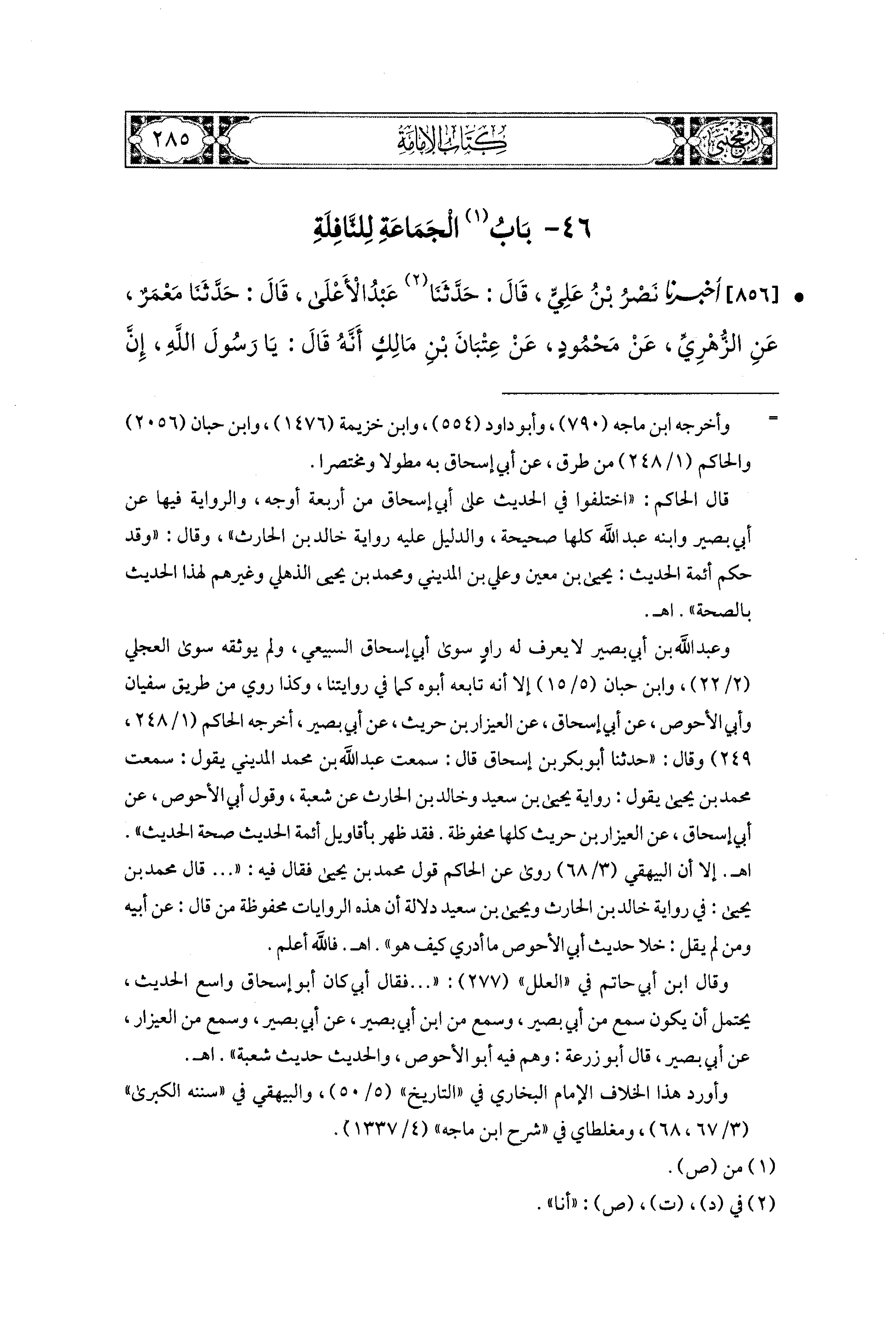 856- أَخبَرنا نَصْرُ بنُ عَلِيٍّ، قَالَ: حَدثنا عَبدُ الأَعْلَى، قال: حَدثنا مَعْمَرٌ، عَنِ الزُّهْرِيِّ، عَن مَحْمُودٍ، عَن عِتْبَانَ بْنِ مَالِكٍ أَنَّهُ قَالَ: يَا رَسُولَ اللهِ، إِنَّ السُّيُولَ لَتَحُولُ بَيْني وَبَيْنَ مَسْجِدِ قَوْمِي فَأُحِبُّ أَنْ تَأْتِيَني فَتُصَلِّيَ فِي مَكَانٍ مِنْ بَيْتِي أَتَّخِذُهُ مَسْجِدًا، فَقَالَ رَسُولُ اللهِ صَلى الله عَليه وسَلم: سَنَفْعَلُ، فَلَمَّا دَخَلَ رَسُولُ اللهِ صَلى الله عَليه وسَلم قَالَ: أَيْنَ تُرِيدُ؟ فَأَشَرْتُ له إِلَى نَاحِيَةٍ مِنَ البَيْتِ، فَقَامَ رَسُولُ اللهِ صَلى الله عَليه وسَلم فَصَفَفْنَا خَلْفَهُ فَصَلَّى بِنَا رَكْعَتَيْنِ.