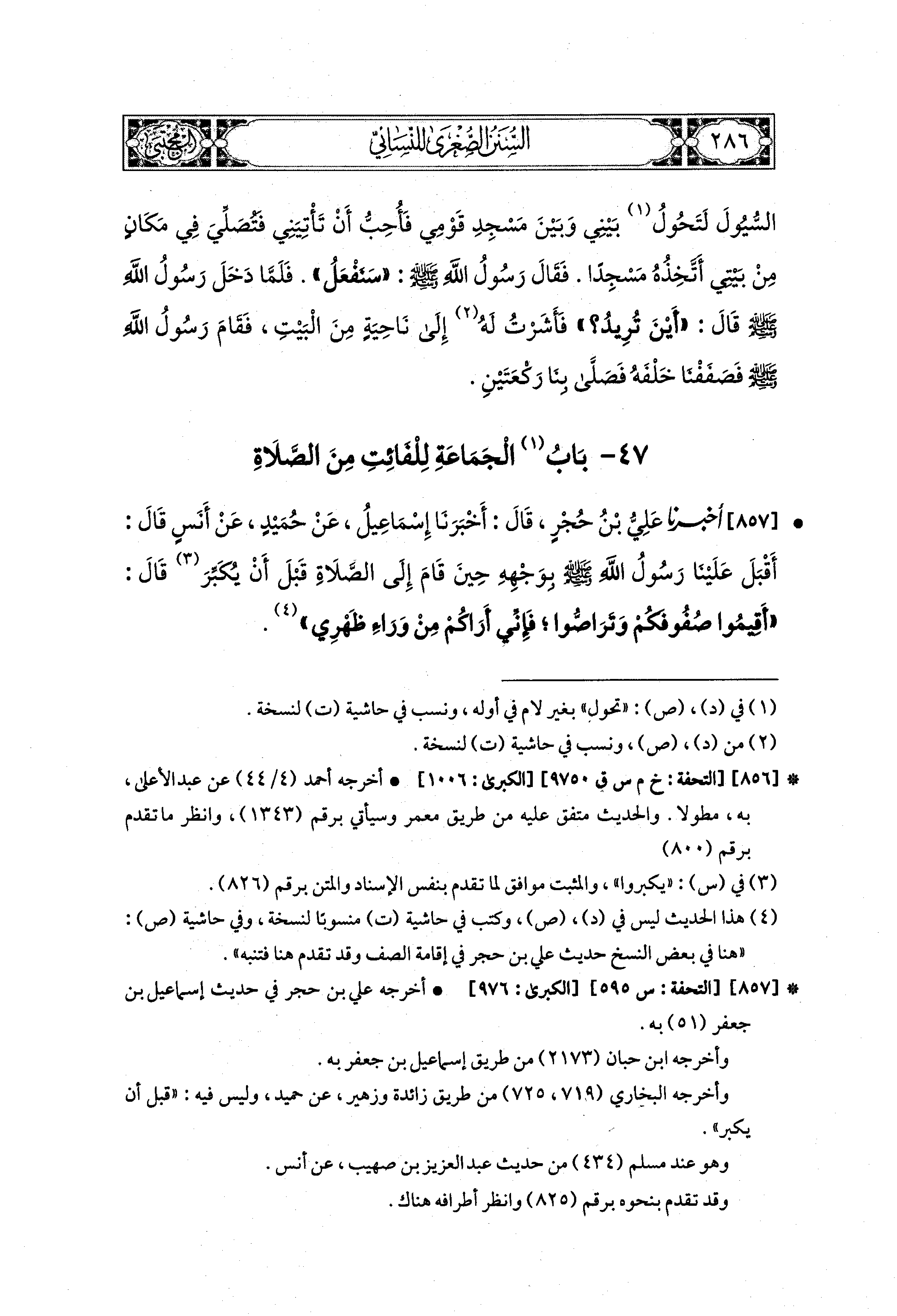 857- أَخبَرنا عَلِيُّ بنُ حُجْرٍ، قَالَ: أَخبَرنا إِسماعِيلُ، عَن حُمَيدٍ، عَن أَنَسٍ قَالَ: أَقْبَلَ عَلَيْنَا رَسُولُ اللهِ صَلى الله عَليه وسَلم بِوَجْهِهِ حِينَ قَامَ إِلَى الصَّلاَةِ قَبْلَ أَنْ يُكَبِّرَ، قَالَ: أَقِيمُوا صُفُوفَكُمْ وَتَرَاصُّوا؛ فَإِنِّي أَرَاكُمْ مِنْ وَرَاءِ ظَهْرِي.
