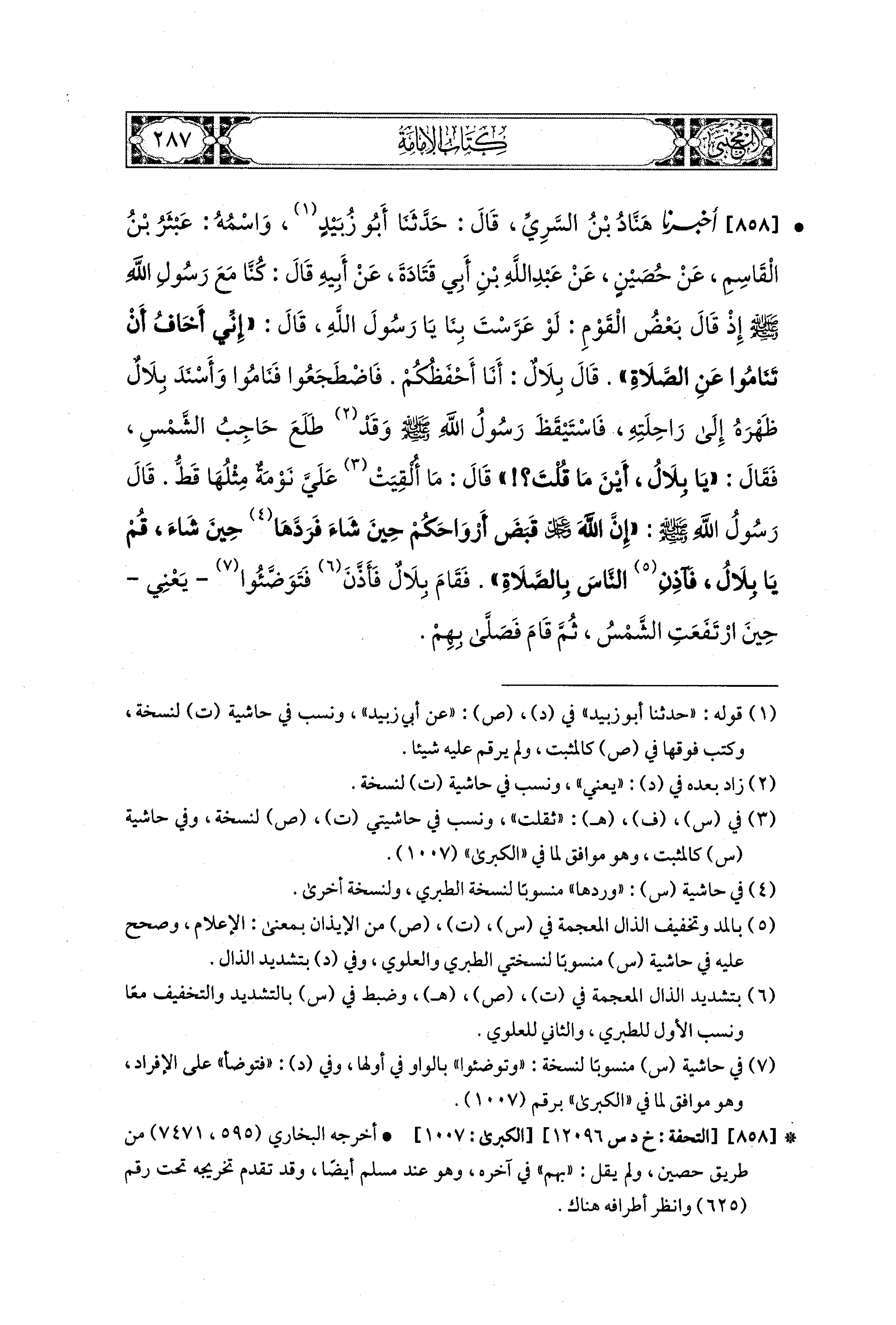 858- أَخبَرنا هَنَّادُ بنُ السَّرِيِّ، قال: حَدثنا أَبو زُبَيْدٍ، وَاسْمُهُ عَبْثَرُ بنُ القَاسِمِ، عَن حُصَيْنٍ، عَن عَبد اللهِ بن أَبي قَتَادَةَ، عَن أَبيهِ، قَالَ: كُنَّا مَعَ رَسُولِ اللهِ صَلى الله عَليه وسَلم إِذْ قَالَ بَعْضُ القَوْمِ: لَوْ عَرَّسْتَ بِنَا يَا رَسُولَ اللهِ، قَالَ: إِنِّي أَخَافُ أَنْ تَنَامُوا عَنِ الصَّلاَةِ، قَالَ بِلاَلٌ: أَنَا أَحْفَظُكُمْ، فَاضْطَجَعُوا فَنَامُوا وَأَسْنَدَ بِلاَلٌ ظَهْرَهُ إِلَى رَاحِلَتِهِ، فَاسْتَيْقَظَ رَسُولُ اللهِ صَلى الله عَليه وسَلم وَقَدْ طَلَعَ حَاجِبُ الشَّمْسِ، فَقَالَ: يَا بِلاَلُ أَيْنَ مَا قُلْتَ؟ قَالَ: مَا أُلْقِيَتْ عَلَيَّ نَوْمَةٌ مِثْلُهَا قَطُّ، قَالَ رَسُولُ اللهِ صَلى الله عَليه وسَلم: إِنَّ اللهَ عَزَّ وَجَلَّ قَبَضَ أَرْوَاحَكُمْ حِينَ شَاءَ، فَرَدَّهَا حِينَ شَاءَ، قُمْ يَا بِلاَلُ فَآذِنِ النَّاسَ بِالصَّلاَةِ، فَقَامَ بِلاَلٌ فَأَذَّنَ فَتَوَضَّئوا، يَعْني حِينَ ارْتَفَعَتِ الشَّمْسُ، ثُمَّ قَامَ فَصَلَّى بِهِمْ.