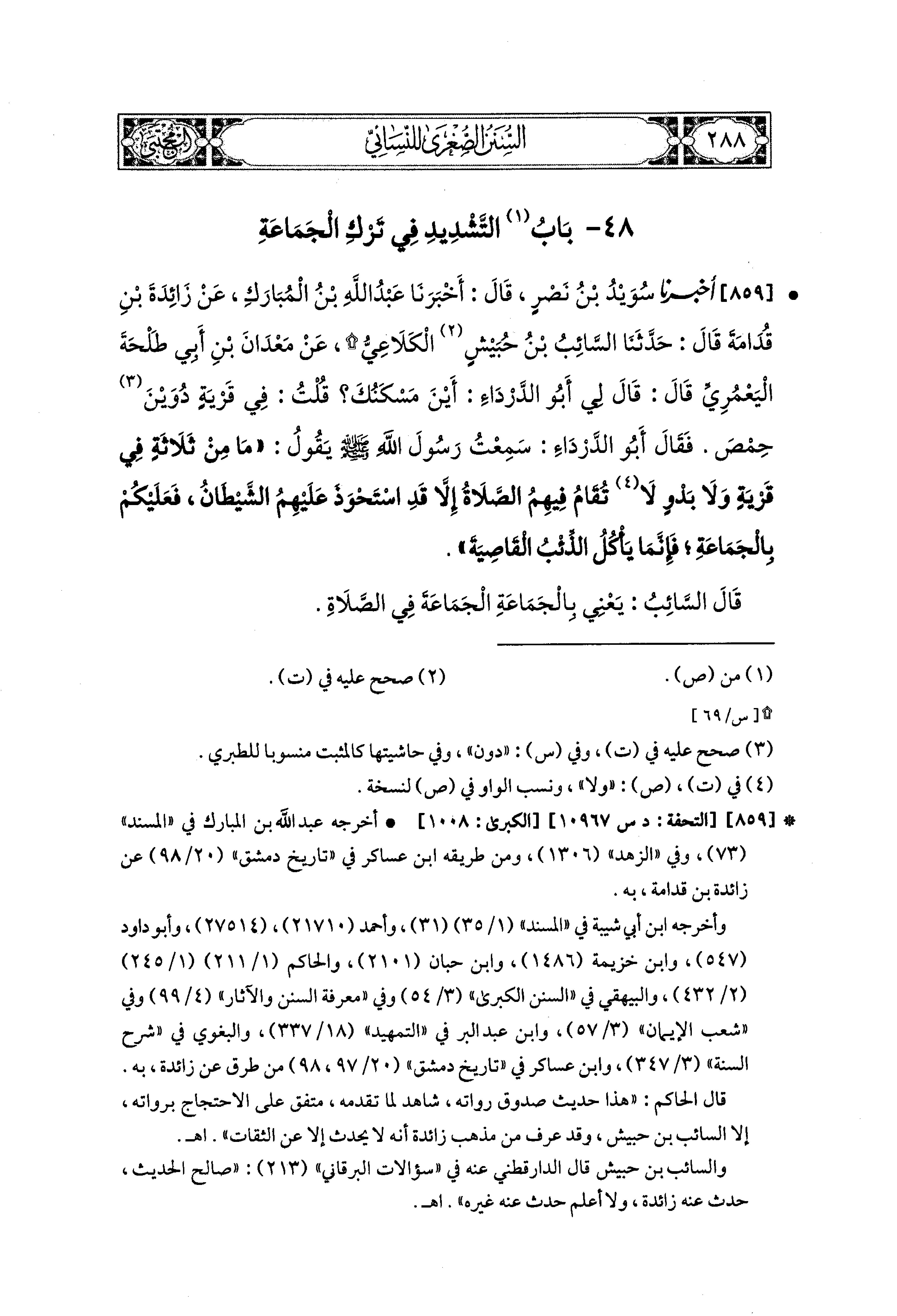859- أَخبَرنا سُوَيْدُ بنُ نَصْرٍ، قَالَ: أَخبَرنا عَبدُ اللهِ بنُ المُبَارَكِ، عَن زَائِدَةَ بْنِ قُدَامَةَ، قال: حَدثنا السَّائِبُ بنُ حُبَيْشٍ الكَلاَعِيُّ، عَن مَعْدَانَ بْنِ أَبي طَلْحَةَ اليَعْمَرِيِّ قَالَ: قَالَ لِي أَبو الدَّرْدَاءِ: أَيْنَ مَسْكَنُكَ؟ قُلْتُ: فِي قَرْيَةٍ دُوَيْنَ حِمْصَ، فَقَالَ أَبو الدَّرْدَاءِ: سَمِعْتُ رَسُولَ اللهِ صَلى الله عَليه وسَلم يَقُولُ: مَا مِنْ ثَلاَثَةٍ فِي قَرْيَةٍ وَلاَ بَدْوٍ لاَ تُقَامُ فِيهِمُ الصَّلاَةُ إِلاَّ قَدِ اسْتَحْوَذَ عَلَيهِمُ الشَّيْطَانُ، فَعَلَيْكُمْ بِالجَمَاعَةِ؛ فَإِنَّمَا يَأْكُلُ الذِّئْبُ القَاصِيَةَ، قَالَ السَّائِبُ: يَعْني بِالجَمَاعَةِ، الجَمَاعَةَ فِي الصَّلاَةِ.