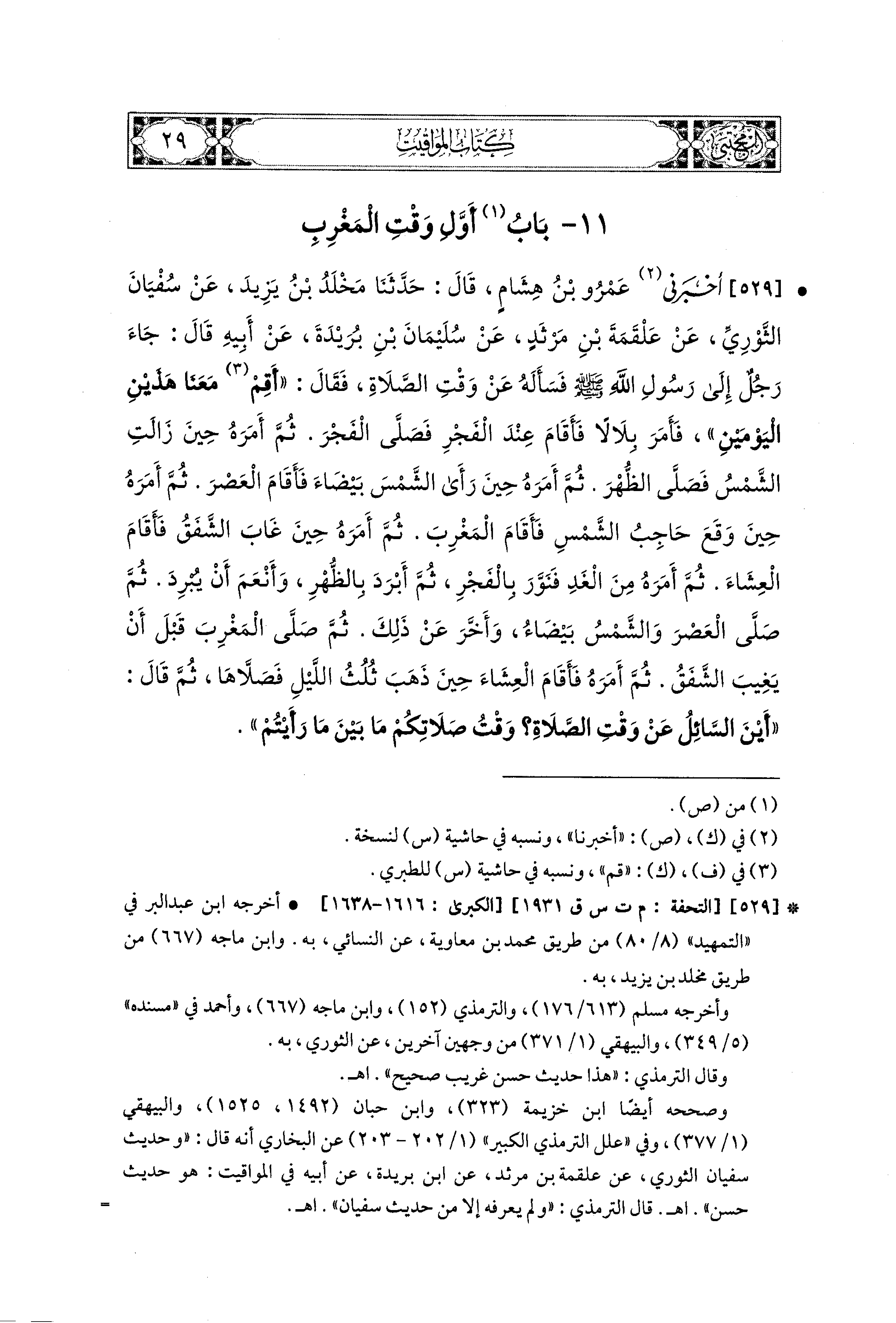 529- أَخبَرني عَمْرُو بنُ هِشَامٍ، قال: حَدثنا مَخْلَدُ بنُ يَزِيدَ، عَن سُفيَانَ الثَّوْرِيِّ، عَن عَلْقَمَةَ بْنِ مَرْثَدٍ، عَن سُلَيمَانَ بْنِ بُرَيْدَةَ، عَن أَبيهِ، قَالَ: جَاءَ رَجُلٌ إِلَى رَسُولِ اللهِ صَلى الله عَليه وسَلم فَسَأَلَهُ عَن وَقْتِ الصَّلاَةِ؟ فَقَالَ: أَقِمْ مَعَنَا هَذَيْنِ اليَوْمَيْنِ، فَأَمَرَ بِلاَلاً فَأَقَامَ عِنْدَ الفَجْرِ، فَصَلَّى الفَجْرَ، ثُمَّ أَمَرَهُ حِينَ زَالَتِ الشَّمْسُ فَصَلَّى الظُّهْرَ، ثُمَّ أَمَرَهُ حِينَ رَأَى الشَّمْسَ بَيْضَاءَ فَأَقَامَ العَصْرَ، ثُمَّ أَمَرَهُ حِينَ وَقَعَ حَاجِبُ الشَّمْسِ فَأَقَامَ المَغْرِبَ، ثُمَّ أَمَرَهُ حِينَ غَابَ الشَّفَقُ فَأَقَامَ العِشَاءَ، ثُمَّ أَمَرَهُ مِنَ الغَدِ فَنَوَّرَ بِالفَجْرِ، ثُمَّ أَبْرَدَ بِالظُّهْرِ وَأَنْعَمَ أَنْ يُبْرِدَ، ثُمَّ صَلَّى العَصْرَ وَالشَّمْسُ بَيْضَاءُ وَأَخَّرَ عَن ذَلِكَ، ثُمَّ صَلَّى المَغْرِبَ قَبْلَ أَنْ يَغِيبَ الشَّفَقُ، ثُمَّ أَمَرَهُ فَأَقَامَ العِشَاءَ حِينَ ذَهَبَ ثُلُثُ اللَّيلِ فَصَلاَّهَا، ثُمَّ قَالَ: أَيْنَ السَّائِلُ عَن وَقْتِ الصَّلاَةِ؟ وَقْتُ صَلاَتِكُمْ مَا بَيْنَ مَا رَأَيْتُمْ.