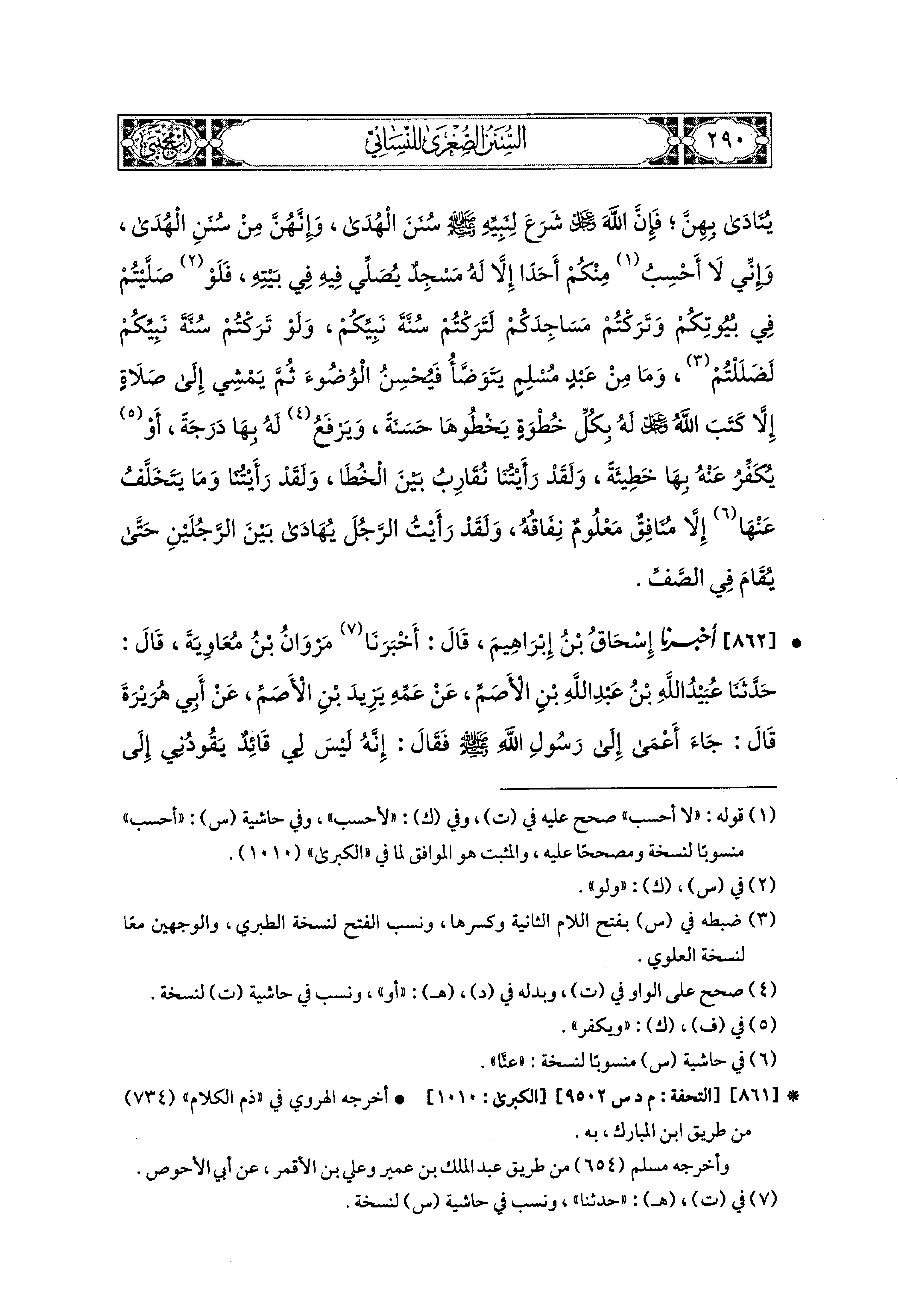 862- أَخبَرنا إِسحَاقُ بنُ إِبراهِيمَ، قال: أَخبَرَنا مَرْوَانُ بنُ مُعَاوِيَةَ، قال: حَدثنا عُبَيدُ اللهِ بنُ عَبدِ اللهِ بْنِ الأَصَمِّ، عَن عَمِّهِ يَزِيدَ بْنِ الأَصَمِّ، عَن أَبي هُرَيْرَةَ قَالَ: جَاءَ أَعْمَى إِلَى رَسُولِ اللهِ صَلى الله عَليه وسَلم، فَقَالَ: إِنَّهُ لَيْسَ لِي قَائِدٌ يَقُودُني إِلَى الصَّلاَةِ، فَسَأَلَهُ أَنْ يُرَخِّصَ لَهُ أَنْ يُصَلِّيَ فِي بَيْتِهِ، فَأَذِنَ لَهُ، فَلَمَّا وَلَّى دَعَاهُ فَقَالَ لَهُ: تَسْمَعُ النِّدَاءَ بِالصَّلاَةِ؟ قَالَ: نَعَمْ، قَالَ: فَأَجِبْ.