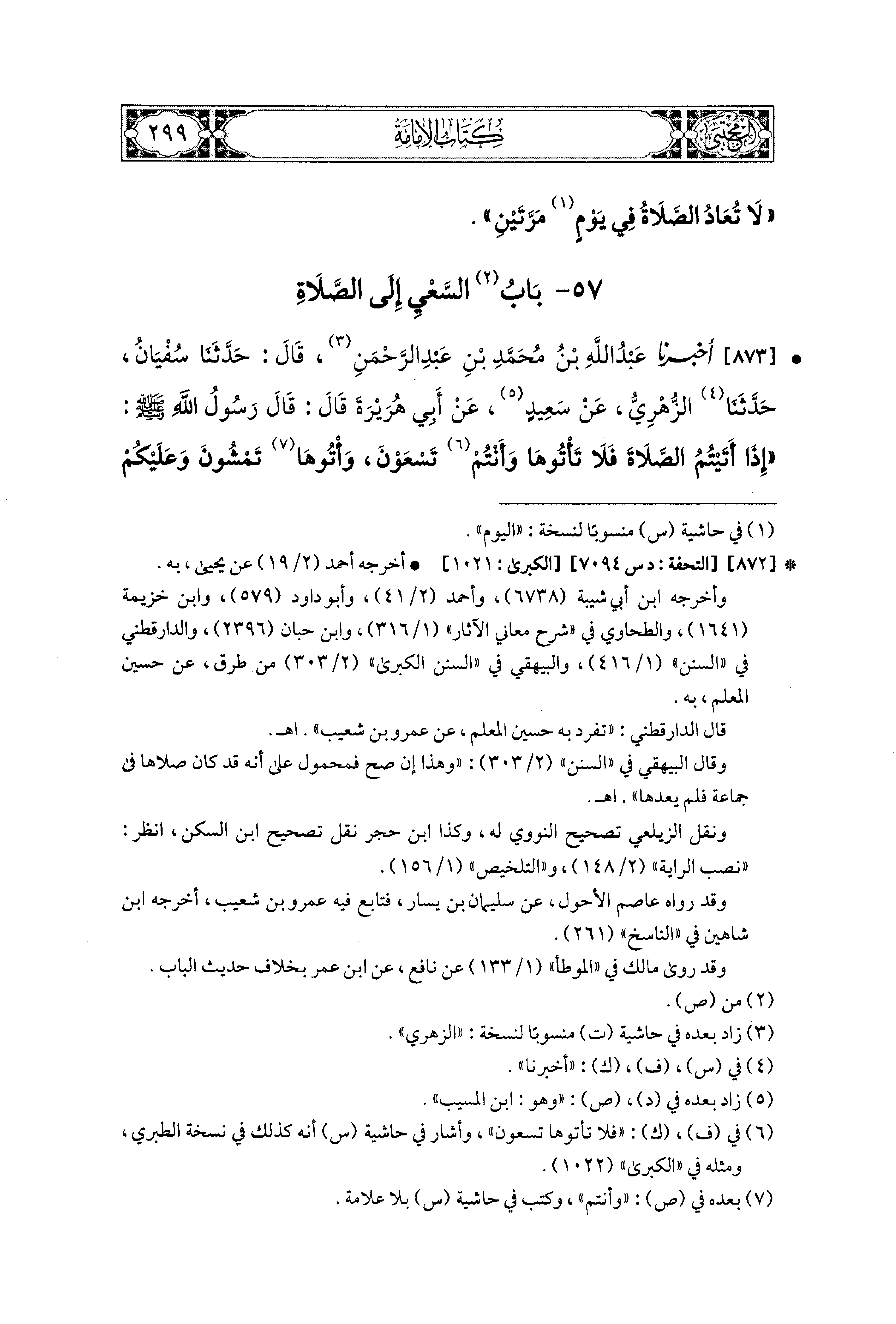 873- أَخبَرنا عَبدُ اللهِ بنُ مُحَمدِ بْنِ عَبدِ الرَّحْمَنِ، قال: حَدثنا سُفيَانُ، حَدَّثَنَا الزُّهْرِيُّ، عَن سَعيدٍ، عَن أَبي هُرَيْرَةَ قَالَ: قَالَ رَسُولُ اللهِ صَلى الله عَليه وسَلم: إِذَا أَتَيْتُمُ الصَّلاَةَ فَلاَ تَأْتُوهَا وَأَنْتُمْ تَسْعَوْنَ، وَأْتُوهَا تَمْشُونَ وَعَلَيْكُمُ السَّكِينَةُ، فَمَا أَدْرَكْتُمْ فَصَلُّوا وَمَا فَاتَكُمْ فَاقْضُوا.