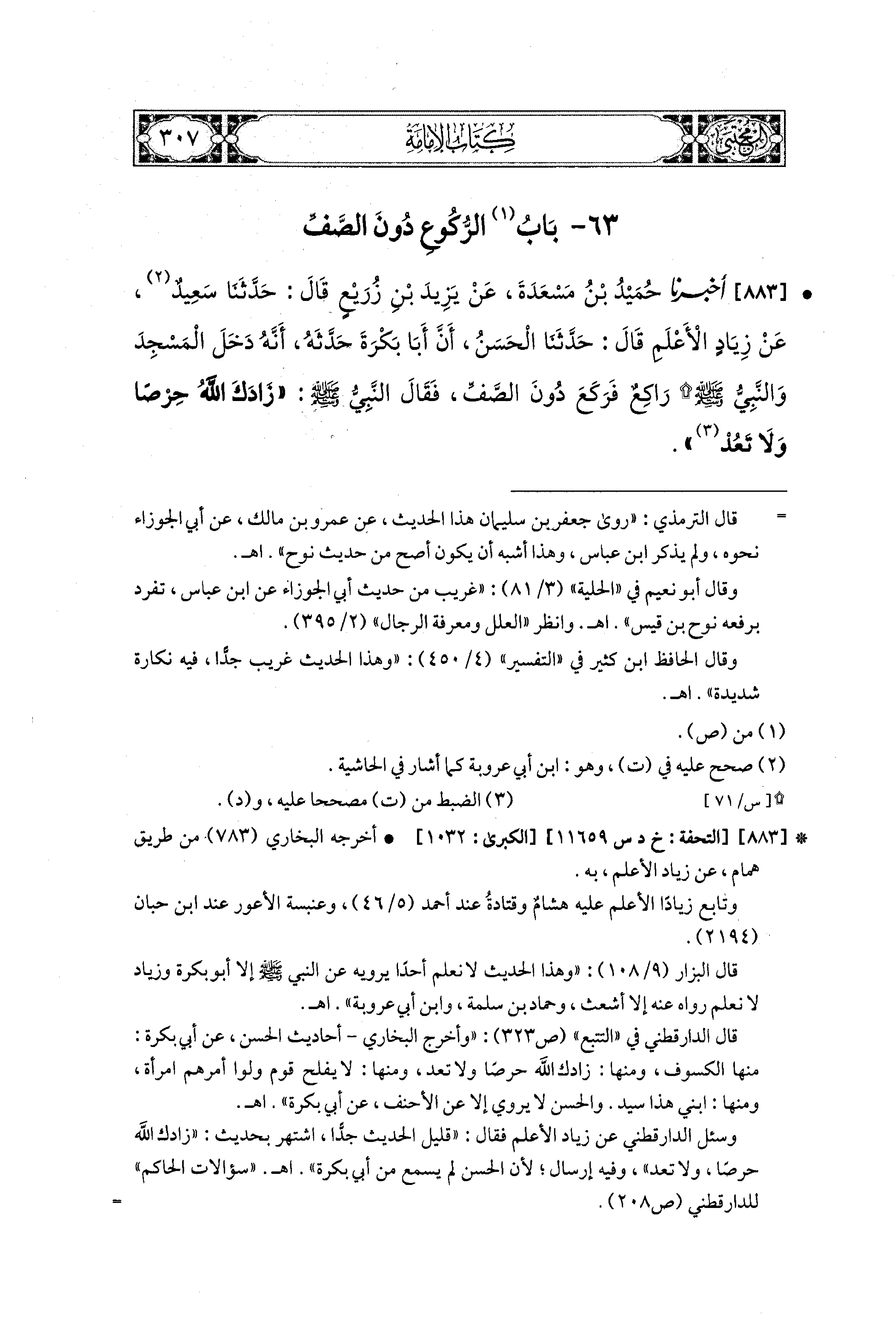 883- أَخبَرنا حُمَيدُ بنُ مَسْعَدَةَ، عَن يَزِيدَ بْنِ زُرَيْعٍ، قال: حَدثنا سَعيدٌ، عَن زِيَادٍ الأَعْلَمِ، قال: حَدثنا الحَسَنُ، أَنَّ أَبَا بَكْرَةَ حَدَّثَهُ، أَنَّهُ دَخَلَ المَسْجِدَ وَالنَّبيُّ صَلى الله عَليه وسَلم رَاكِعٌ، فَرَكَعَ دُونَ الصَّفِّ، فَقَالَ النَّبيُّ صَلى الله عَليه وسَلم: زَادَكَ اللهُ حِرْصًا وَلاَ تَعُدْ.