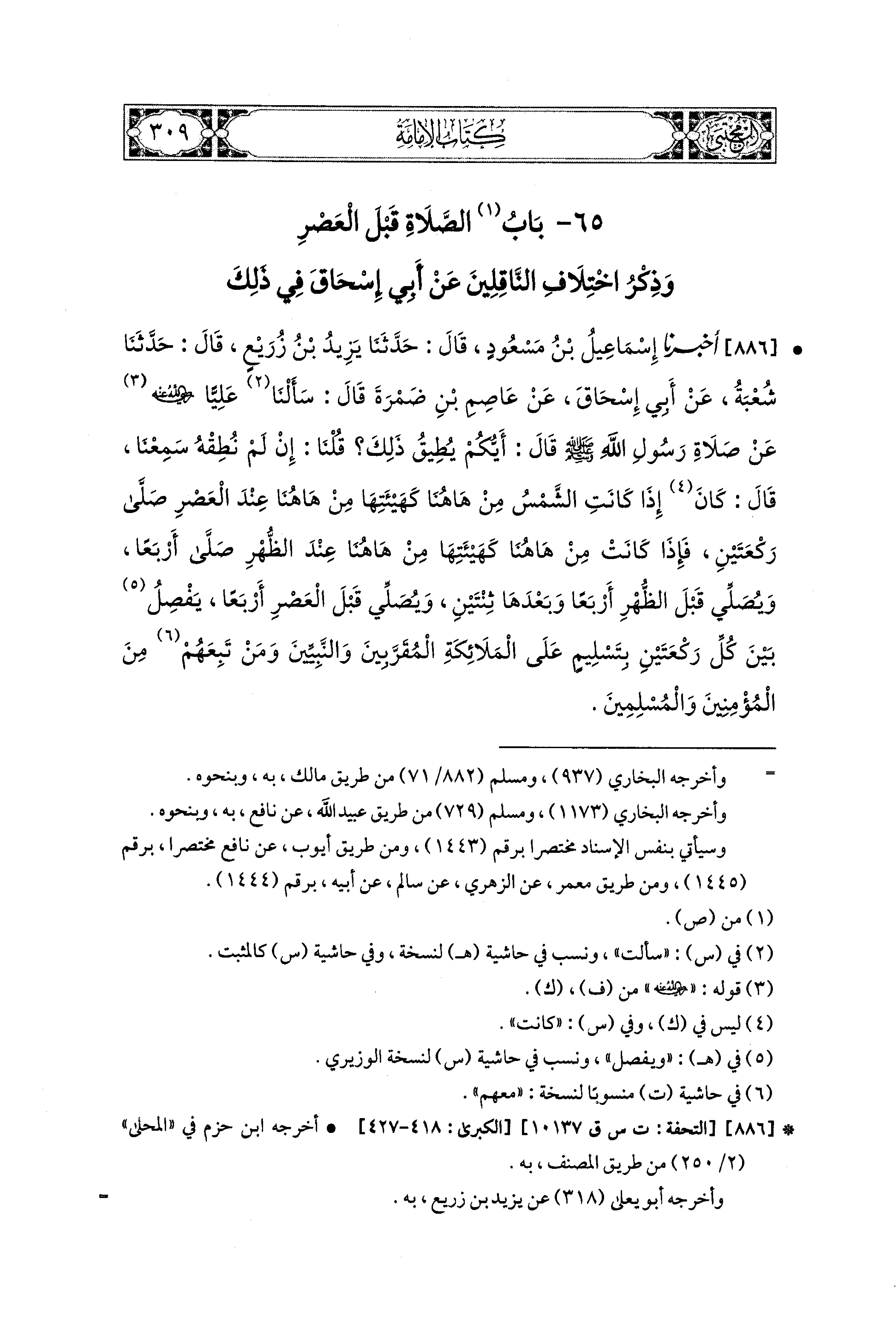 65- بَابُ الصَّلاَةُ قَبْلَ العَصْرِ وَذِكْرُ اخْتِلاَفِ النَّاقِلِينَ عَن أَبي إِسحَاقَ فِي ذَلِكَ