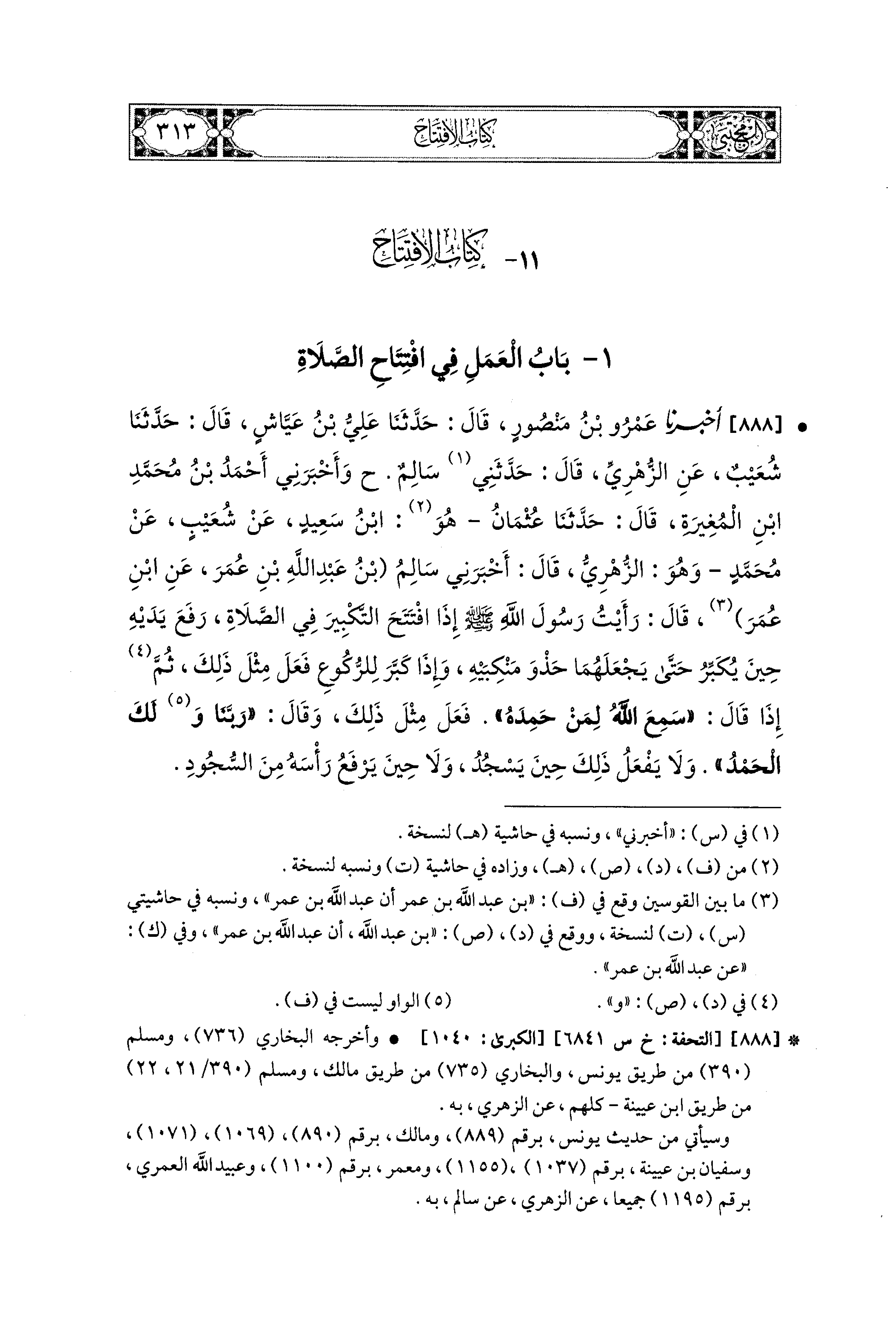 888 - أَخبَرنا عَمْرُو بنُ مَنْصُورٍ، قال: حَدثنا عَلِيُّ بنُ عَيَّاشٍ، قال: حَدثنا شُعَيبٌ، عَنِ الزُّهْرِيِّ، قَالَ: حَدَّثَني سَالِمٌ (ح) وَأَخبَرني أَحْمَدُ بنُ مُحَمدِ بْنِ المُغِيرَةِ، قال: حَدثنا عُثمَانُ، هُوَ ابنُ سَعيدٍ، عَن شُعَيبٍ، عَن مُحَمدٍ، وَهُوَ الزُّهْرِيُّ، قَالَ: أَخبَرني سَالِمُ بنُ عَبدِ اللهِ بْنِ عُمَرَ، عَنِ ابنِ عُمَرَ قَالَ: رَأَيْتُ رَسُولَ اللهِ صَلى الله عَليه وسَلم إِذَا افْتَتَحَ التَّكْبِيرَ فِي الصَّلاَةِ رَفَعَ يَدَيْهِ حِينَ يُكَبِّرُ حَتَّى يَجْعَلَهُمَا حَذْوَ مَنْكِبَيْهِ، وَإِذَا كَبَّرَ لِلرُّكُوعِ فَعَلَ مِثْلَ ذَلِكَ، ثُمَّ إِذَا قَالَ: سَمِعَ اللهُ لِمَنْ حَمِدَهُ، فَعَلَ مِثْلَ ذَلِكَ وَقَالَ: رَبَّنَا وَلَكَ الحَمْدُ، وَلاَ يَفْعَلُ ذَلِكَ حِينَ يَسْجُدُ وَلاَ حِينَ يَرْفَعُ رَأْسَهُ مِنَ السُّجُودِ.