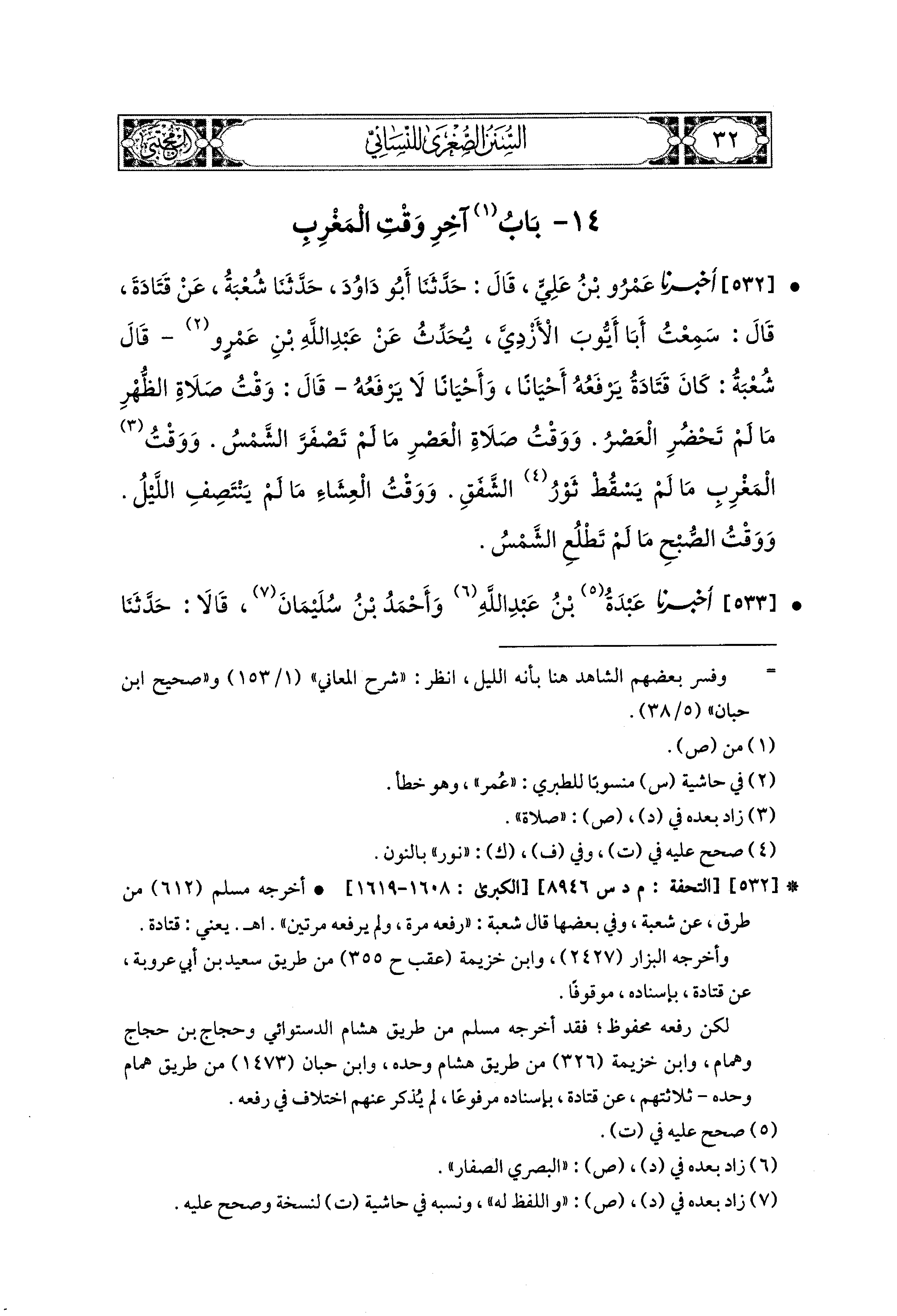 532- أَخبَرنا عَمْرُو بنُ عَلِيٍّ، قال: حَدثنا أَبو دَاوُدَ، حَدَّثَنَا شُعبَةُ، عَن قَتَادَةَ، قَالَ: سَمِعْتُ أَبَا أَيُّوبَ الأَزْدِيَّ يُحَدِّثُ، عَن عَبد اللهِ بن عَمْرٍو قَالَ شُعبَةُ: كَانَ قَتَادَةُ، يَرْفَعُهُ أَحْيَانًا، وَأَحْيَانًا لاَ يَرْفَعُهُ، قَالَ: وَقْتُ صَلاَةِ الظُّهْرِ مَا لَمْ تَحْضُرِ العَصْرُ، وَوَقْتُ صَلاَةِ العَصْرِ مَا لَمْ تَصْفَرَّ الشَّمْسُ، وَوَقْتُ المَغْرِبِ مَا لَمْ يَسْقُطْ ثَوْرُ الشَّفَقِ، وَوَقْتُ العِشَاءِ مَا لَمْ يَنْتَصِفِ اللَّيلُ، وَوَقْتُ الصُّبْحِ مَا لَمْ تَطْلُعِ الشَّمْسُ.