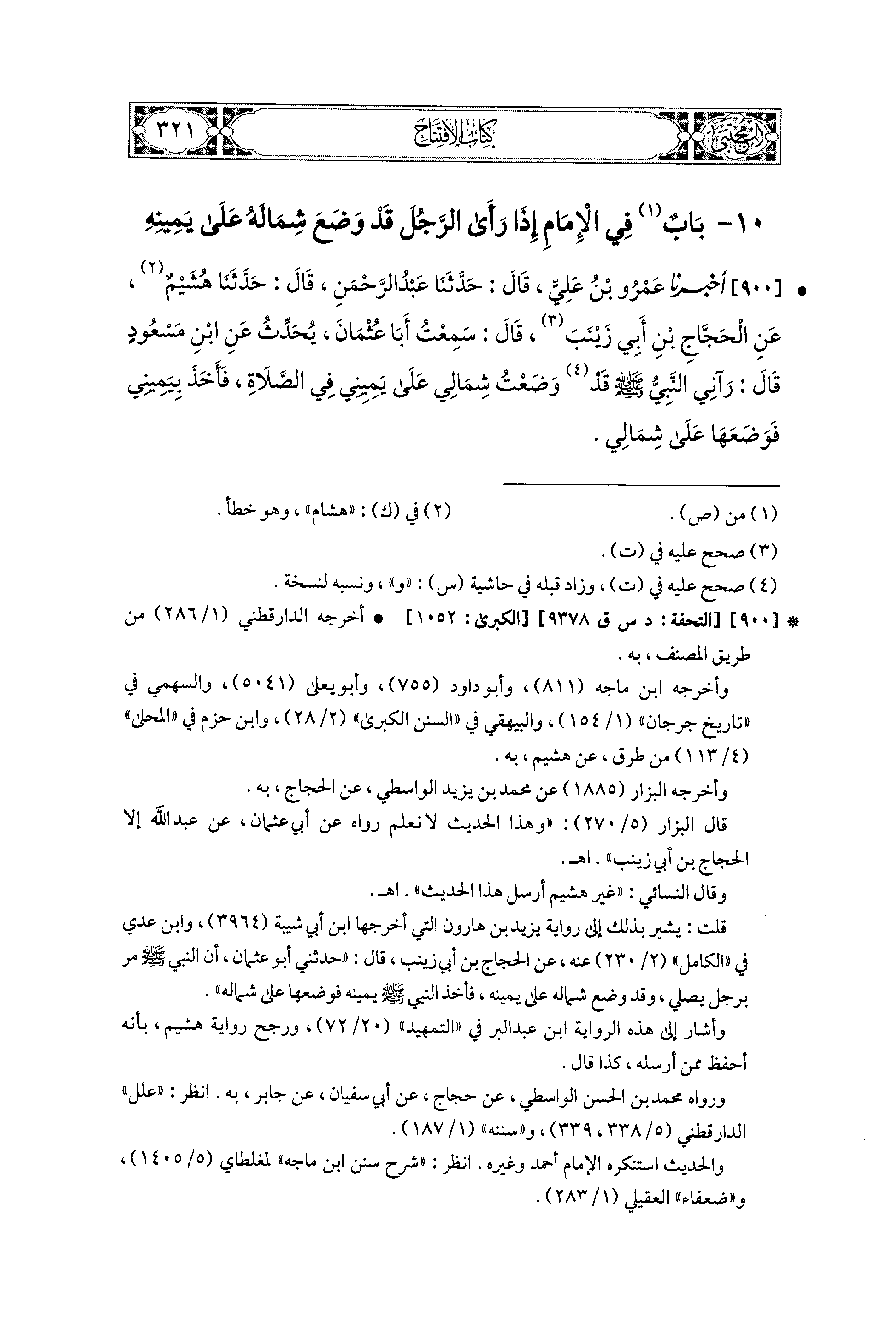 900- أَخبَرنا عَمْرُو بنُ عَلِيٍّ، قال: حَدثنا عَبدُ الرَّحْمَنِ، قال: حَدثنا هُشَيْمٌ، عَنِ الحَجَّاجِ بنُ أَبي زَيْنَبَ، قَالَ: سَمِعْتُ أَبَا عُثمَانَ يُحَدِّثُ، عَنِ ابنِ مَسْعُودٍ قَالَ: رَآنيَ النَّبيُّ صَلى الله عَليه وسَلم قَدْ وَضَعْتُ شِمَالِي عَلَى يَمِيني فِي الصَّلاَةِ، فَأَخَذَ بِيَمِيني فَوَضَعَهَا عَلَى شِمَالِي.