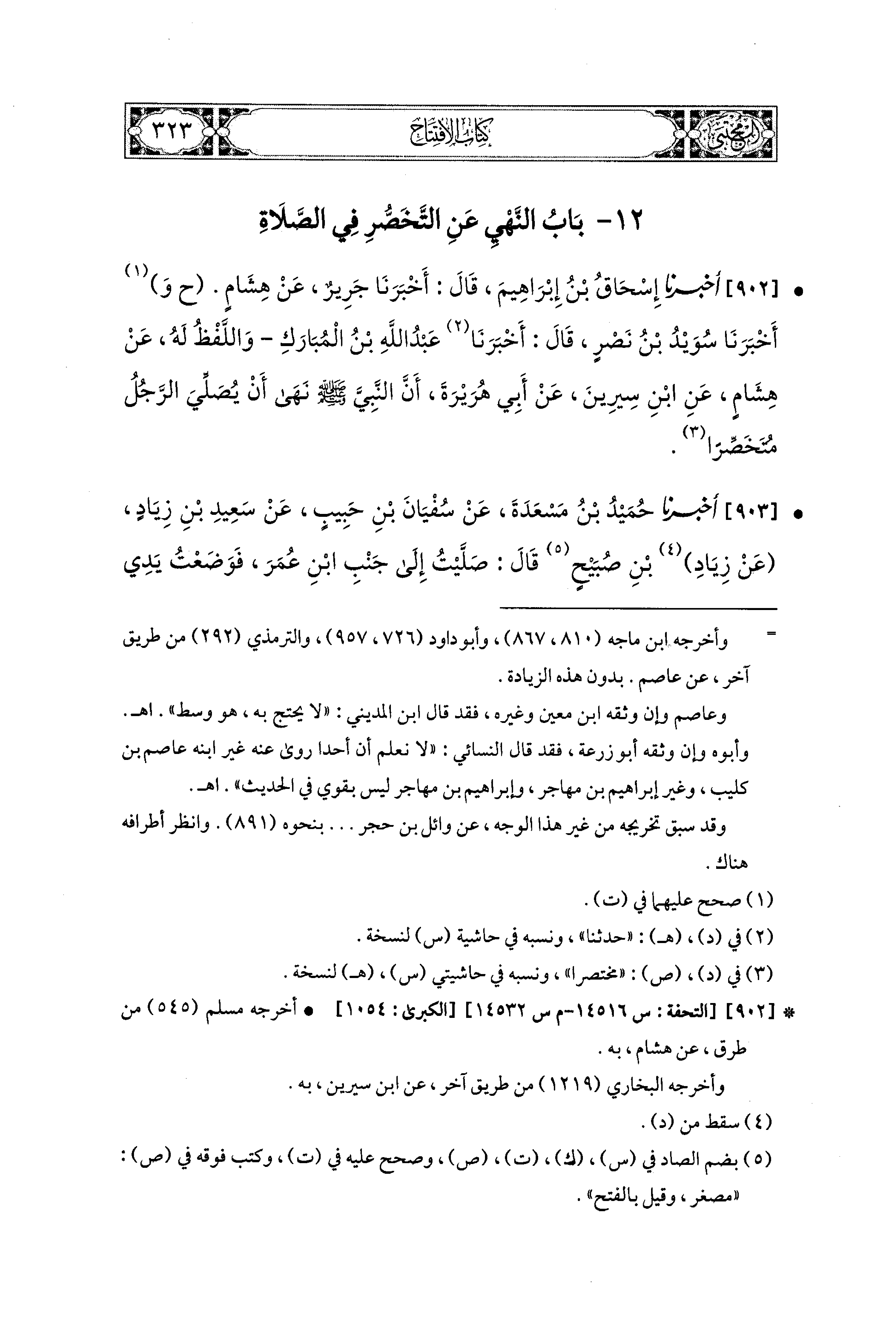 902- أَخبَرنا إِسحَاقُ بنُ إِبراهِيمَ، قَالَ: أَخبَرنا جَرِيرٌ، عَن هِشَامٍ (ح) وَأَخْبَرَناَ سُوَيْدُ بنُ نَصْرٍ، قَالَ: أَخبَرنا عَبدُ اللهِ بنُ المُبَارَكِ، وَاللَّفْظُ لَهُ، عَن هِشَامٍ، عَنِ ابنِ سِيرِينَ، عَن أَبي هُرَيْرَةَ، أَنَّ النَّبيِّ صَلى الله عَليه وسَلم نَهَى أَنَّ يُصَلِّيَ الرَّجُلُ مُخْتَصِرًا.