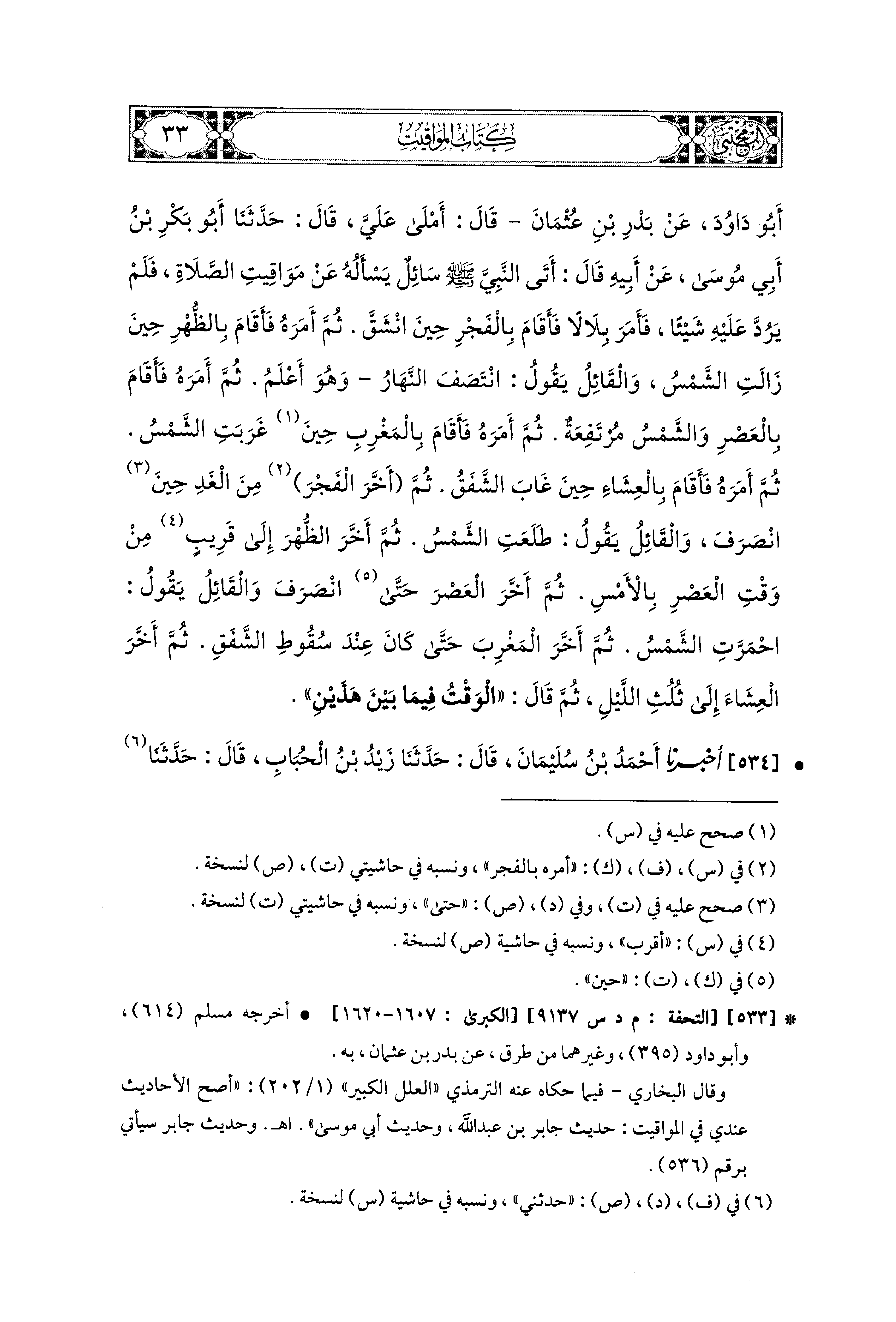 534- أَخبَرنا أَحْمَدُ بنُ سُلَيمَانَ، قال: حَدثنا زَيْدُ بنُ الحُبَابِ، قال: حَدثنا خَارِجَةُ بنُ عَبدِ اللهِ بْنِ سُلَيمَانَ بْنِ زَيْدِ بْنِ ثَابِتٍ، قَالَ: حَدَّثَني الحُسَيْنُ بنُ بَشِيرِ بْنِ سَلاَّمٍ، عَن أَبيهِ، قَالَ: دَخَلْتُ أَنَا وَمُحَمدُ بنُ عَلِيٍّ عَلَى جَابِرِ بْنِ عَبدِ اللهِ الأَنصَارِيِّ فَقُلْنَا لَهُ: أَخْبِرْنَا عَن صَلاَةِ رَسُولِ اللهِ صَلى الله عَليه وسَلم، وَذَلكَ زَمَنَ الحَجَّاجِ بْنِ يُوسُفَ، قَالَ: خَرَجَ رَسُولُ اللهِ صَلى الله عَليه وسَلم فَصَلَّى الظُّهْرَ حِينَ زَالَتِ الشَّمْسُ وَكَانَ الفَيْءُ قَدْرَ الشِّرَاكِ، ثُمَّ صَلَّى العَصْرَ حِينَ كَانَ الفَيْءُ قَدْرَ الشِّرَاكِ، وَظِلِّ الرَّجُلِ، ثُمَّ صَلَّى المَغْرِبَ حِينَ غَابَتِ الشَّمْسُ، ثُمَّ صَلَّى العِشَاءَ حِينَ غَابَ الشَّفَقُ، ثُمَّ صَلَّى الفَجْرَ حِينَ طَلَعَ الفَجْرُ، ثُمَّ صَلَّى مِنَ الغَدِ الظُّهْرَ حِينَ كَانَ الظِّلُّ طُولَ الرَّجُلِ، ثُمَّ صَلَّى العَصْرَ حِينَ كَانَ ظِلُّ الرَّجُلِ مِثْلَيْهِ قَدْرَ مَا يَسِيرُ الرَّاكِبُ سَيْرَ العَنَقِ إِلَى ذِي الحُلَيْفَةِ، ثُمَّ صَلَّى المَغْرِبَ حِينَ غَابَتِ الشَّمْسُ، ثُمَّ صَلَّى العِشَاءَ إِلَى ثُلُثِ اللَّيلِ، أَوْ نِصْفِ اللَّيلِ، شَكَّ زَيْدٌ، ثُمَّ صَلَّى الفَجْرَ فَأَسْفَرَ.