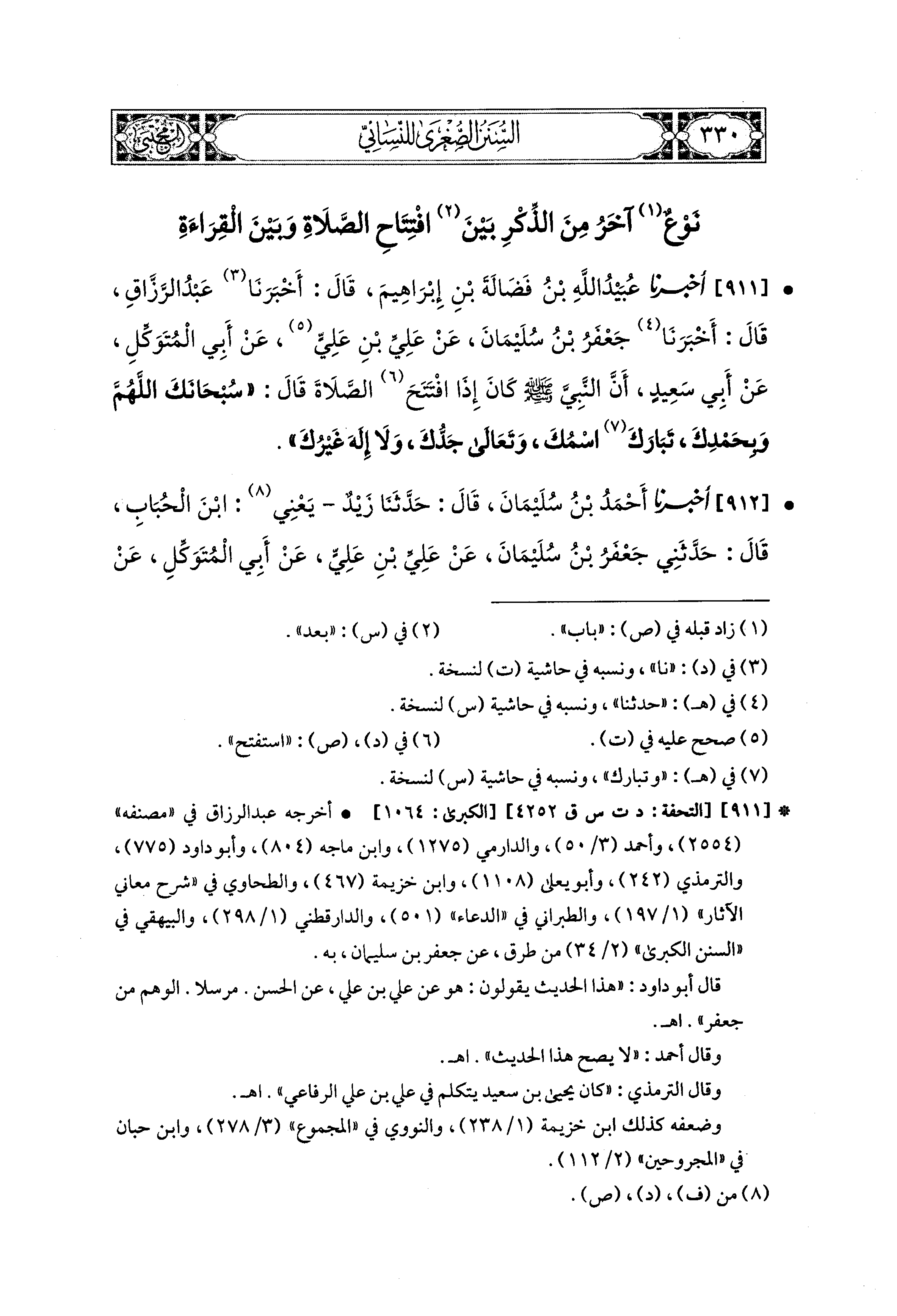 912- أَخبَرنا أَحْمَدُ بنُ سُلَيمَانَ، قال: حَدثنا زَيْدُ يَعْني بنُ الحُبَابِ، قَالَ: حَدَّثَني جَعْفَرُ بنُ سُلَيمَانَ، عَن عَلِيِّ بْنِ عَلِيٍّ، عَن أَبي المُتَوَكِّلِ، عَن أَبي سَعيدٍ رَضِيَ اللهُ عَنهُ قَالَ: كَانَ رَسُولُ اللهِ صَلى الله عَليه وسَلم إِذَا افْتَتَحَ الصَّلاَةَ قَالَ: سُبْحَانَكَ اللهُمَّ وَبِحَمْدِكَ، تَبَارَكَ اسْمُكَ وَتَعَالَى جَدُّكَ وَلاَ إِلَهَ غَيْرُكَ.