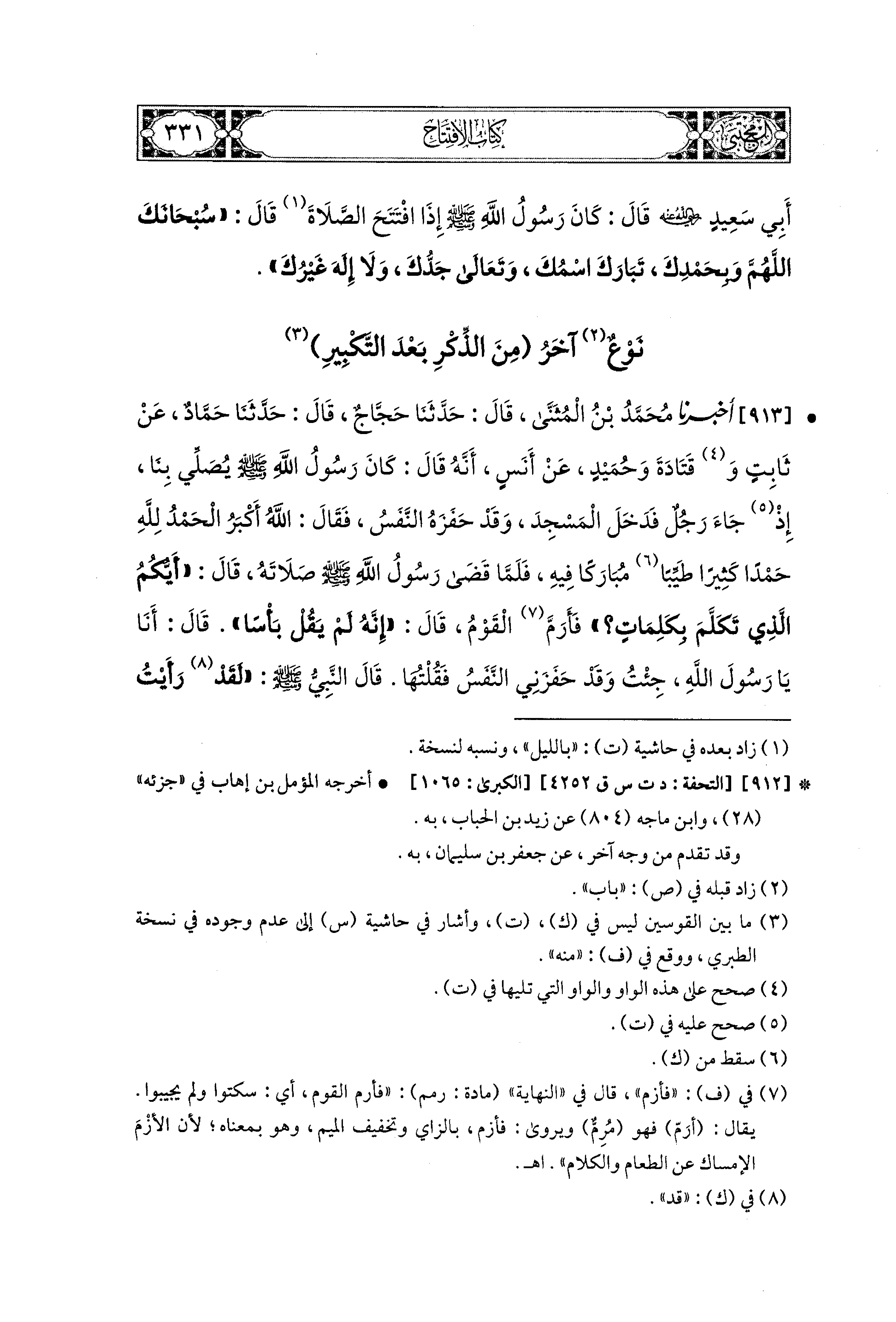 913- أَخبَرنا مُحَمد بنُ المُثَنَّى، قال: حَدثنا حَجَّاجٌ، قال: حَدثنا حَمَّادٌ، عَن ثَابِتٍ، وَقَتَادَةَ، وَحُمَيدٍ، عَن أَنَسٍ أَنَّهُ قَالَ: كَانَ رَسُولُ اللهِ صَلى الله عَليه وسَلم يُصَلِّي بِنَا إِذْ جَاءَ رَجُلٌ فَدَخَلَ المَسْجِدَ وَقَدْ حَفَزَهُ النَّفَسُ، فَقَالَ: اللهُ أَكْبَرُ، الحَمْدُ لِلَّهِ حَمْدًا كَثِيرًا طَيِّبًا مُبَارَكًا فِيهِ، فَلَمَّا قَضَى رَسُولُ اللهِ صَلى الله عَليه وسَلم صَلاَتَهُ قَالَ: أَيُّكُمِ الَّذِي تَكَلَّمَ بِكَلِمَاتٍ؟ فَأَرَمَّ القَوْمُ، قَالَ: إِنَّهُ لَمْ يَقُلْ بَأْسًا، قَالَ: أَنَا يَا رَسُولُ اللهِ جِئْتُ وَقَدْ حَفَزَني النَّفَسُ فَقُلْتُهَا، قَالَ النَّبيُّ صَلى الله عَليه وسَلم: لَقَدْ رَأَيْتُ اثْنَيْ عَشَرَ مَلَكًا يَبْتَدِرُونَهَا أَيُّهُمْ يَرْفَعُهَا.