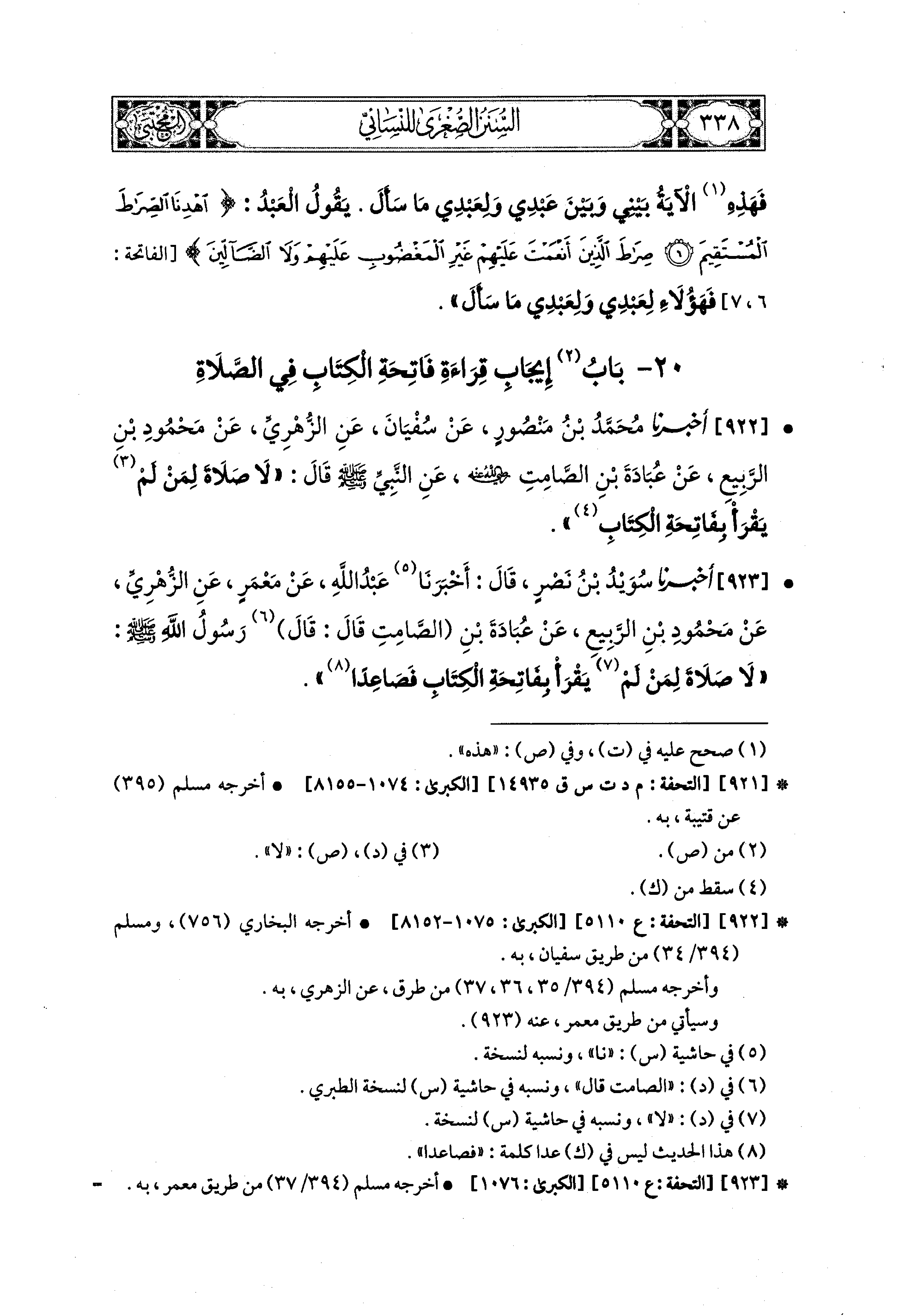 922- أَخبَرنا مُحَمد بنُ مَنْصُورٍ، عَن سُفيَانَ، عَنِ الزُّهْرِيِّ، عَن مَحْمُودِ بْنِ الرَّبِيعِ، عَن عُبَادَةَ بْنِ الصَّامِتِ رَضِيَ اللهُ عَنهُ، عَنِ النَّبيِّ صَلى الله عَليه وسَلم قَالَ: لاَ صَلاَةَ لِمَنْ لَمْ يَقْرَأْ بِفَاتِحَةِ الكِتَابِ.