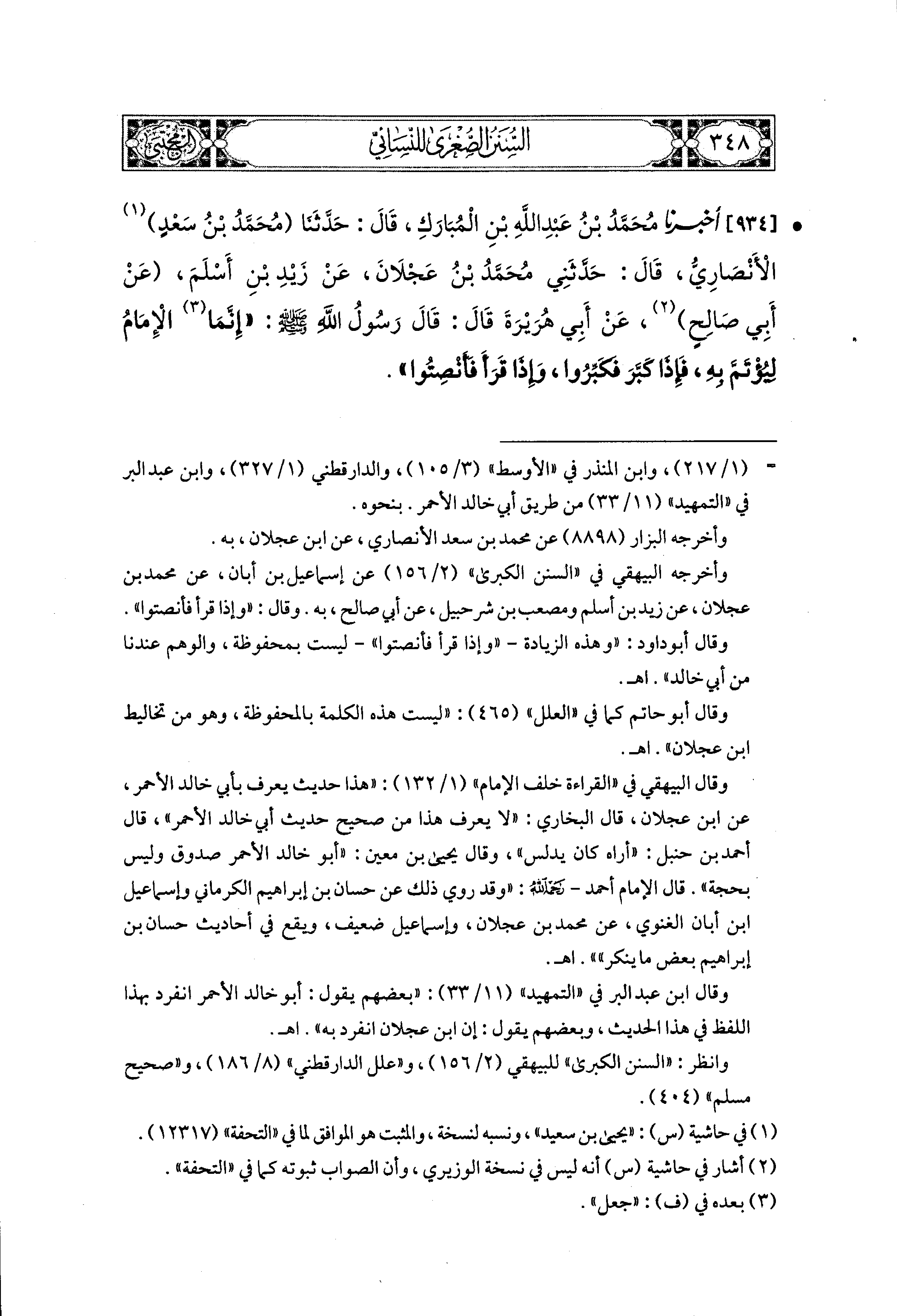 934- أَخبَرنا مُحَمد بنُ عَبدِ اللهِ بْنِ المُبَارَكِ، قال: حَدثنا مُحَمدُ بنُ سَعْدٍ الأَنصَارِيُّ، قَالَ: حَدَّثَني مُحَمدُ بنُ عَجْلاَنَ، عَن زَيْدِ بْنِ أَسْلَمَ، عَن أَبي صَالِحٍ، عَن أَبي هُرَيْرَةَ قَالَ: قَالَ رَسُولُ اللهِ صَلى الله عَليه وسَلم: إِنَّمَا الإِمَامُ لِيُؤْتَمَّ بِهِ، فَإِذَا كَبَّرَ فَكَبِّرُوا، وَإِذَا قَرَأَ فَأَنْصِتُوا.