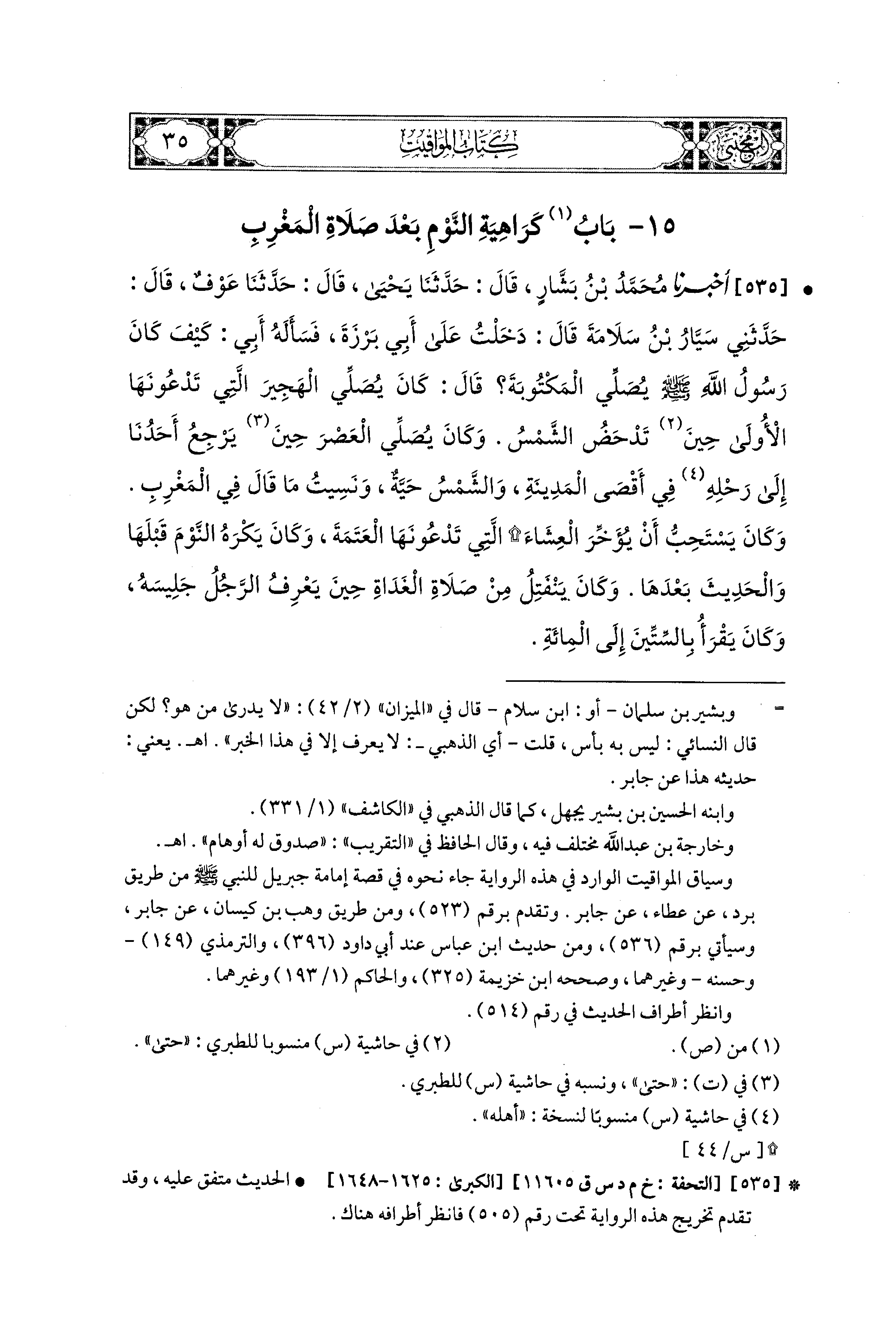 535- أَخبَرنا مُحَمد بنُ بَشَّارٍ، قال: حَدثنا يَحيَى، قال: حَدثنا عَوْفٌ، قَالَ: حَدَّثَني سَيَّارُ بنُ سَلاَمَةَ قَالَ: دَخَلْتُ عَلَى أَبي بَرْزَةَ فَسَأَلَهُ أَبي: كَيْفَ كَانَ رَسُولُ اللهِ صَلى الله عَليه وسَلم يُصَلِّي المَكْتُوبَةَ؟ قَالَ: كَانَ يُصَلِّي الهَجِيرَ الَّتِي تَدْعُونَهَا الأُولَى حِينَ تَدْحَضُ الشَّمْسُ، وَكَانَ يُصَلِّي العَصْرَ حِينَ يَرْجِعُ أَحَدُنَا إِلَى رَحْلِهِ فِي أَقْصَى المَدِينَةِ وَالشَّمْسُ حَيَّةٌ، وَنَسِيتُ مَا قَالَ فِي المَغْرِبِ، وَكَانَ يَسْتَحِبُّ أَنْ يُؤَخِّرَ العِشَاءَ الَّتِي تَدْعُونَهَا العَتَمَةَ، وَكَانَ يَكْرَهُ النَّوْمَ قَبْلَهَا وَالحَدِيثَ بَعْدَهَا، وَكَانَ يَنْفَتِلُ مِنْ صَلاَةِ الغَدَاةِ حِينَ يَعْرِفُ الرَّجُلُ جَلِيسَهُ، وَكَانَ يَقْرَأُ بِالسِّتِّينَ إِلَى المِئَةِ.