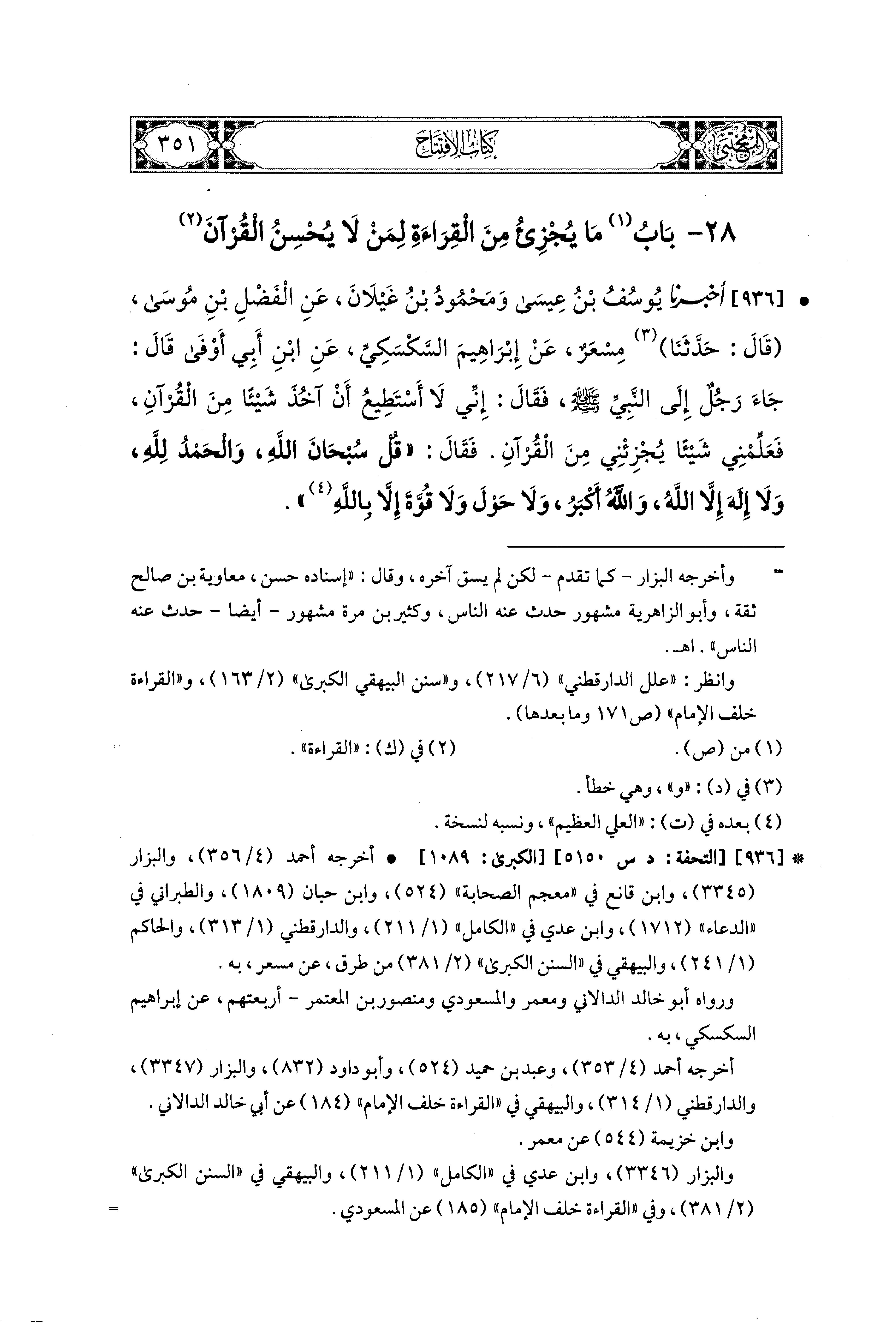 936- أَخبَرنا يُوسُفُ بنُ عِيسَى، وَمَحْمُودُ بنُ غَيْلاَنَ، عَنِ الفَضْلِ بْنِ مُوسَى، قال: حَدثنا مِسْعَرٌ، عَن إِبراهِيمَ السَّكْسَكِيِّ، عَنِ ابنِ أَبي أَوْفَى قَالَ: جَاءَ رَجُلٌ إِلَى النَّبيِّ صَلى الله عَليه وسَلم فَقَالَ: إِنِّي لاَ أَسْتَطِيعُ أَنْ آخُذَ شَيْئًا مِنَ القُرْآنِ فَعَلِّمْني شَيْئًا يُجْزِئْني مِنَ القُرْآنِ، فَقَالَ: قُلْ: سُبْحَانَ اللهُ، وَالحَمْدُ لِلَّهِ، وَلاَ إِلَهَ إِلاَّ اللهِ، وَاللهُ أَكْبَرُ، وَلاَ حَوْلَ وَلاَ قُوَّةَ إِلاَّ بِالله.