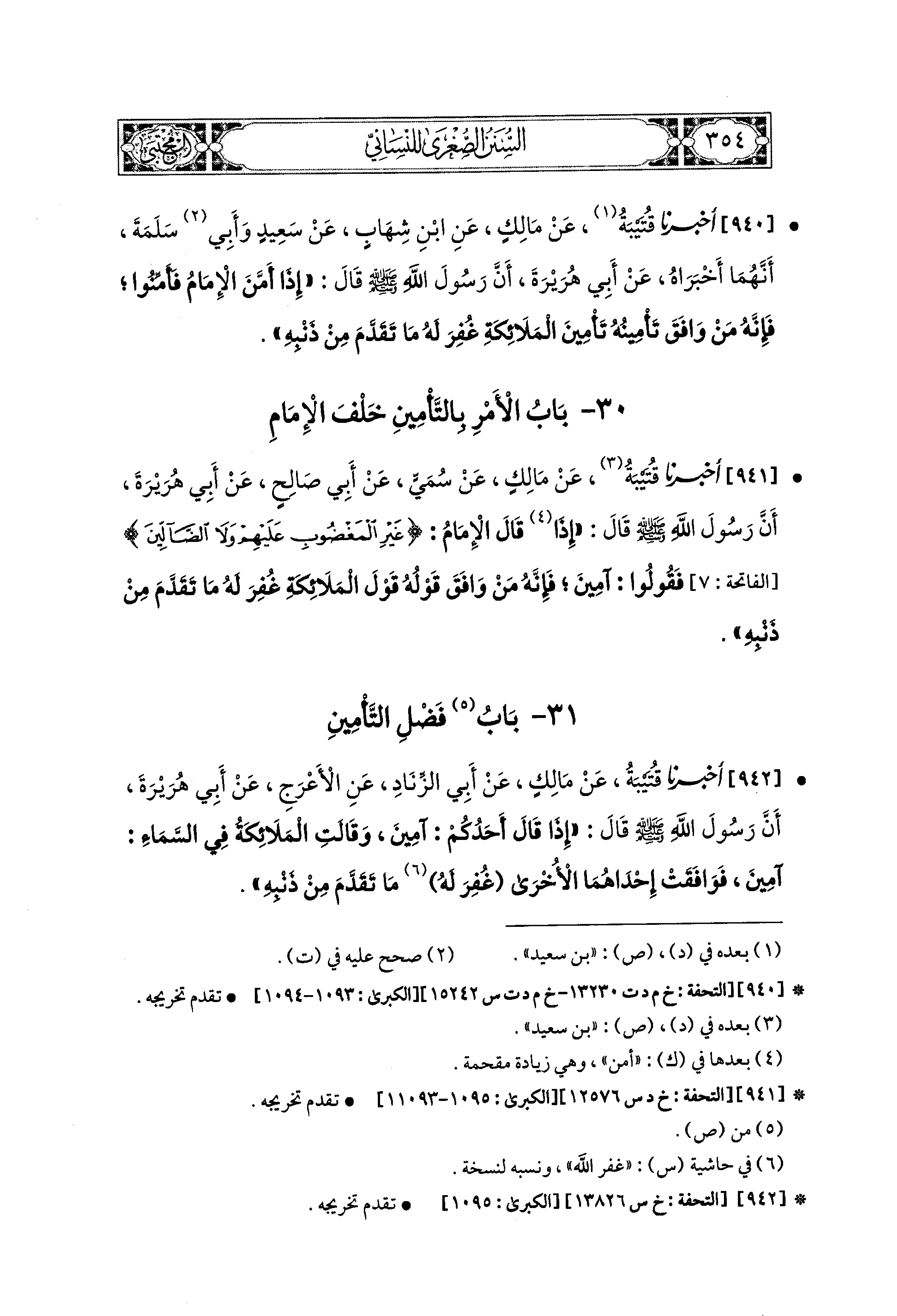 940- أَخبَرنا قُتَيبَةُ، عَن مَالِكٍ، عَنِ ابنِ شِهَابٍ، عَن سَعيدٍ، وَأَبي سَلَمَةَ أَنَّهُمَا أَخْبَرَاهُ، عَن أَبي هُرَيْرَةَ، أَنَّ رَسُولَ اللهِ صَلى الله عَليه وسَلم قَالَ: إِذَا أَمَّنَ الإِمَامُ فَأَمِّنُوا؛ فَإِنَّهُ مَنْ وَافَقَ تَأْمِينُهُ تَأْمِينَ المَلاَئِكَةِ غُفِرَ لَهُ مَا تَقَدَّمَ مَنْ ذَنْبِهِ.