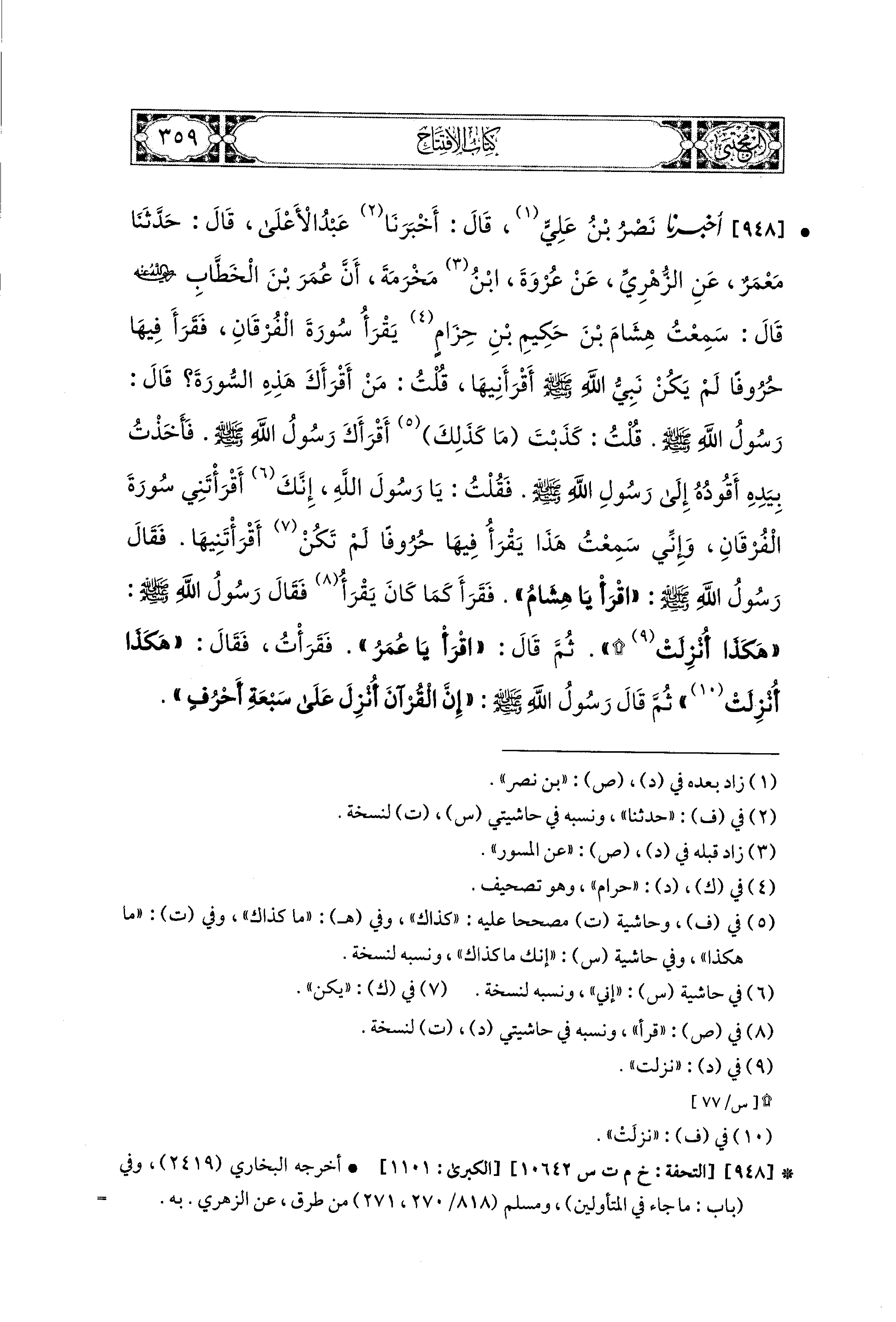 948- أَخبَرنا نَصْرُ بنُ عَلِيٍّ، قَالَ: أَخبَرنا عَبدُ الأَعْلَى، قال: حَدثنا مَعْمَرٌ، عَنِ الزُّهْرِيِّ، عَن عُرْوَةَ بْنِ مَخْرَمَةَ، أَنَّ عُمَرَ بنُ الخَطَّابِ رَضِيَ اللهُ عَنهُ، قَالَ: سَمِعْتُ هِشَامَ بْنَ حَكِيمِ بْنِ حِزَامٍ يَقْرَأُ سُورَةَ الفُرْقَانِ، فَقَرَأَ فِيهَا حُرُوفًا لَمْ يَكُنْ نَبِيُّ اللهُ صَلى الله عَليه وسَلم أَقْرَأَنيهَا، قُلْتُ: مَنْ أَقْرَأَكَ هَذِهِ السُّورَةَ؟ قَالَ: رَسُولُ اللهِ صَلى الله عَليه وسَلم، قُلْتُ: كَذَبْتَ، مَا كذلك أَقْرَأَكَ رَسُولُ اللهِ صَلى الله عَليه وسَلم، فَأَخَذْتُ بِيَدِهِ أَقُودُهُ إِلَى رَسُولُ اللهِ صَلى الله عَليه وسَلم، فَقُلْتُ: يَا رَسُولِ اللهُ، إِنَّكَ أَقْرَأْتَني سُورَةَ الفُرْقَانِ، وَإِنِّي سَمِعْتُ هَذَا يَقْرَأُ فِيهَا حُرُوفًا لَمْ تَكُنْ أَقْرَأْتَنيهَا، فَقَالَ رَسُولُ اللهِ صَلى الله عَليه وسَلم: اقْرَأْ يَا هِشَامُ، فَقَرَأَ كَمَا كَانَ يَقْرَأُ، فَقَالَ رَسُولُ اللهِ صَلى الله عَليه وسَلم: هَكَذَا أُنْزِلَتْ، ثُمَّ قَالَ: اقْرَأْ يَا عُمَرُ، فَقَرَأْتُ، فَقَالَ: هَكَذَا أُنْزِلَتْ، ثُمَّ قَالَ رَسُولُ اللهِ صَلى الله عَليه وسَلم: إِنَّ القُرْآنَ أُنْزِلَ عَلَى سَبْعَةِ أَحْرُفٍ.