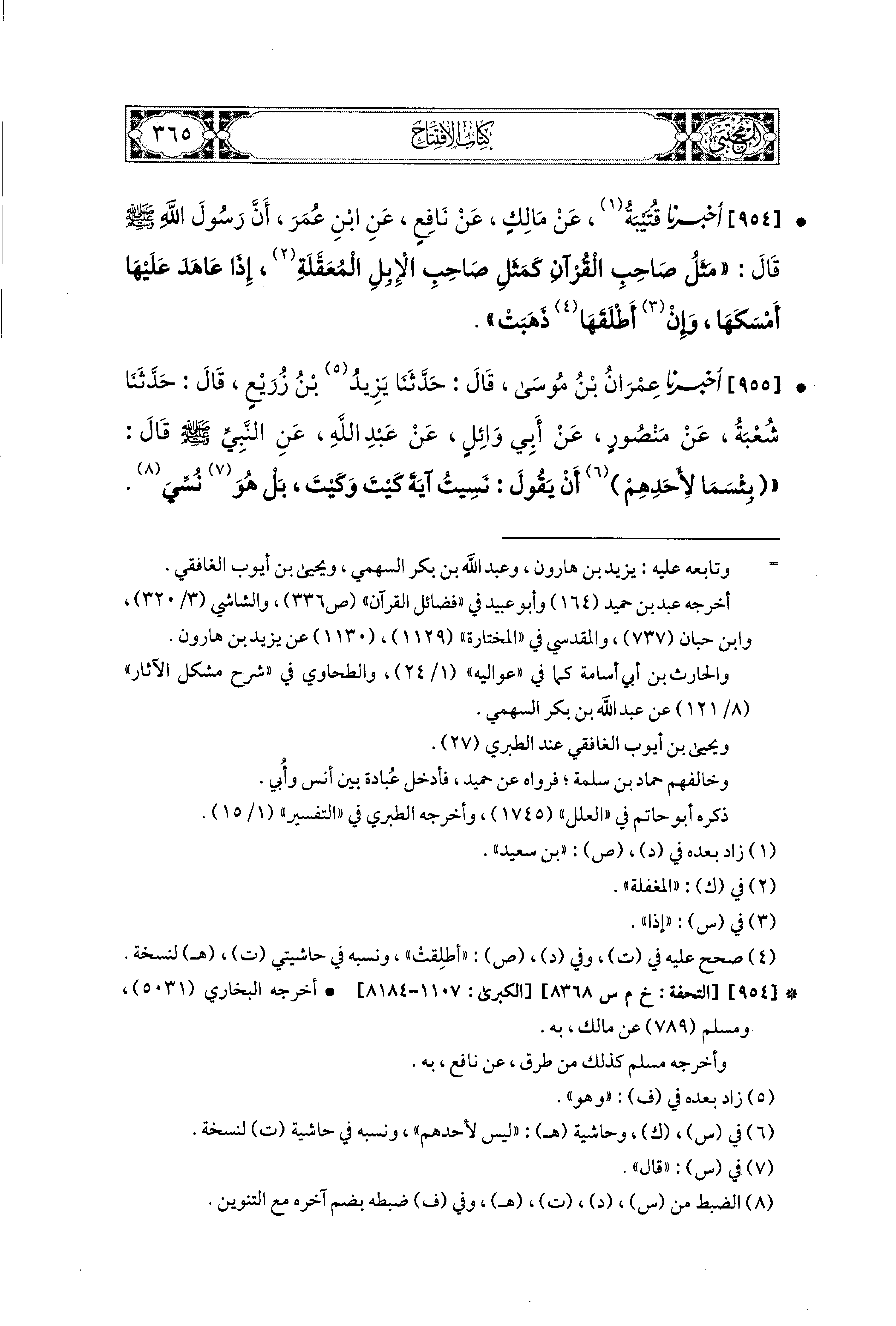 954- أَخبَرنا قُتَيبَةُ، عَن مَالِكٍ، عَن نَافِعٍ، عَنِ ابنِ عُمَرَ، أَنَّ رَسُولَ اللهِ صَلى الله عَليه وسَلم قَالَ: مَثَلُ صَاحِبِ القُرْآنِ كَمَثَلِ صَاحِبِ الإِبِلِ المُعَقَّلَةِ، إِذَا عَاهَدَ عَلَيهَا أَمْسَكَهَا، وَإِنْ أَطْلَقَهَا ذَهَبَتْ.