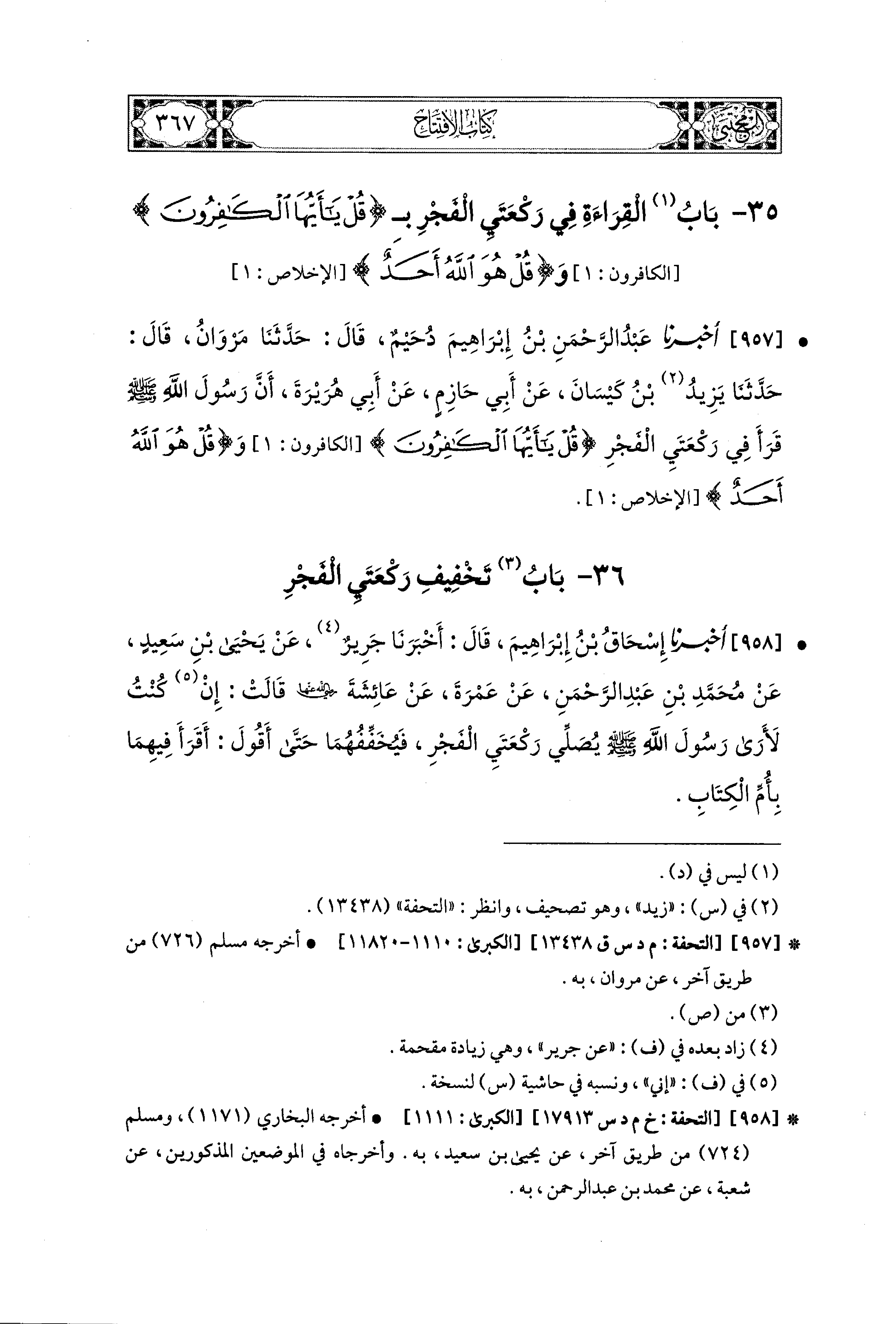 957- أَخبَرنا عَبدُ الرَّحْمَنِ بنُ إِبراهِيمَ دُحَيْمٌ، قال: حَدثنا مَرْوَانُ، قال: حَدثنا يَزِيدُ بنُ كَيْسَانَ، عَن أَبي حَازِمٍ، عَن أَبي هُرَيْرَةَ، أَنَّ رَسُولَ اللهِ صَلى الله عَليه وسَلم قَرَأَ فِي رَكْعَتَيِ الفَجْرِ، {قُلْ يَا أَيُّهَا الكَافِرُونَ} وَ {قُلْ هُوَ اللهُ أَحَدٌ}.