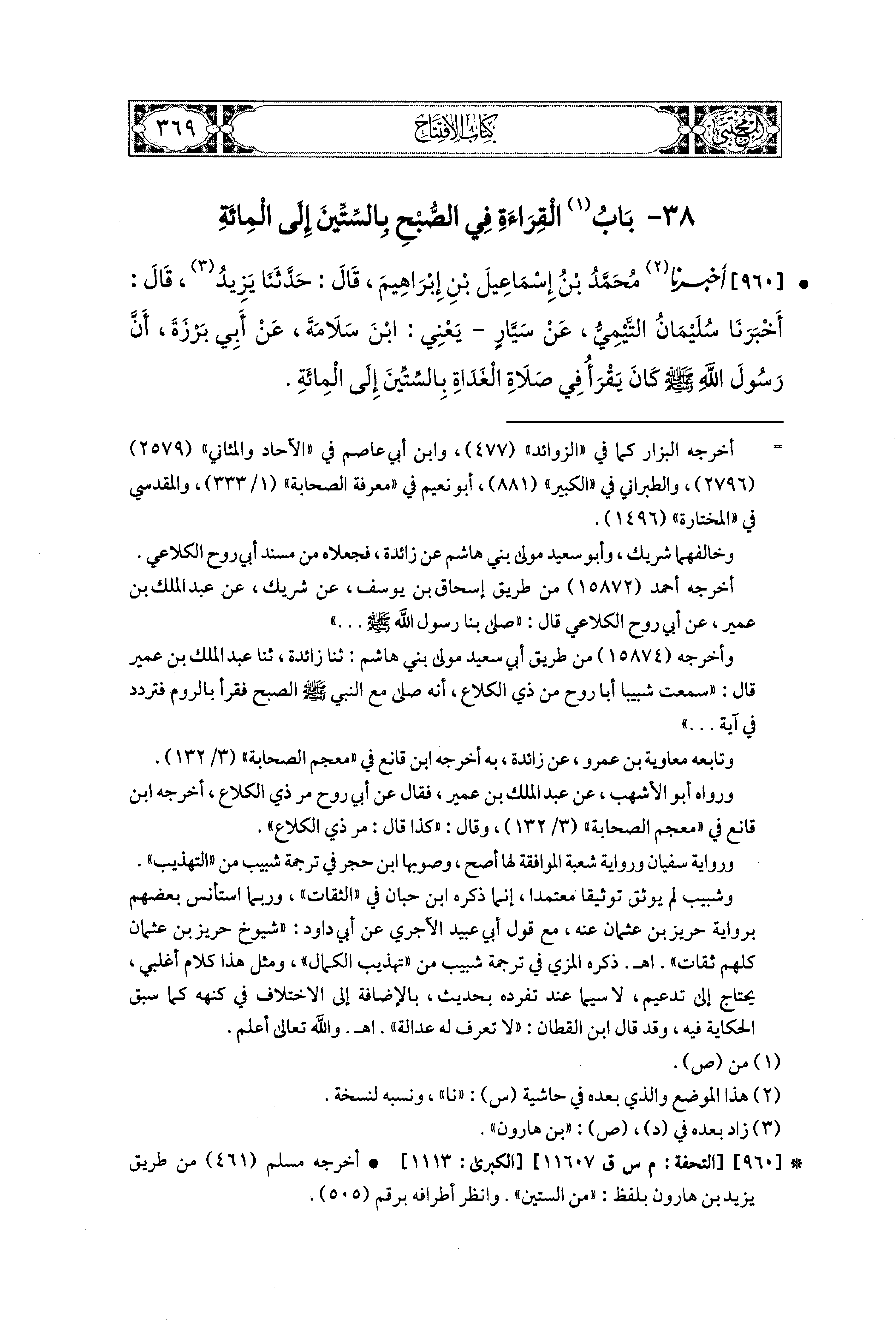 960- أَخبَرنا مُحَمد بنُ إِسماعِيلَ بْنِ إِبراهِيمَ، قال: حَدثنا يَزِيدُ، قَالَ: أَخبَرنا سُلَيمَانُ التَّيْمِيُّ، عَن سَيَّارٍ، يَعْني ابنَ سَلاَمَةَ، عَن أَبي بَرْزَةَ، أَنَّ رَسُولَ اللهِ صَلى الله عَليه وسَلم كَانَ يَقْرَأُ فِي صَلاَةِ الغَدَاةِ بَالسِّتِّينَ إِلَى المِئَةِ.