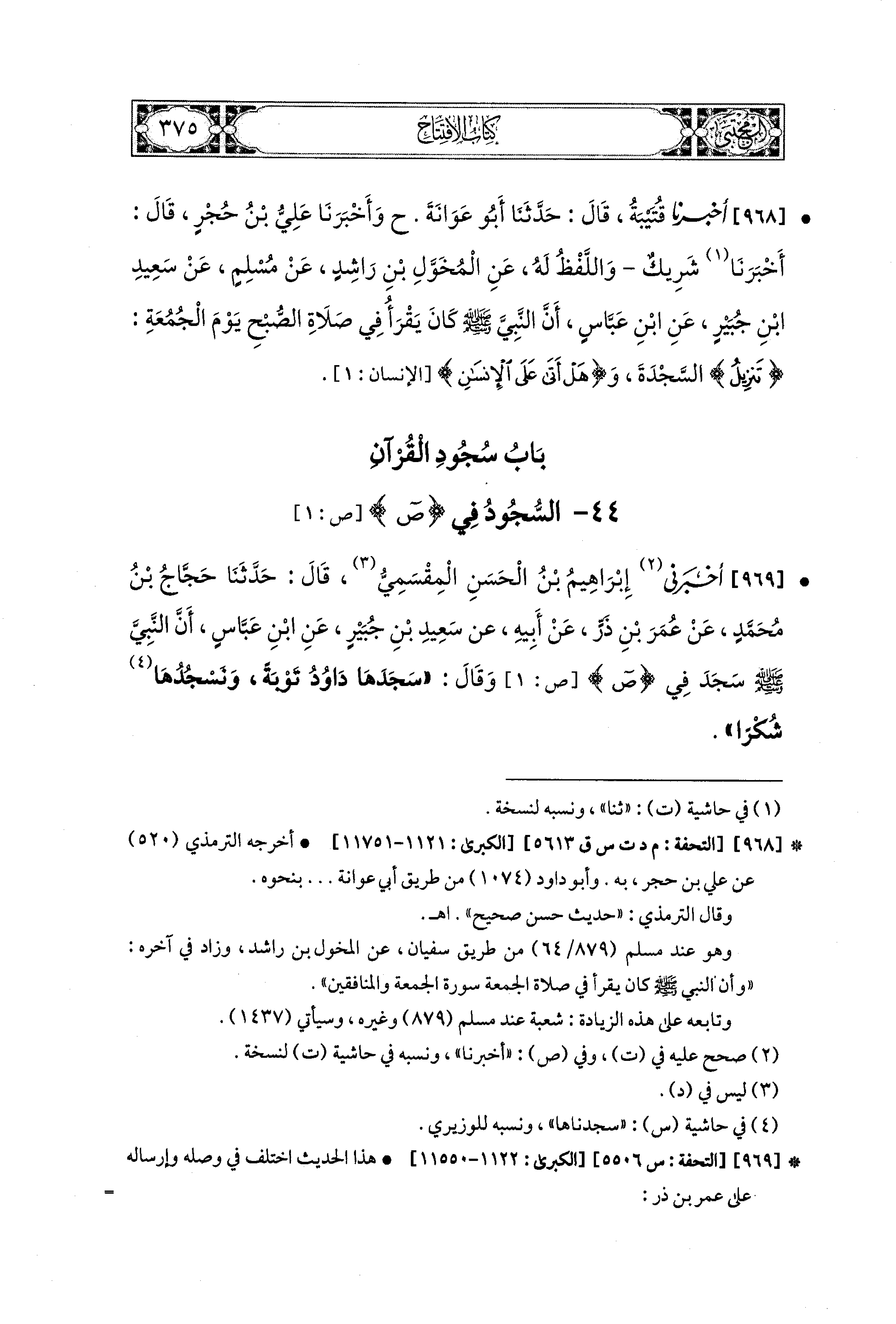 969- أَخبَرني إِبراهِيمُ بنُ الحَسَنِ المِقْسَمِيُّ، قال: حَدثنا حَجَّاجُ بنُ مُحَمدٍ، عَن عُمَرَ بنُ ذَرٍّ، عَن أَبيهِ، عَن سَعيدِ بْنِ جُبَيْرٍ، عَنِ ابنِ عَبَّاسٍ، أَنَّ النَّبيَّ صَلى الله عَليه وسَلم سَجَدَ فِي {ص} وَقَالَ: سَجَدَهَا دَاوُدُ تَوْبَةً، وَنَسْجُدُهَا شُكْرًا.