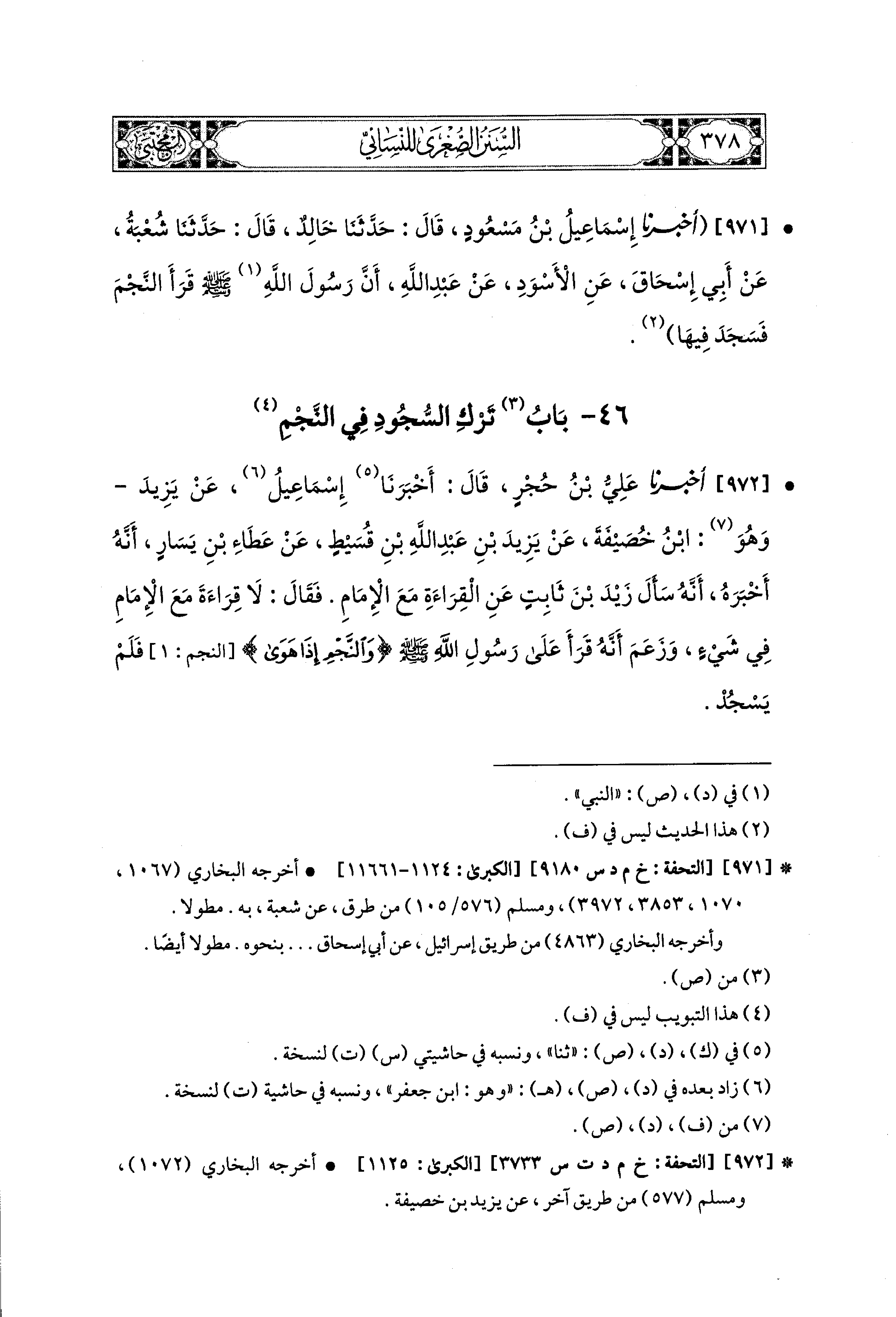 971- أَخبَرنا إِسماعِيلُ بنُ مَسْعُودٍ، قال: حَدثنا خَالِدٌ، قال: حَدثنا شُعبَةُ، عَن أَبي إِسحَاقَ، عَنِ الأَسْوَدِ، عَن عَبدِ اللهِ، أَنَّ رَسُولَ اللهِ صَلى الله عَليه وسَلم قَرَأَ النَّجْمَ فَسَجَدَ فِيهَا.