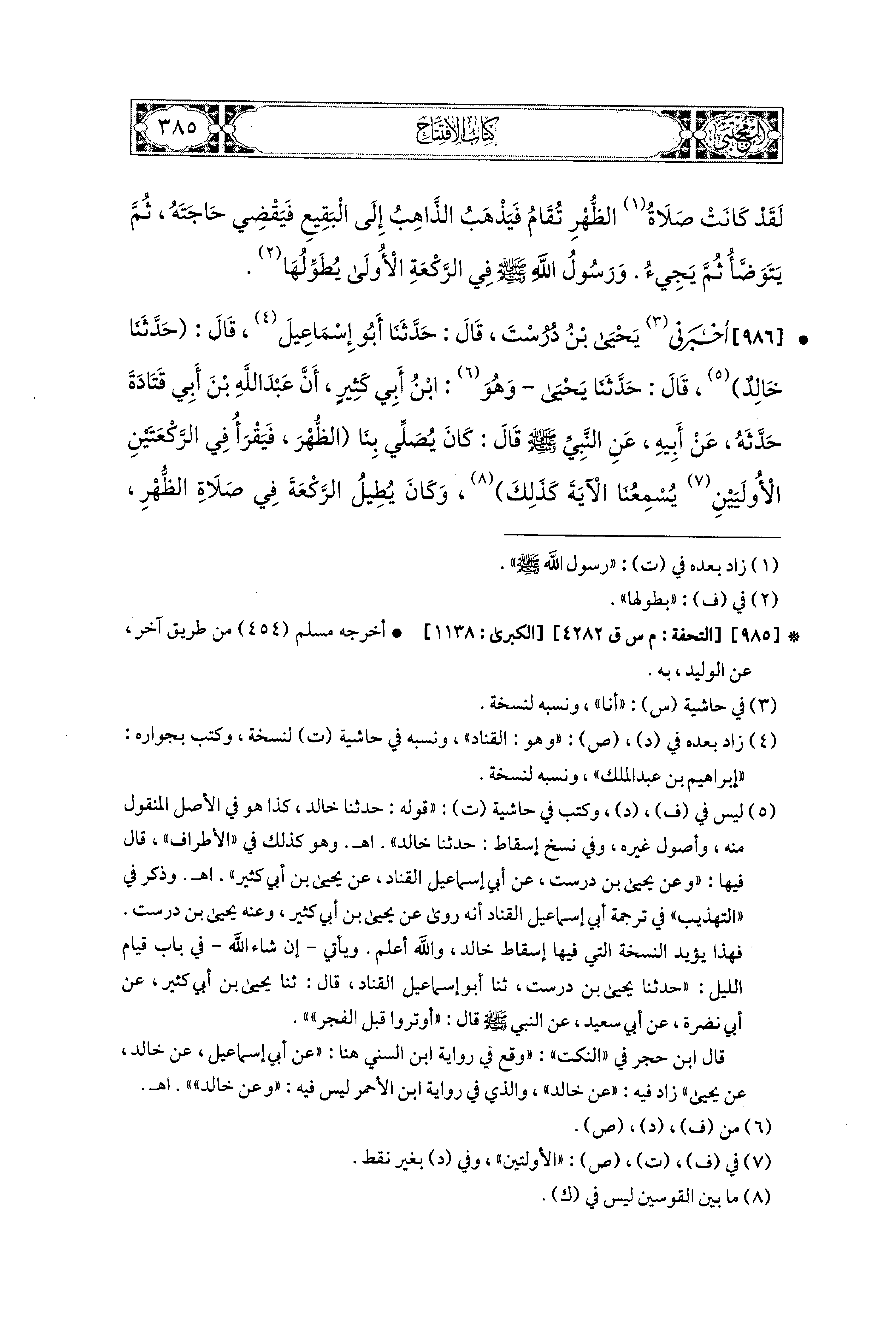 986- أَخبَرني يَحيَى بنُ دُرُسْتَ، قال: حَدثنا أَبو إِسماعِيلَ، قال: حَدثنا خَالِدٌ، قال: حَدثنا يَحيَى وَهُوَ ابنُ أَبي كَثِيرٍ، أَنَّ عَبدَ اللهِ بْنَ أَبي قَتَادَةَ حَدَّثَهُ، عَن أَبيهِ، عَنِ النَّبيِّ صَلى الله عَليه وسَلم قَالَ: كَانَ يُصَلِّي بِنَا الظُّهْرَ فَيَقْرَأُ فِي الرَّكْعَتَيْنِ الأُولَيَيْنِ يُسْمِعُنَا الآيَةَ، كَذَلِكَ وَكَانَ يُطِيلُ الرَّكْعَةَ فِي صَلاَةِ الظُّهْرَ وَالرَّكْعَةَ الأُولَى، يَعْني، فِي صَلاَةِ الصُّبْحِ.