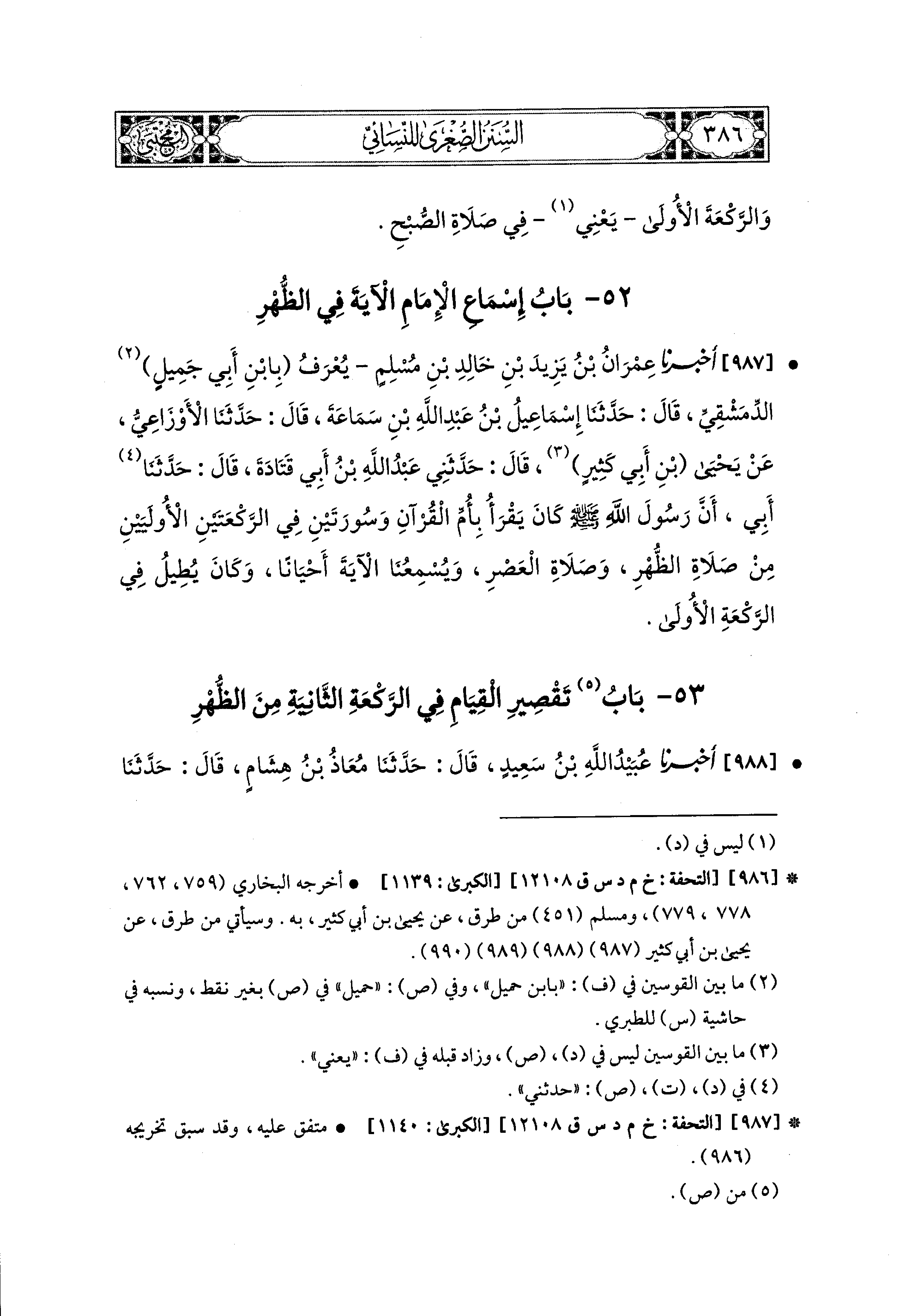 987- أَخبَرنا عِمْرَانُ بنُ يَزِيدَ بْنِ خَالِدِ بْنِ مُسْلِمٍ، يُعْرَفُ بِابنِ أَبي جَمِيلٍ الدِّمَشْقِيِّ، قال: حَدثنا إِسماعِيلُ بنُ عَبدِ اللهِ بْنِ سَمَاعَةَ، قال: حَدثنا الأَوْزَاعِيُّ، عَن يَحيَى بْنِ أَبي كَثِيرٍ، قَالَ: حَدَّثَني عَبدُ اللهِ بنُ أَبي قَتَادَةَ، قال: حَدثنا أَبي، أَنَّ رَسُولَ اللهِ صَلى الله عَليه وسَلم كَانَ يَقْرَأُ بِأُمِّ القُرْآنِ وَسُورَتَيْنِ فِي الرَّكْعَتَيْنِ الأُولَيَيْنِ مِنْ صَلاَةِ الظُّهْرِ وَصَلاَةِ العَصْرِ، وَيُسْمِعُنَا الآيَةَ أَحْيَانًا، وَكَانَ يُطِيلُ فِي الرَّكْعَةِ الأُولَى.