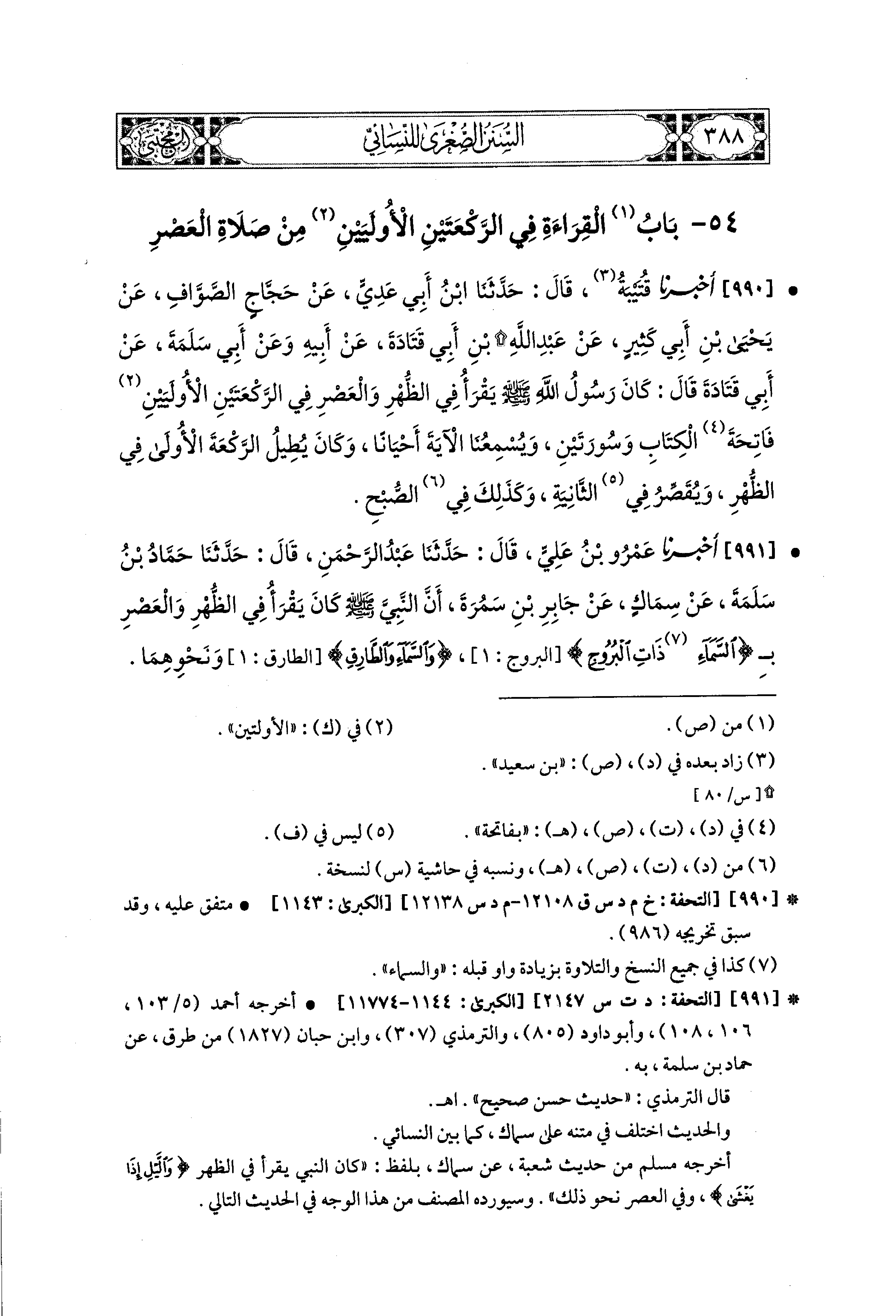 991- أَخبَرنا عَمْرُو بنُ عَلِيٍّ، قال: حَدثنا عَبدُ الرَّحْمَنِ، قال: حَدثنا حَمَّادُ بنُ سَلَمَةَ، عَن سِمَاكٍ، عَن جَابِرِ بْنِ سَمُرَةَ، أَنَّ النَّبيَّ صَلى الله عَليه وسَلم كَانَ يَقْرَأُ فِي الظُّهْرِ وَالعَصْرِ بِـ {السَّمَاءِ ذَاتِ البُرُوجِ}، {وَالسَّمَاءِ وَالطَّارِقِ} وَنَحْوِهِمَا.