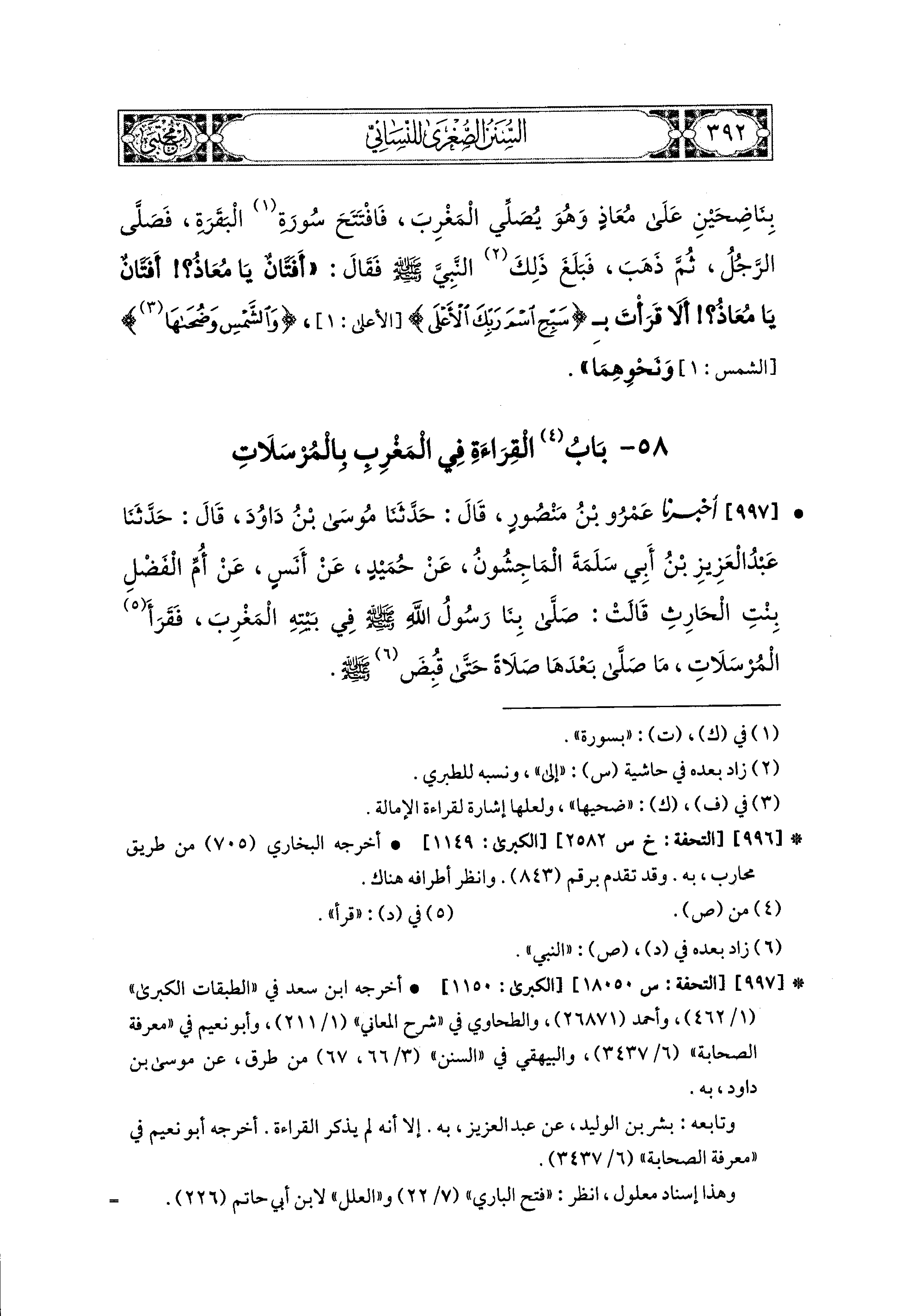 997- أَخبَرنا عَمْرُو بنُ مَنْصُورٍ، قال: حَدثنا مُوسَى بنُ دَاوُدَ، قال: حَدثنا عَبدُ العَزِيزِ بنُ أَبي سَلَمَةَ المَاجِشُونُ، عَن حُمَيدٍ، عَن أَنَسٍ، عَن أُمِّ الفَضْلِ بِنْتِ الحَارِثِ قَالَتْ: صَلَّى بِنَا رَسُولُ اللهِ صَلى الله عَليه وسَلم فِي بَيْتِهِ المَغْرِبَ فَقَرَأَ المُرْسَلاَتِ مَا صَلَّى بَعْدَهَا صَلاَةً حَتَّى قُبِضَ صَلى الله عَليه وسَلم.