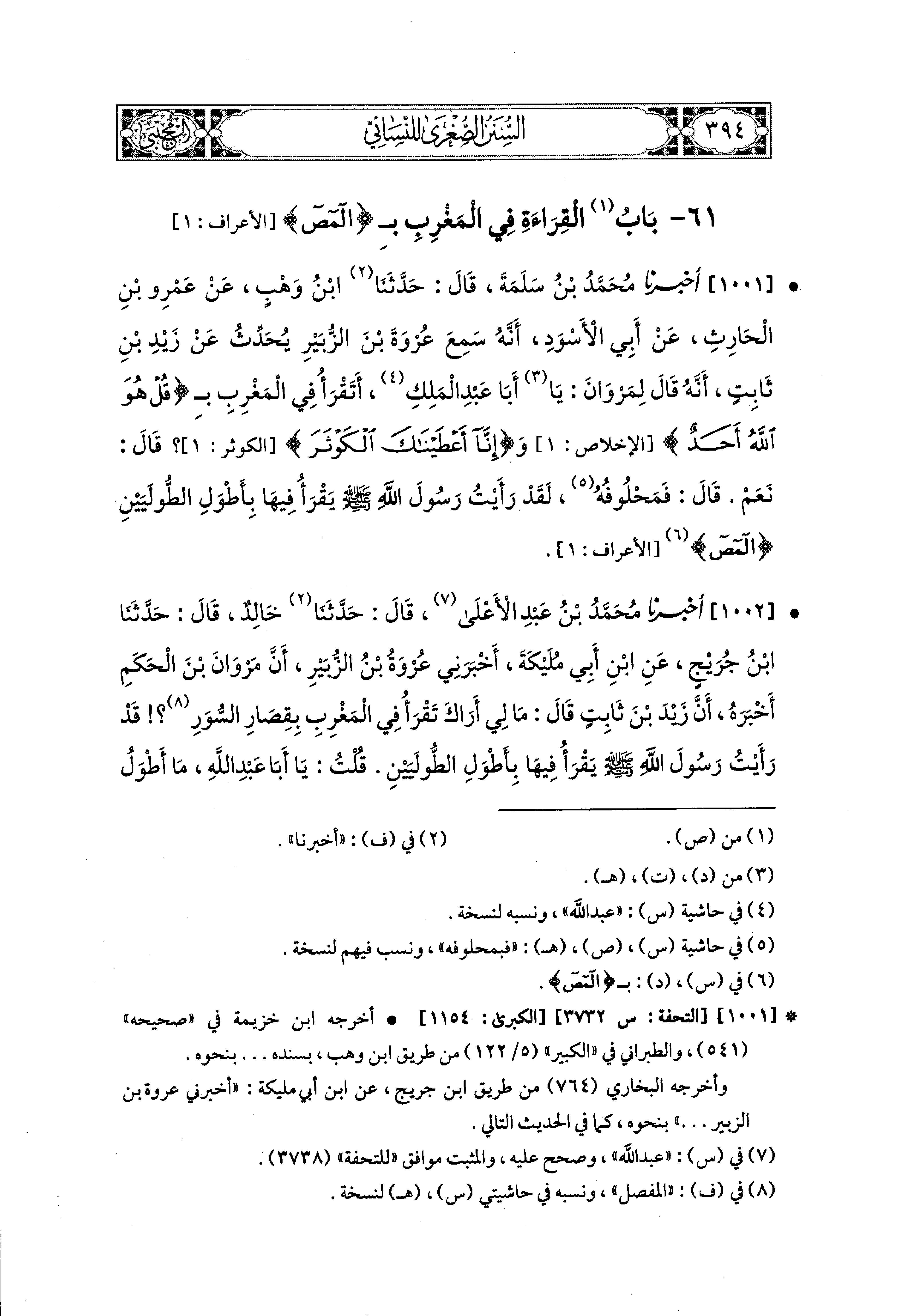 1001- أَخبَرنا مُحَمد بنُ سَلَمَةَ، قال: حَدثنا ابنُ وَهْبٍ، عَن عَمْرِو بْنِ الحَارِثِ، عَن أَبي الأَسْوَدِ، أَنَّهُ سَمِعَ عُرْوَةَ بْنَ الزُّبَيْرِ يُحَدِّثُ، عَن زَيْدِ بْنِ ثَابِتٍ، أَنَّهُ قَالَ لِمَرْوَانَ: يَا أَبَا عَبدِ المَلِكِ أَتَقْرَأُ فِي المَغْرِبِ بِـ {قُلْ هُوَ اللهُ أَحَدٌ} وَ {إِنَّا أَعْطَيْنَاكَ الكَوْثَرَ}؟ قَالَ: نَعَمْ، قَالَ: فَمَحْلُوفَةٌ لَقَدْ رَأَيْتُ رَسُولَ اللهِ صَلى الله عَليه وسَلم يَقْرَأُ فِيهَا بِأَطْوَلِ الطُّولَيَيْنِ {المص}.