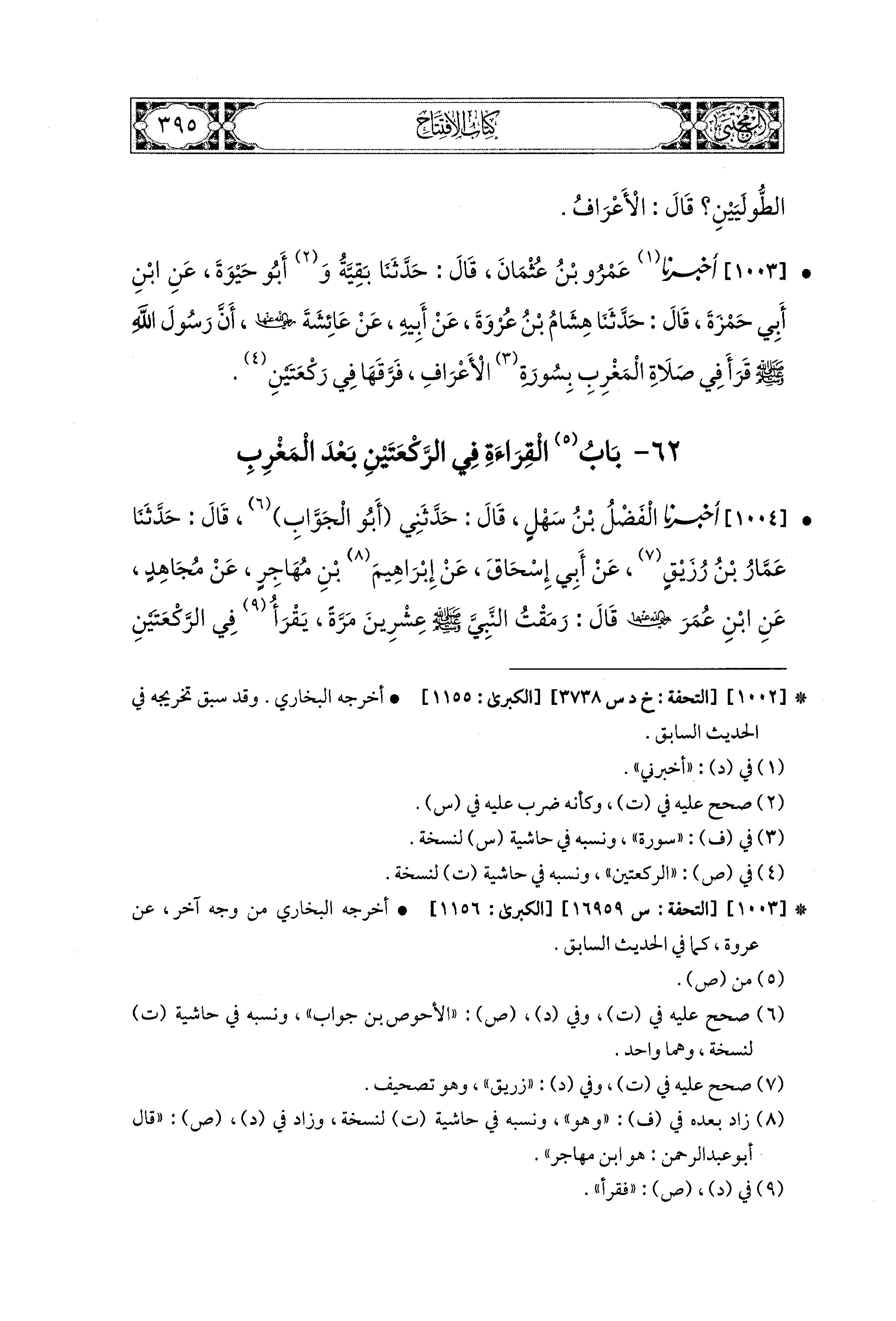 1003- أَخبَرنا عَمْرُو بنُ عُثمَانَ، قال: حَدثنا بَقِيَّةُ، وَأَبو حَيْوَةَ، عَنِ ابنِ أَبي حَمْزَةَ، قال: حَدثنا هِشَامُ بنُ عُرْوَةَ، عَن أَبيهِ، عَن عَائِشَةَ رَضِيَ اللهُ عَنهَا، أَنَّ رَسُولَ اللهِ صَلى الله عَليه وسَلم قَرَأَ فِي صَلاَةِ المَغْرِبِ بِسُورَةِ الأَعْرَافِ فَرَّقَهَا فِي رَكْعَتَيْنِ.