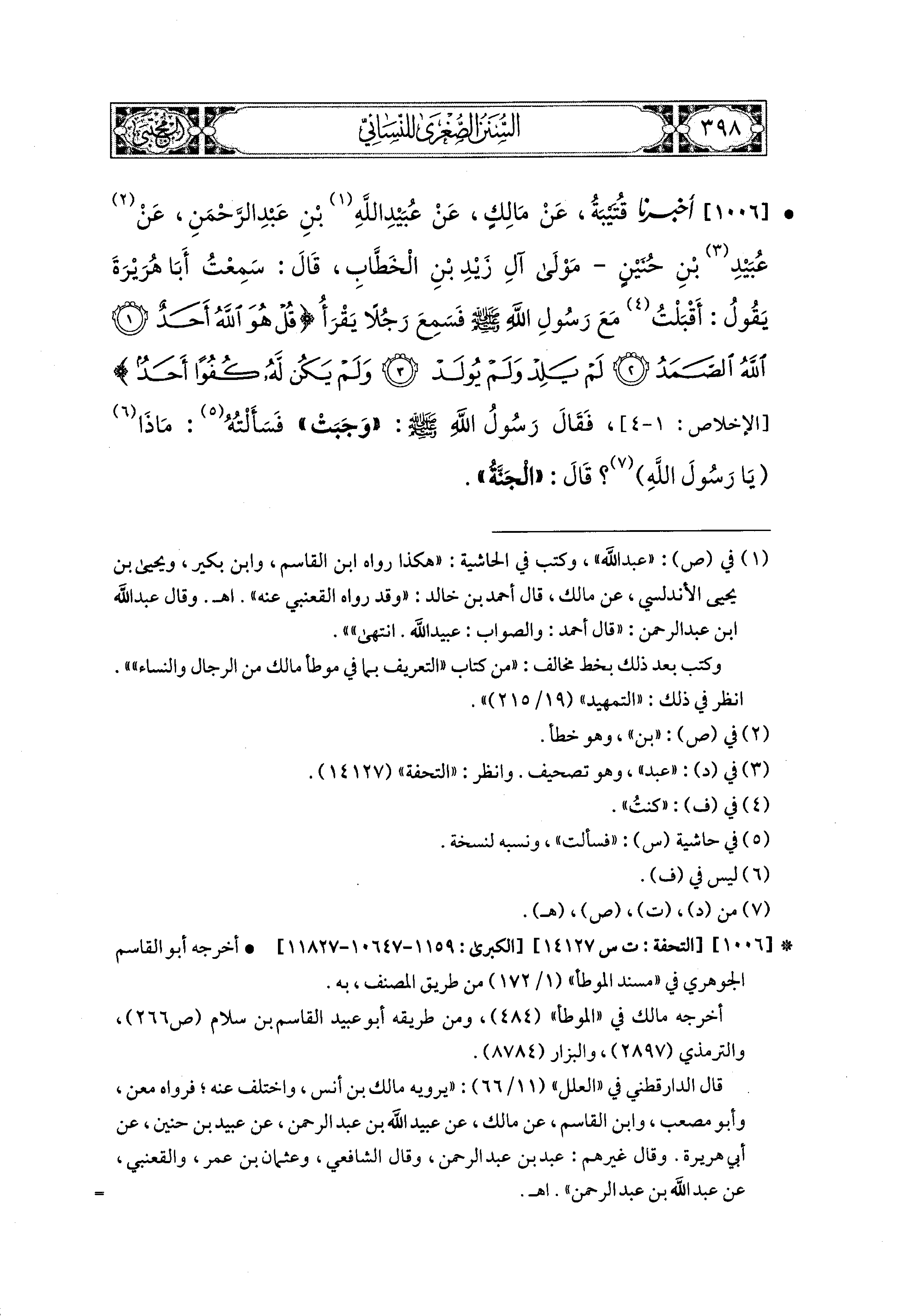 1006- أَخبَرنا قُتَيبَةُ، عَن مَالِكٍ، عَن عُبَيدِ اللهِ بْنِ عَبدِ الرَّحْمَنِ، عَن عُبَيدِ بْنِ حُنَيْنٍ، مَوْلَى آلِ زَيْدِ بْنِ الخَطَّابِ، قَالَ: سَمِعْتُ أَبَا هُرَيْرَةَ يَقُولُ: أَقْبَلْتُ مَعَ رَسُولِ اللهِ صَلى الله عَليه وسَلم فَسَمِعَ رَجُلاً يَقْرَأُ: {قُلْ هُوَ اللهِ أَحَدٌ, اللهُ الصَّمَدُ، لَمْ يَلِدْ وَلَمْ يُولَدْ، وَلَمْ يَكُنْ لَهُ كُفُوًا أَحَدٌ}، فَقَالَ رَسُولِ اللهُ صَلى الله عَليه وسَلم: وَجَبَتْ، فَسَأَلْتُهُ مَاذَا يَا رَسُولَ اللهِ؟ قَالَ: الجَنَّةُ.