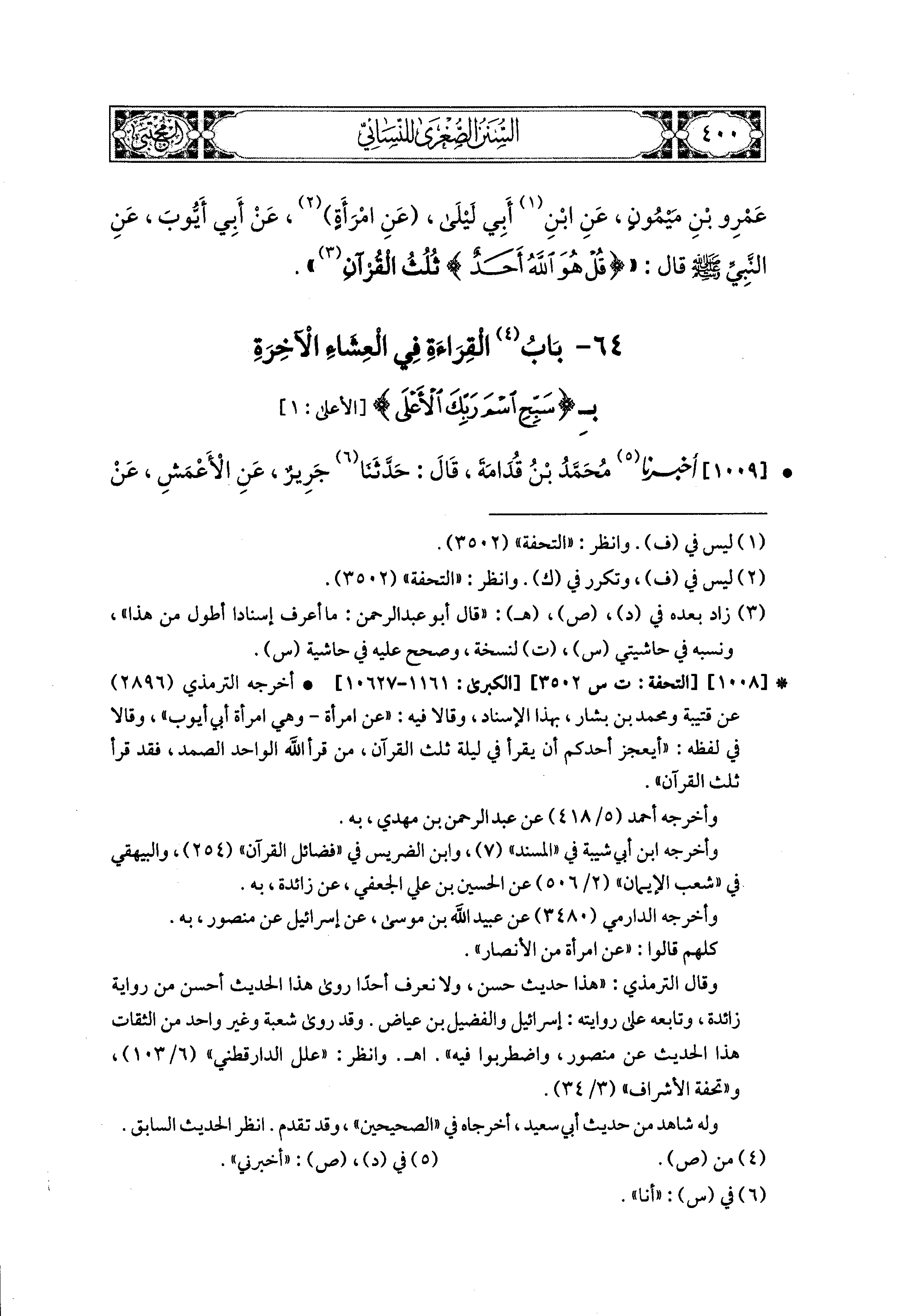 1009- أَخبَرنا مُحَمد بنُ قُدَامَةَ، قال: حَدثنا جَرِيرٌ، عَنِ الأَعْمَشِ، عَن مُحَارِبِ بْنِ دِثَارٍ، عَن جَابِرٍ قَالَ: قَامَ مُعَاذٌ فَصَلَّى العِشَاء الآخِرَةَ فَطَوَّلَ، فَقَالَ النَّبيُّ صَلى الله عَليه وسَلم: أَفَتَّانٌ يَا مُعَاذُ؟ أَفَتَّانٌ يَا مُعَاذُ؟ أَيْنَ كُنْتَ عَن {سَبِّحِ اسْمَ رَبِّكَ الأَعْلَى}، {وَالضُّحَى} وَ {إِذَا السَّمَاءُ انْفَطَرَتْ}؟.