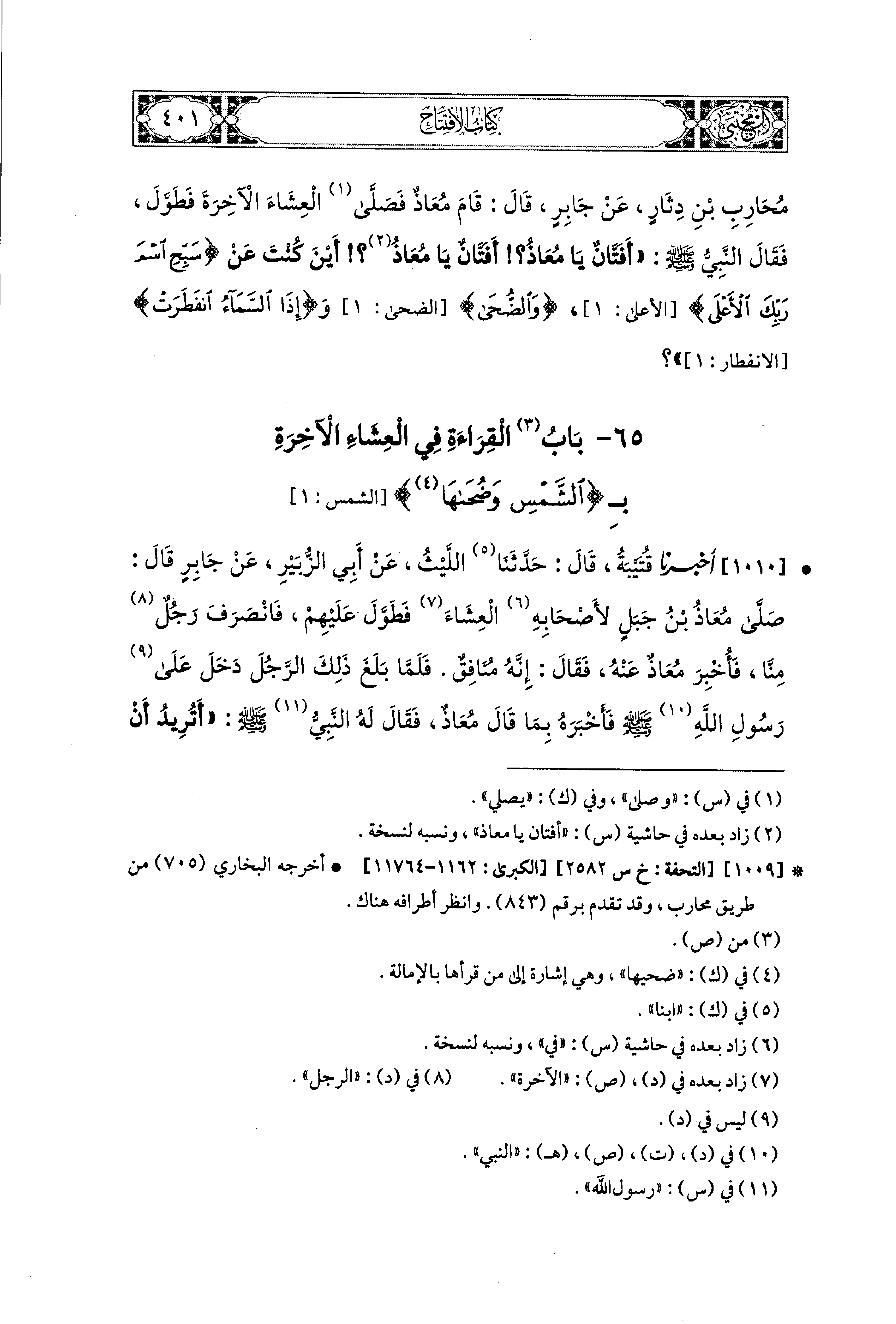 1010- أَخبَرنا قُتَيبَةُ، قال: حَدثنا اللَّيْثُ، عَن أَبي الزُّبَيْرِ، عَن جَابِرٍ قَالَ: صَلَّى مُعَاذُ بنُ جَبَلٍ لأَصْحَابِهِ العِشَاءَ، فَطَوَّلَ عَلَيهِمْ فَانْصَرَفَ رَجُلٌ مِنَّا، فَأُخْبِرَ مُعَاذٌ عَنهُ، فَقَالَ: إِنَّهُ مُنَافِقٌ، فَلَمَّا بَلَغَ ذَلِكَ الرَّجُلَ دَخَلَ عَلَى رَسُولِ اللهِ صَلى الله عَليه وسَلم فَأَخْبَرَهُ بِمَا قَالَ مُعَاذٌ، فَقَالَ لَهُ النَّبيِّ صَلى الله عَليه وسَلم: أَتُرِيدُ أَنْ تَكُونَ فَتَّانًا يَا مُعَاذُ؟ إِذَا أَمَمْتَ النَّاسَ فَاقْرَأْ بِـ {والشَّمْسِ وَضُحَاهَا} وَ {سَبِّحِ اسْمَ رَبِّكَ الأَعْلَى} {واللَّيلِ إِذَا يَغْشَى} وَ {اقْرَأْ بِاسْمِ رَبِّكَ الَّذِي خَلَقْ}.