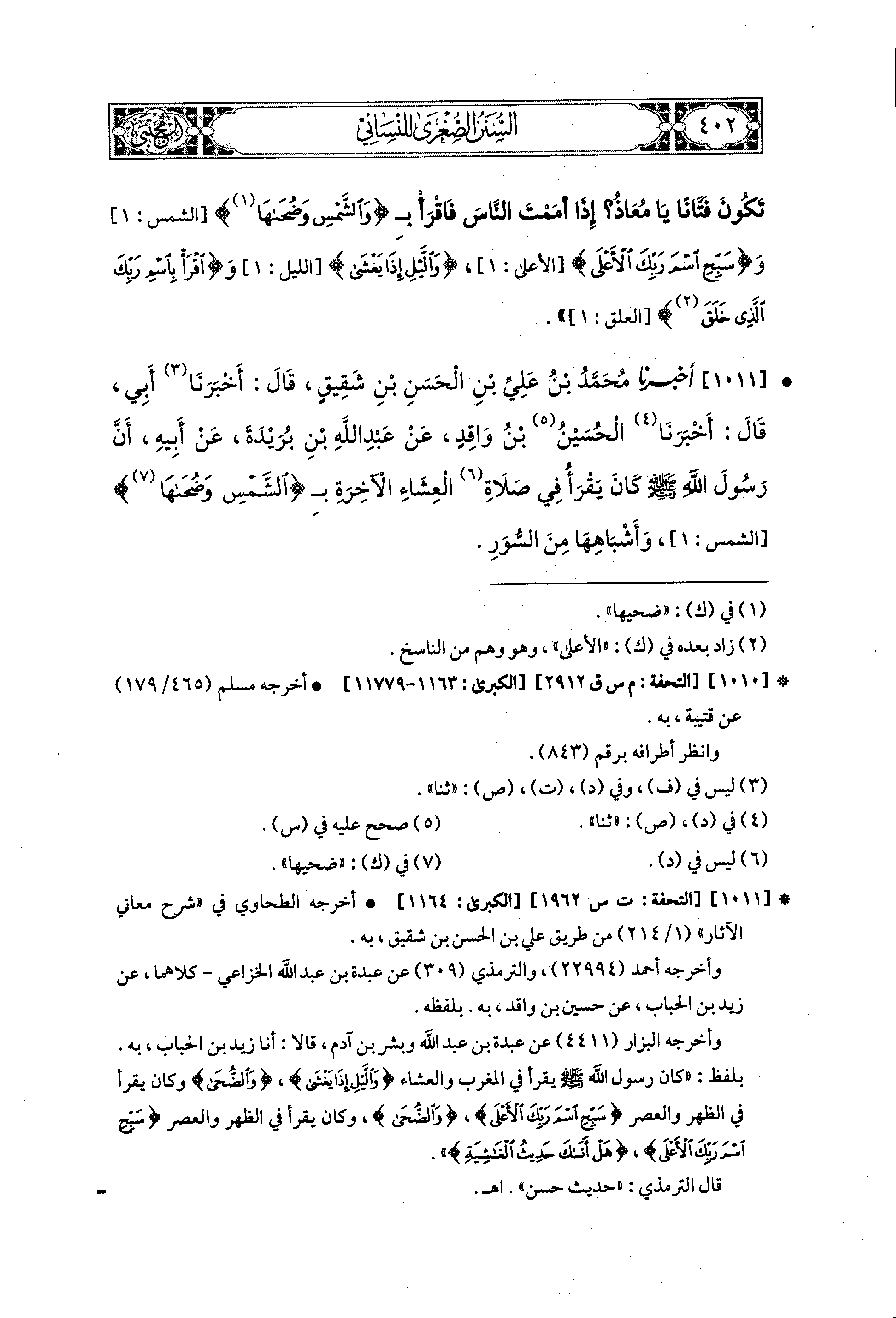 1011- أَخبَرنا مُحَمد بنُ عَلِيِّ بْنِ الحَسَنِ بْنِ شَقِيقٍ، قال: أَخبَرَنا أَبي، قَالَ: أَخبَرنا الحُسَيْنُ بنُ وَاقِدٍ، عَن عَبد اللهِ بن بُرَيْدَةَ، عَن أَبيهِ، أَنَّ رَسُولَ اللهِ صَلى الله عَليه وسَلم كَانَ يَقْرَأُ فِي صَلاَةِ العِشَاء الآخِرَةِ بِـ {الشَّمْسِ وَضُحَاهَا}، وَأَشْبَاهِهَا مِنَ السُّوَرِ.