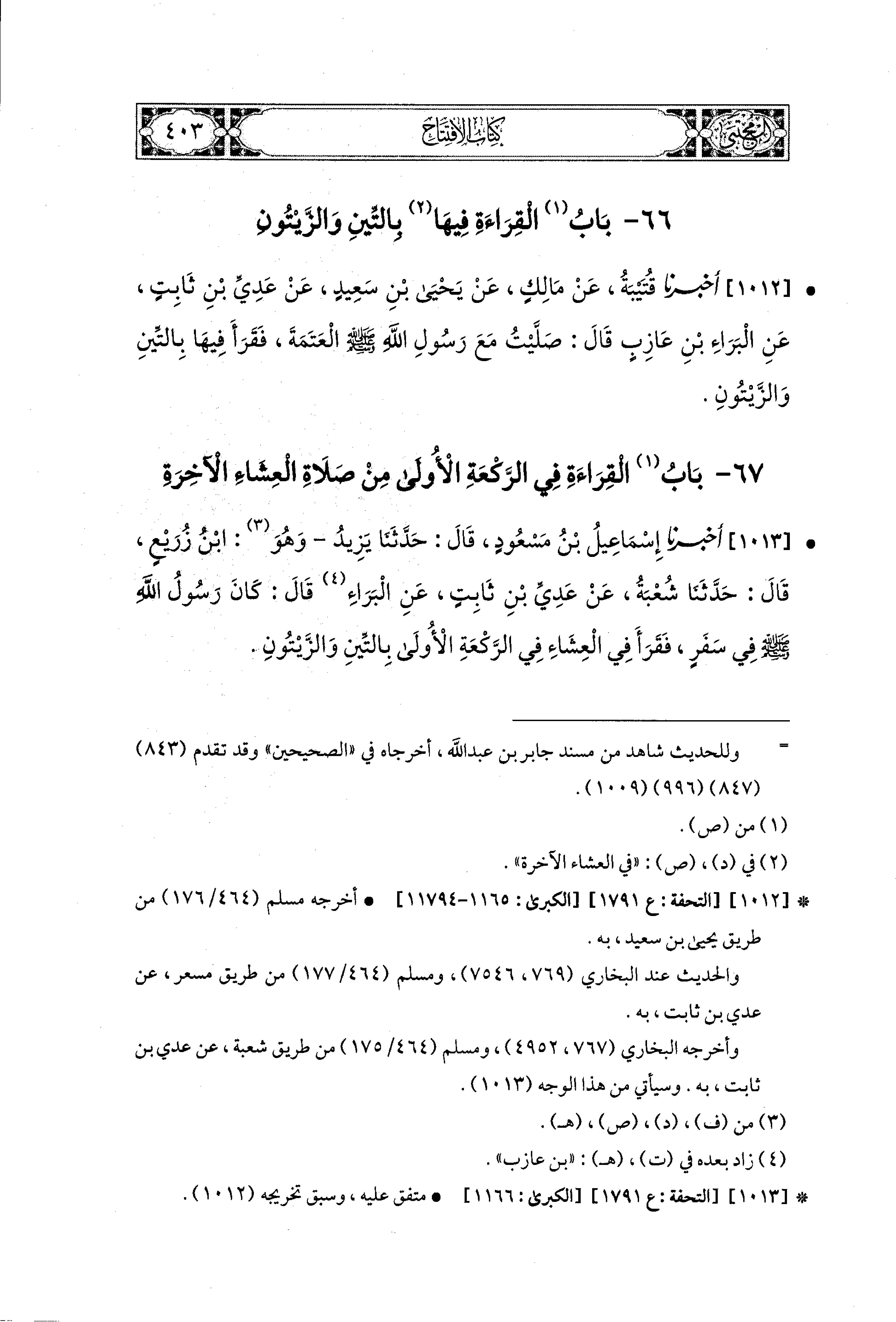 1013- أَخبَرنا إِسماعِيلُ بنُ مَسْعُودٍ، قال: حَدثنا يَزِيدُ وَهُوَ ابنُ زُرَيْعٍ، قال: حَدثنا شُعبَةُ، عَن عَدِيِّ بْنِ ثَابِتٍ، عَنِ البَرَاءِ قَالَ: كَانَ رَسُولُ اللهِ صَلى الله عَليه وسَلم فِي سَفَرٍ فَقَرَأَ فِي العِشَاء فِي الرَّكْعَةِ الأُولَى بِالتِّينِ وَالزَّيْتُونِ.