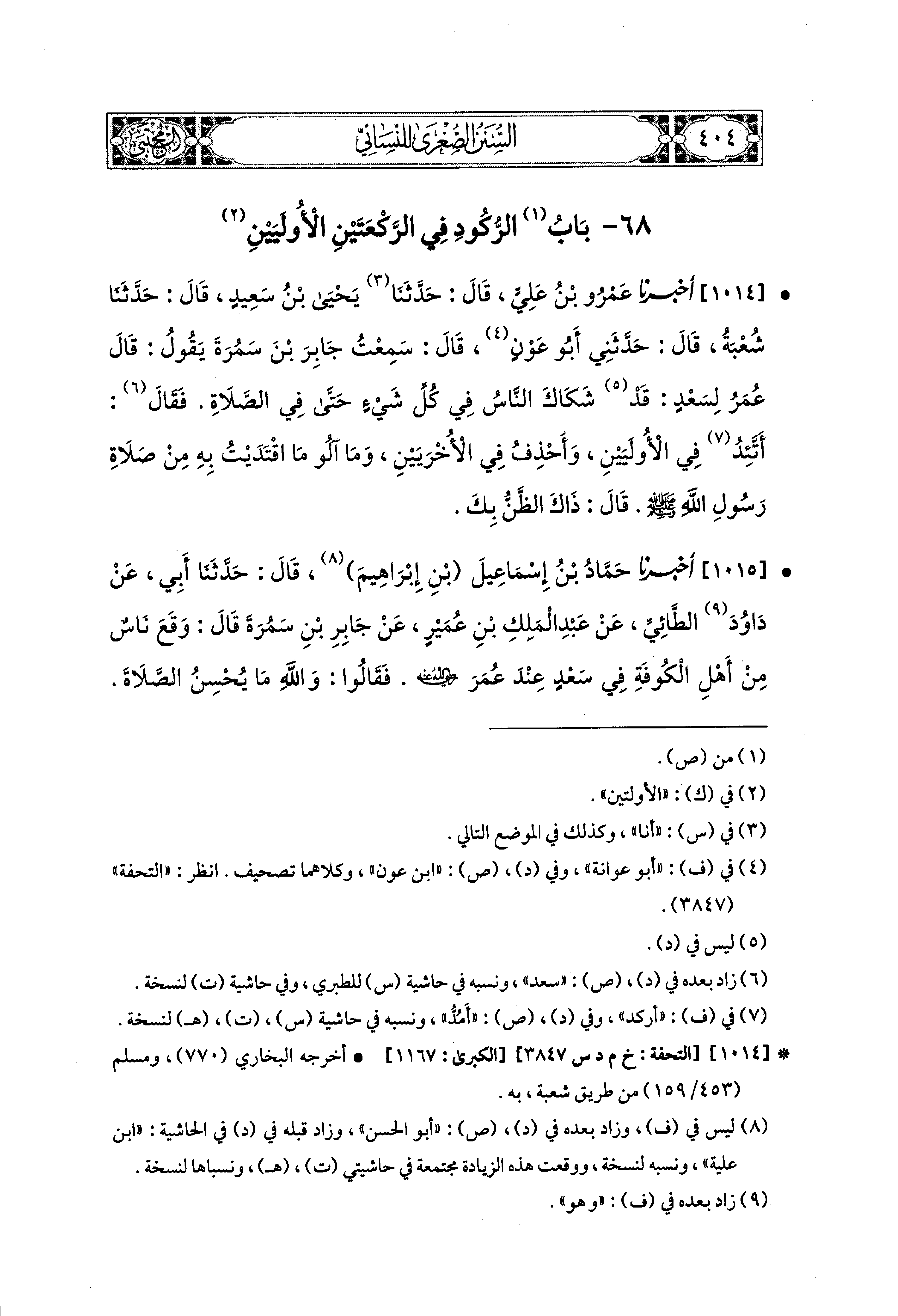 1014- أَخبَرنا عَمْرُو بنُ عَلِيٍّ، قال: حَدثنا يَحيَى بنُ سَعيدٍ، قال: حَدثنا شُعبَةُ، قَالَ: حَدَّثَني أَبو عَوْنٍ، قَالَ: سَمِعْتُ جَابِرَ بْنَ سَمُرَةَ يَقُولُ: قَالَ عُمَرُ لِسَعْدٍ قَدْ شَكَاكَ النَّاسُ فِي كُلِّ شَيْءٍ حَتَّى فِي الصَّلاَةِ، فَقَالَ: أَتَّئِدُ فِي الأُولَيَيْنِ، وَأَحْذِفُ فِي الأُخْرَيَيْنِ، وَمَا آلُو مَا اقْتَدَيْتُ بِهِ مِنْ صَلاَةِ رَسُولِ اللهِ صَلى الله عَليه وسَلم، قَالَ: ذَاكَ الظَّنُّ بِكَ.