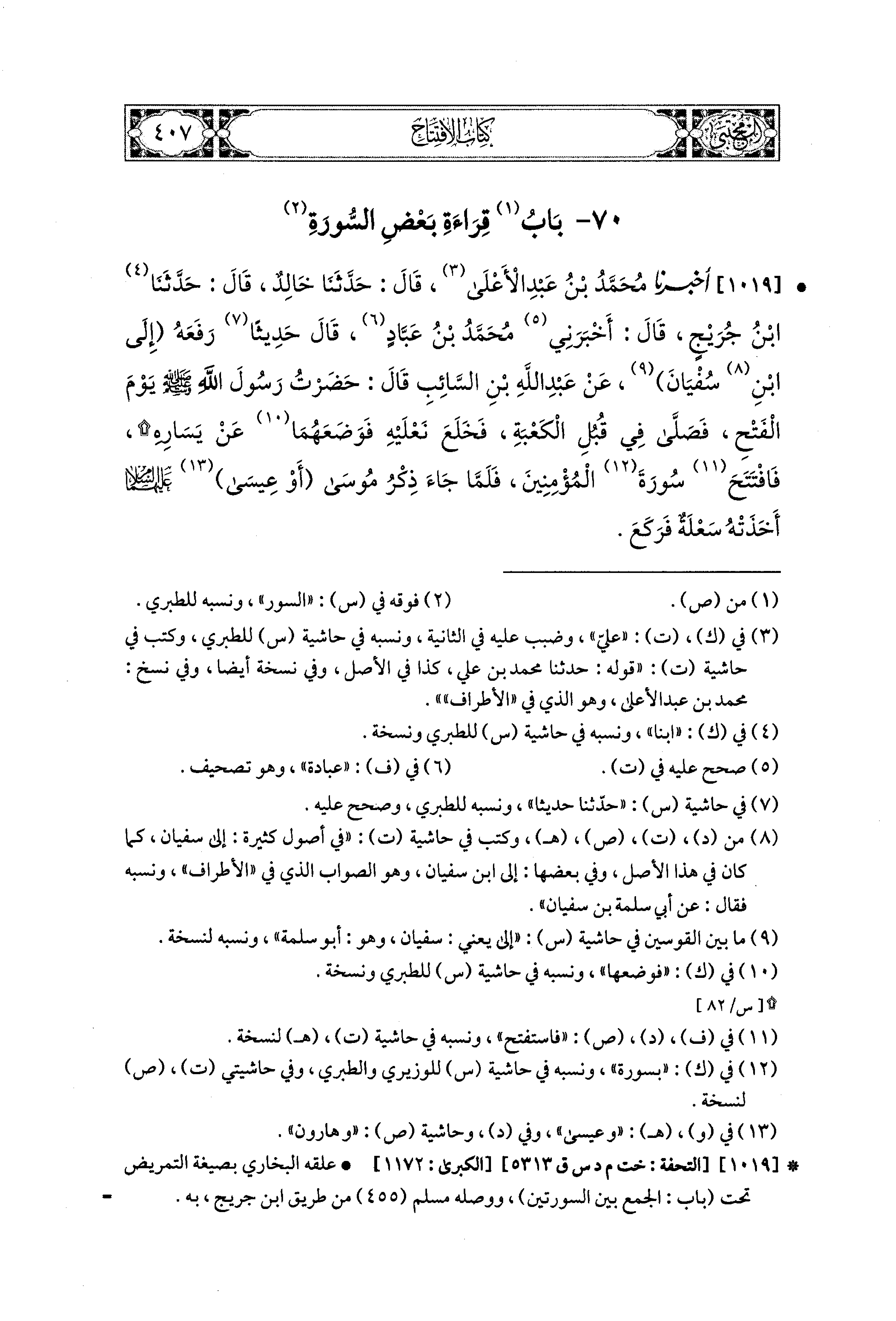1019- أَخبَرنا مُحَمد بن عَبدِ الأَعلَى، قال: حَدثنا خَالِدٌ، قال: حَدثنا ابنُ جُرَيْجٍ، قَالَ: أَخبَرني مُحَمدُ بنُ عَبَّادٍ قال: حَدِيثًا رَفَعَهُ إِلَى ابنِ سُفيَانَ، عَن عَبد اللهِ بن السَّائِبِ، قَالَ: حَضَرْتُ رَسُولَ اللهِ صَلى الله عَليه وسَلم يَوْمَ الفَتْحِ فَصَلَّى فِي قُبُلِ الكَعْبَةِ، فَخَلَعَ نَعْلَيْهِ فَوَضَعَهُمَا عَن يَسَارِهِ، فَافْتَتَحَ سُورَةِ المُؤْمِنينَ، فَلَمَّا جَاءَ ذِكْرُ مُوسَى، أَوْ عِيسَى عَلَيهِمَا السَّلاَمُ أَخَذَتْهُ سَعْلَةٌ فَرَكَعَ.