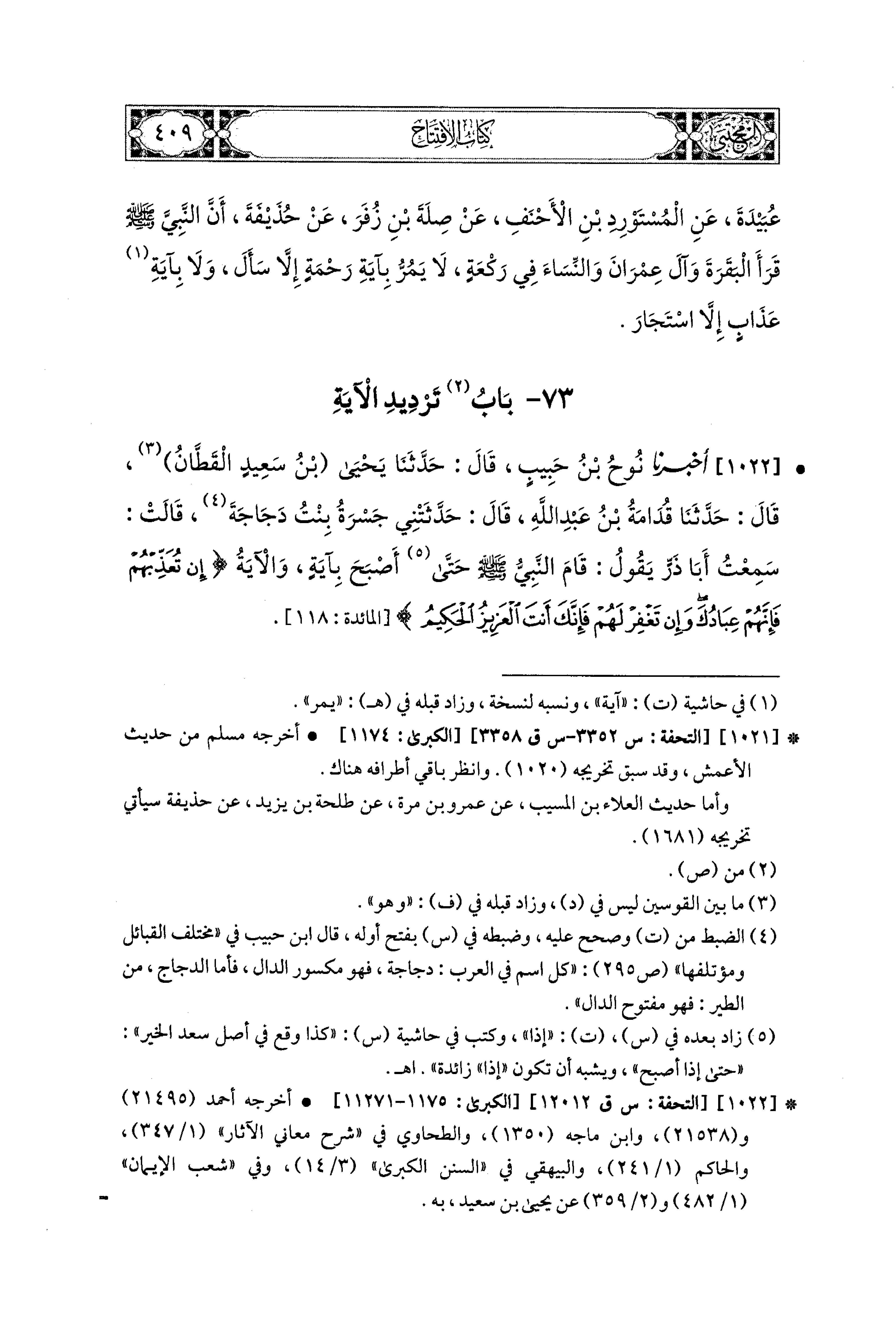 1022- أَخبَرنا نُوحُ بنُ حَبِيبٍ، قال: حَدثنا يَحيَى بنُ سَعيدٍ القَطَّانُ، قال: حَدثنا قُدَامَةُ بنُ عَبدِ اللهِ قَالَ: حَدَّثَتْني جَسْرَةُ بِنْتُ دَجَاجَةَ قَالَتْ: سَمِعْتُ أَبَا ذَرٍّ يَقُولُ: قَامَ النَّبيُّ صَلى الله عَليه وسَلم حَتَّى إِذَا أَصْبَحَ بِآيَةٍ، وَالآيَةُ {إِنْ تُعَذِّبْهُمْ فَإِنَّهُمْ عِبَادُكَ، وَإِنْ تَغْفِرْ لَهُمْ فَإِنَّكَ أَنْتَ العَزِيزُ الحَكِيمُ}.