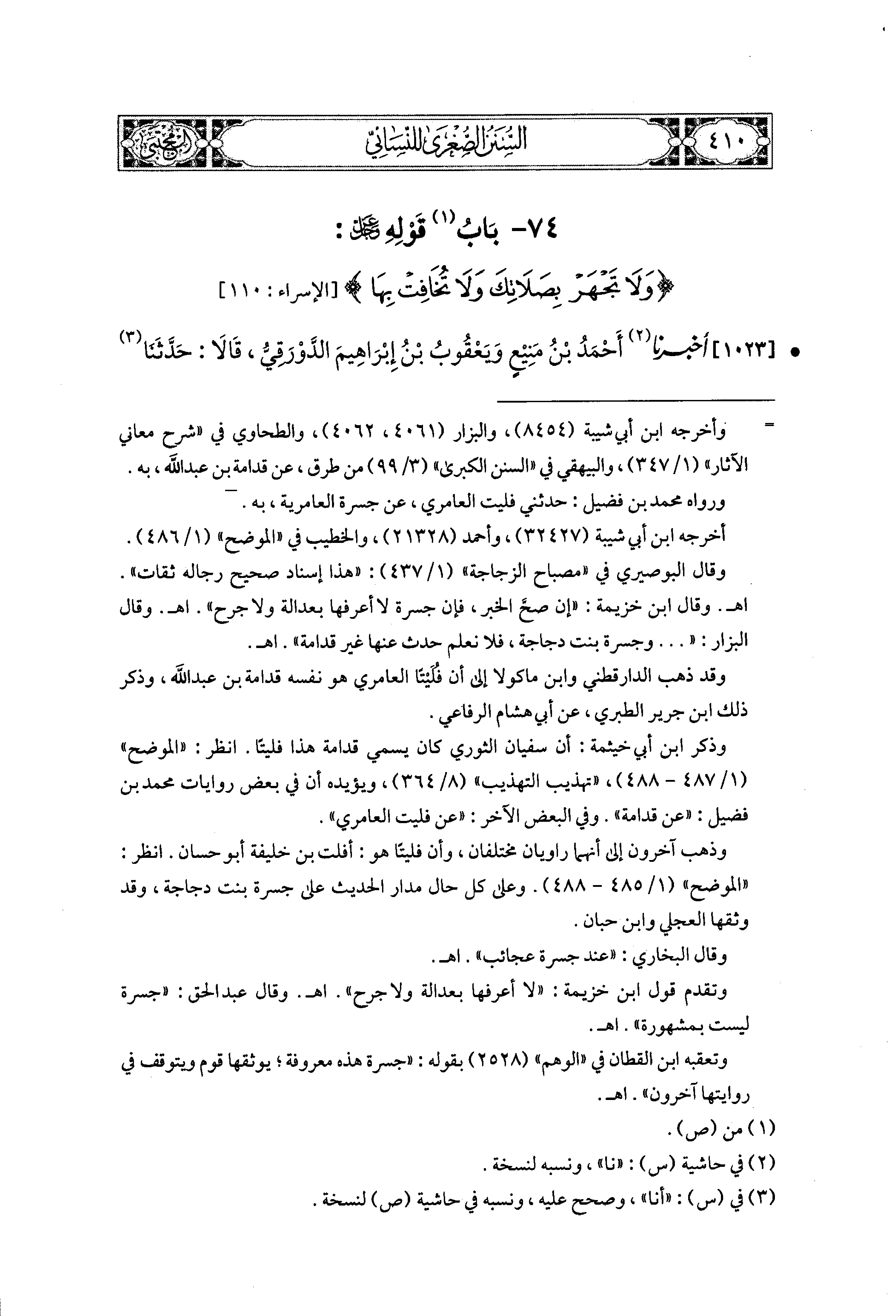 1023- أَخبَرنا أَحْمَدُ بنُ مَنيعٍ، وَيَعقُوبُ بنُ إِبراهِيمَ الدَّوْرَقِيُّ قَالاَ: حَدَّثَنَا هُشَيْمٌ، قال: أَخبَرَنا أَبو بِشْرٍ جَعْفَرُ بنُ أَبي وَحْشِيَّةَ، وَهُوَ ابنُ إِيَاسٍ، عَن سَعيدِ بْنِ جُبَيْرٍ، عَنِ ابنِ عَبَّاسٍ؛ فِي قَوْلِهِ عَزَّ وَجَلَّ: {وَلاَ تَجْهَرْ بِصَلاَتِكَ وَلاَ تُخَافِتْ بِهَا} قَالَ: نَزَلَتْ وَرَسُولُ اللهِ صَلى الله عَليه وسَلم مُخْتَفي بِمَكَّةَ، فَكَانَ إِذَا صَلَّى بِأَصْحَابِهِ رَفَعَ صَوْتَهُ، وَقَالَ ابنُ مَنيعٍ: يَجْهَرُ بِالقُرْآنِ، فَكَانَ المُشْرِكُونَ إِذَا سَمِعُوا صَوْتَهُ سَبُّوا القُرْآنَ وَمَنْ أَنْزَلَهُ وَمَنْ جَاءَ بِهِ، فَقَالَ اللهُ عَزَّ وَجَلَّ لِنَبِيِّهِ صَلى الله عَليه وسَلم: {وَلاَ تَجْهَرْ بِصَلاَتِكَ}: أَيْ بِقِرَاءَتِكَ فَيَسْمَعُ المُشْرِكُونَ فَيَسُبُّوا القُرْآنَ {وَلاَ تُخَافِتْ بِهَا}: عَن أَصْحَابِكَ فَلاَ يَسْمَعُوا {وَابْتَغِ بَيْنَ ذَلِكَ سَبِيلاً}.
