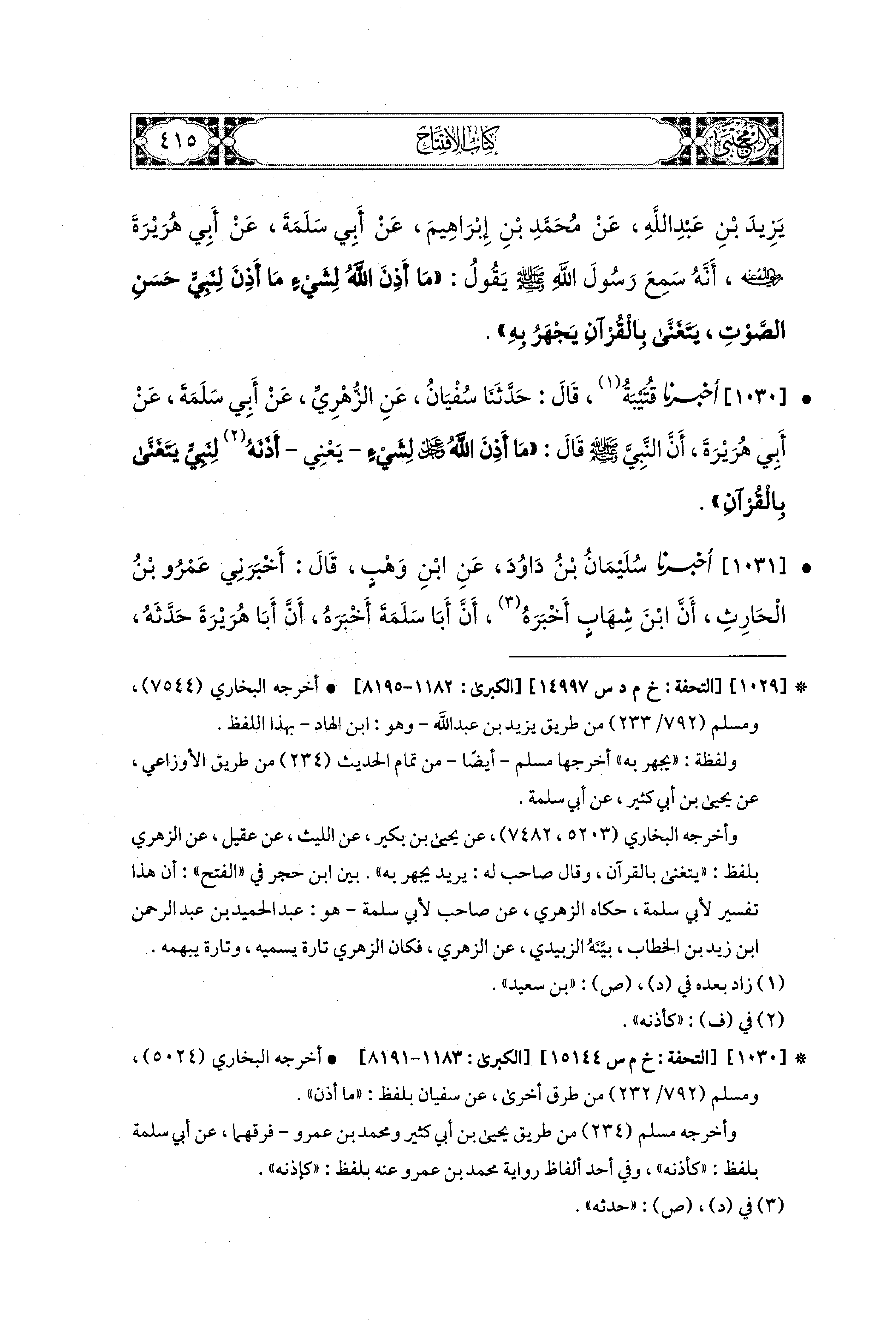 1030- أَخبَرنا قُتَيبَةُ، قال: حَدثنا سُفيَانُ، عَنِ الزُّهْرِيِّ، عَن أَبي سَلَمَةَ، عَن أَبي هُرَيْرَةَ، أَنَّ النَّبيَّ صَلى الله عَليه وسَلم قَالَ: مَا أَذِنَ اللهُ عَزَّ وَجَلَّ لِشَيْءٍ يَعْني أَذَنَهُ لِنَبِيٍّ يَتَغَنَّى بِالقُرْآنِ.