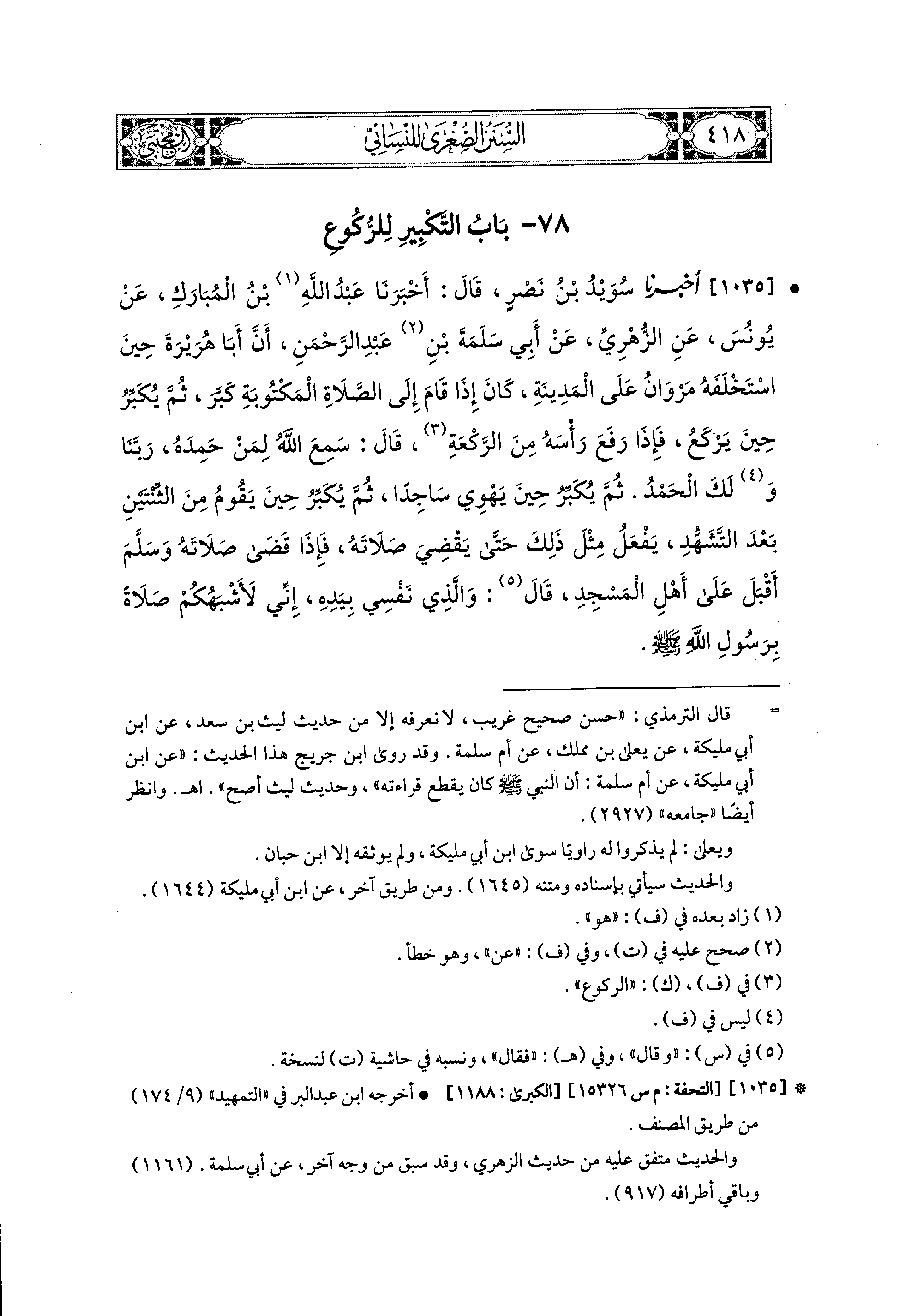 1035- أَخبَرنا سُوَيْدُ بنُ نَصْرٍ، قَالَ: أَخبَرنا عَبدُ اللهِ بنُ المُبَارَكِ، عَن يُونُسَ، عَنِ الزُّهْرِيِّ، عَن أَبي سَلَمَةَ بْنِ عَبدِ الرَّحْمَنِ، أَنَّ أَبَا هُرَيْرَةَ حِينَ اسْتَخْلَفَهُ مَرْوَانُ عَلَى المَدِينَةِ كَانَ إِذَا قَامَ إِلَى الصَّلاَةِ المَكْتُوبَةِ كَبَّرَ، ثُمَّ يُكَبِّرُ حِينَ يَرْكَعُ، فَإِذَا رَفَعَ رَأْسَهُ مِنَ الرَّكْعَةِ، قَالَ: سَمِعَ اللهُ لِمَنْ حَمِدَهُ رَبَّنَا وَلَكَ الحَمْدُ، ثُمَّ يُكَبِّرُ حِينَ يَهْوِي سَاجِدًا، ثُمَّ يُكَبِّرُ حِينَ يَقُومُ مِنَ الثِّنْتَيْنِ، بَعْدَ التَّشَهُّدِ يَفْعَلُ مِثْلَ ذَلِكَ حَتَّى يَقْضِيَ صَلاَتَهُ، فَإِذَا قَضَى صَلاَتَهُ وَسَلَّمَ أَقْبَلَ عَلَى أَهْلِ المَسْجِدِ، قَالَ: وَالَّذِي نَفْسِي بِيَدِهِ إِنِّي لأَشْبَهُكُمْ صَلاَةً بِرَسُولِ اللهِ صَلى الله عَليه وسَلم.