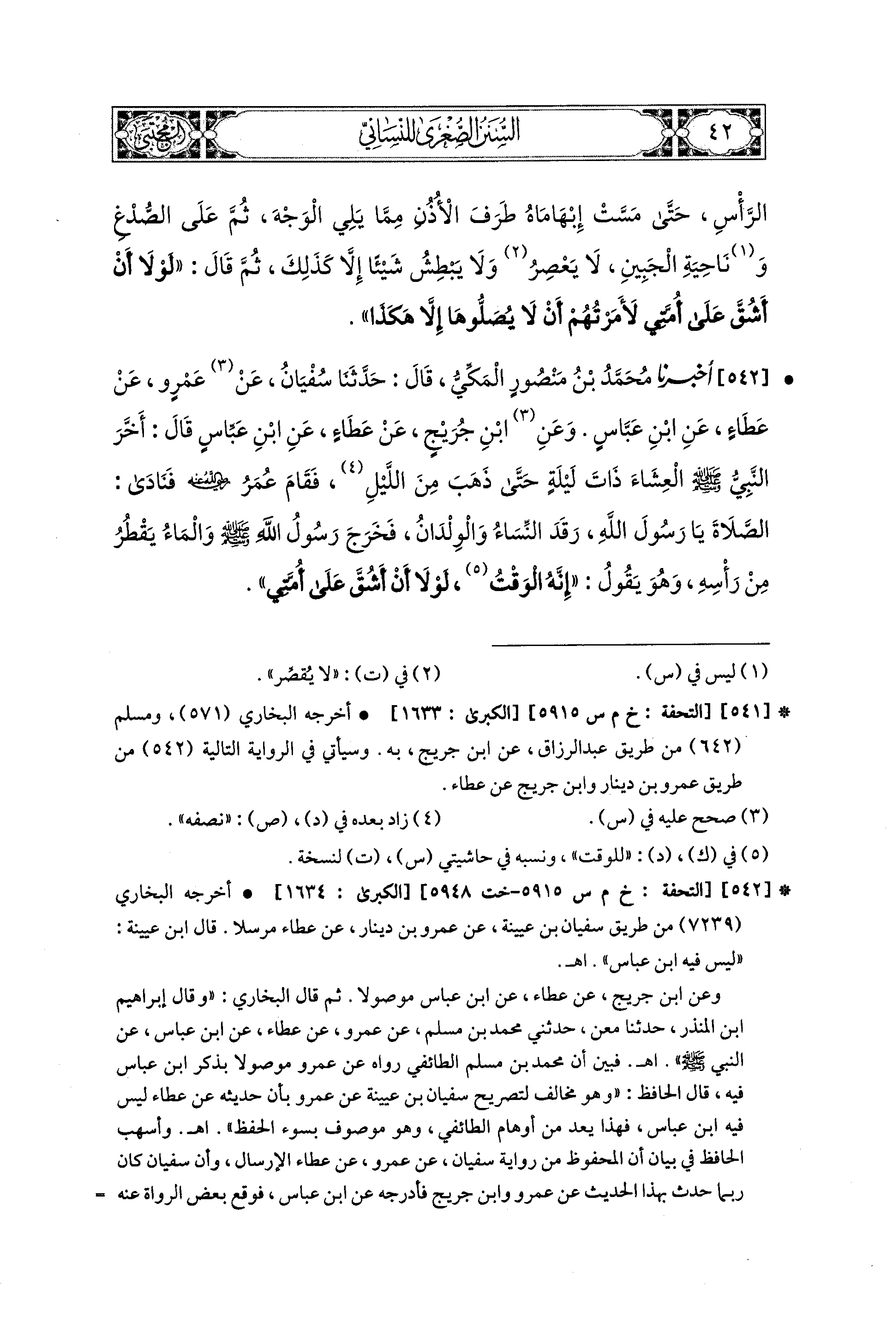 542- أَخبَرنا مُحَمد بنُ مَنْصُورٍ المَكِّيُّ، قال: حَدثنا سُفيَانُ، عَن عَمْرٍو، عَن عَطَاءٍ، عَنِ ابنِ عَبَّاسٍ، وَعَنِ ابنِ جُرَيْجٍ، عَن عَطَاءٍ، عَنِ ابنِ عَبَّاسٍ، قَالَ: أَخَّرَ النَّبيُّ صَلى الله عَليه وسَلم العِشَاء ذَاتَ لَيْلَةٍ حَتَّى ذَهَبَ مِنَ اللَّيلِ، فَقَامَ عُمَرُ رَضِيَ اللهُ عَنهُ فَنَادَى: الصَّلاَةَ يَا رَسُولَ اللهِ، رَقَدَ النِّسَاءُ وَالوِلْدَانُ، فَخَرَجَ رَسُولُ اللهِ صَلى الله عَليه وسَلم وَالمَاءُ يَقْطُرُ مِنْ رَأْسِهِ وَهُوَ يَقُولُ: إِنَّهُ الوَقْتُ، لَوْلاَ أَنْ أَشُقَّ عَلَى أُمَّتِي.