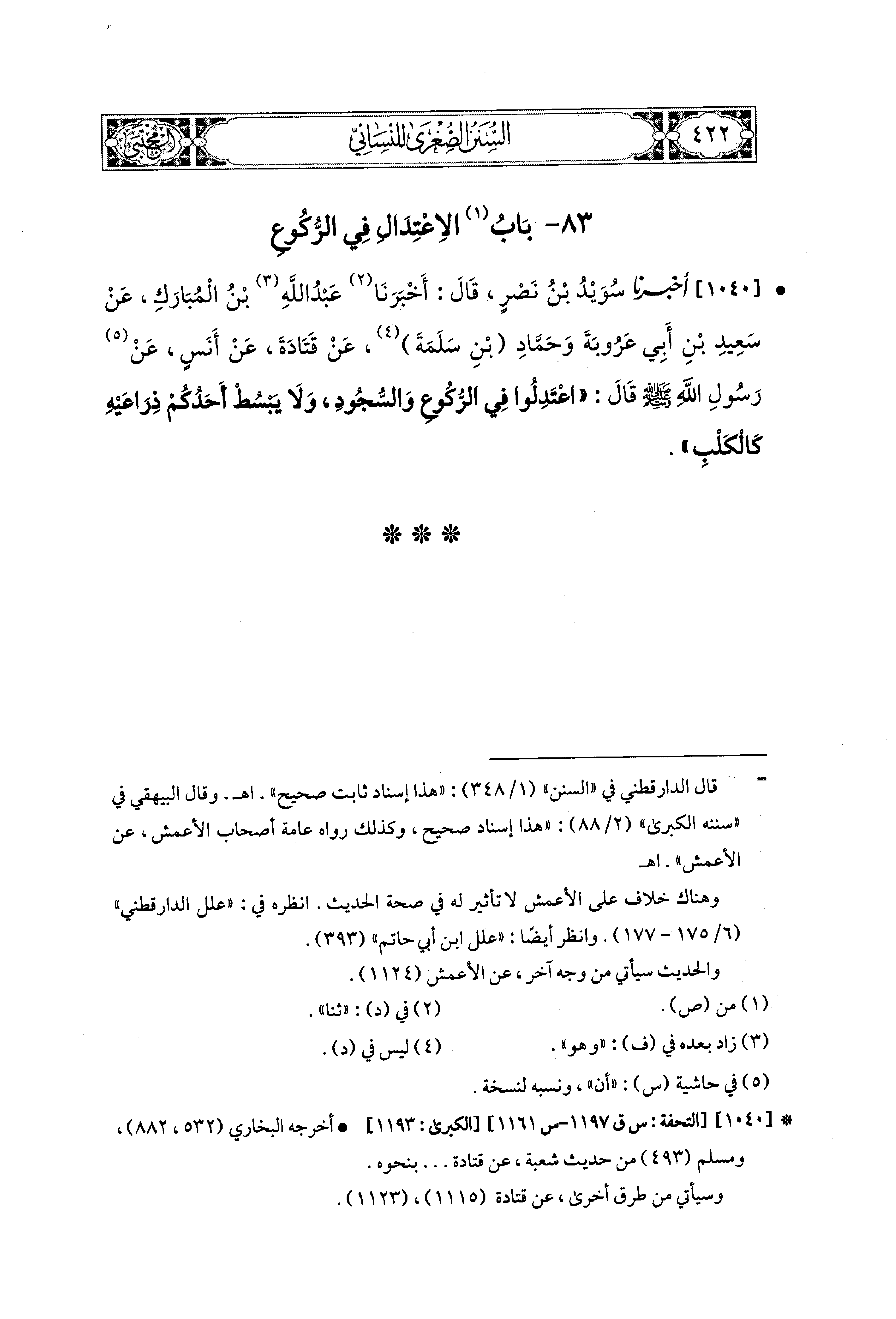 1040- أَخبَرنا سُوَيْدُ بنُ نَصْرٍ، قَالَ: أَخبَرنا عَبدُ اللهِ بنُ المُبَارَكِ، عَن سَعيدِ بْنِ أَبي عَرُوبَةَ، وَحَمَّادُ بنُ سَلَمَةَ، عَن قَتَادَةَ، عَن أَنَسٍ، عَن رَسُولِ اللهِ صَلى الله عَليه وسَلم قَالَ: اعْتَدِلُوا فِي الرُّكُوعِ وَالسُّجُودِ، وَلاَ يَبْسُطْ أَحَدُكُمْ ذِرَاعَيْهِ كَالكَلْبِ.