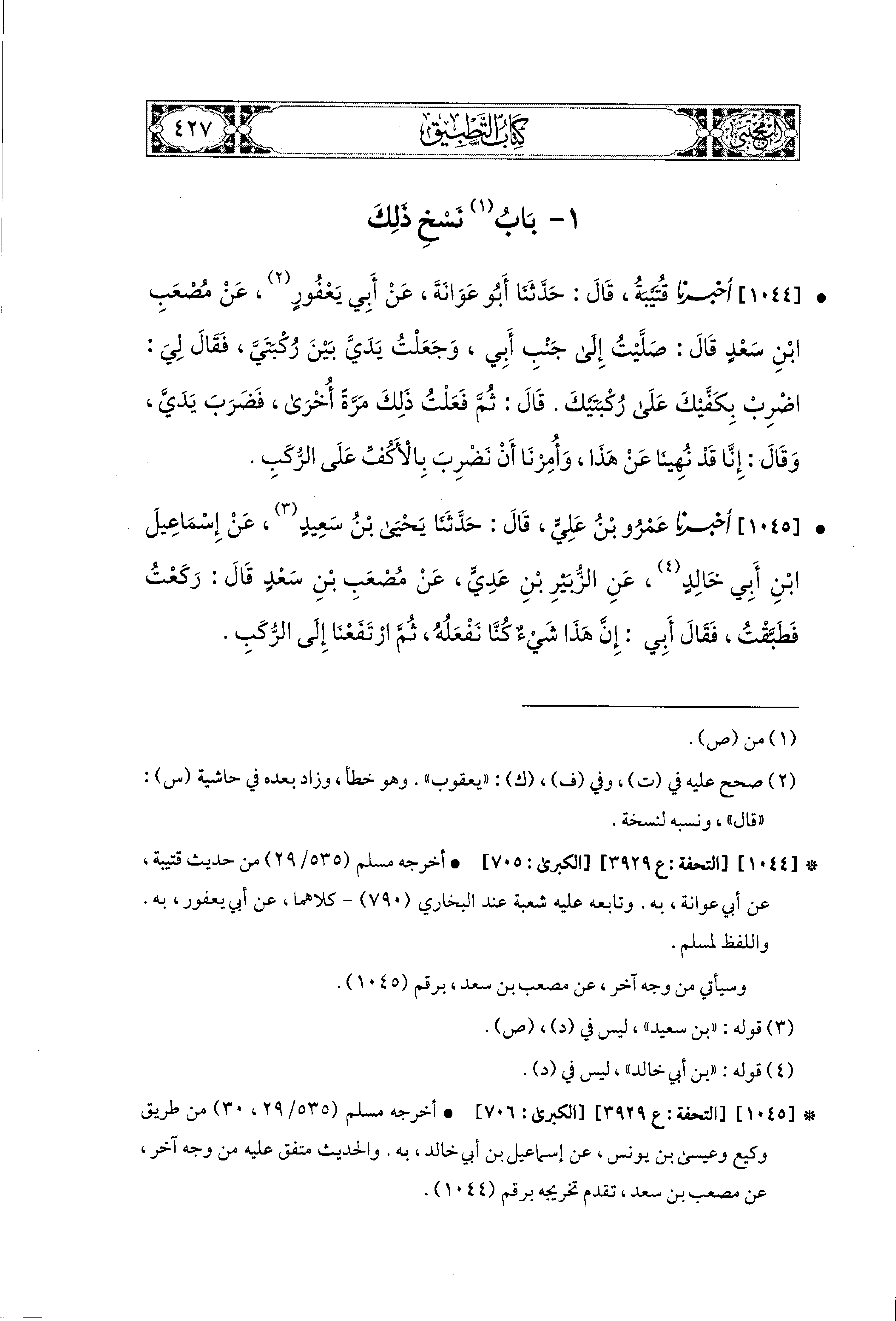 1044- أَخبَرنا قُتَيبَةُ، قال: حَدثنا أَبو عَوَانَةَ، عَن أَبي يَعْفُورٍ، عَن مُصْعَبِ بْنِ سَعْدٍ، قَالَ: صَلَّيْتُ إِلَى جَنْبِ أَبي وَجَعَلْتُ يَدَيَّ بَيْنَ رُكْبَتَيَّ، فَقَالَ لِيَ: اضْرِبْ بِكَفَّيْكَ عَلَى رُكْبَتَيْكَ، قَالَ: ثُمَّ فَعَلْتُ ذَلِكَ مَرَّةً أُخْرَى، فَضَرَبَ يَدِي، وَقَالَ: إِنَّا قَدْ نُهِينَا عَن هَذَا، وَأُمِرْنَا أَنْ نَضْرِبَ بِالأَكُفِّ عَلَى الرُّكَبِ.